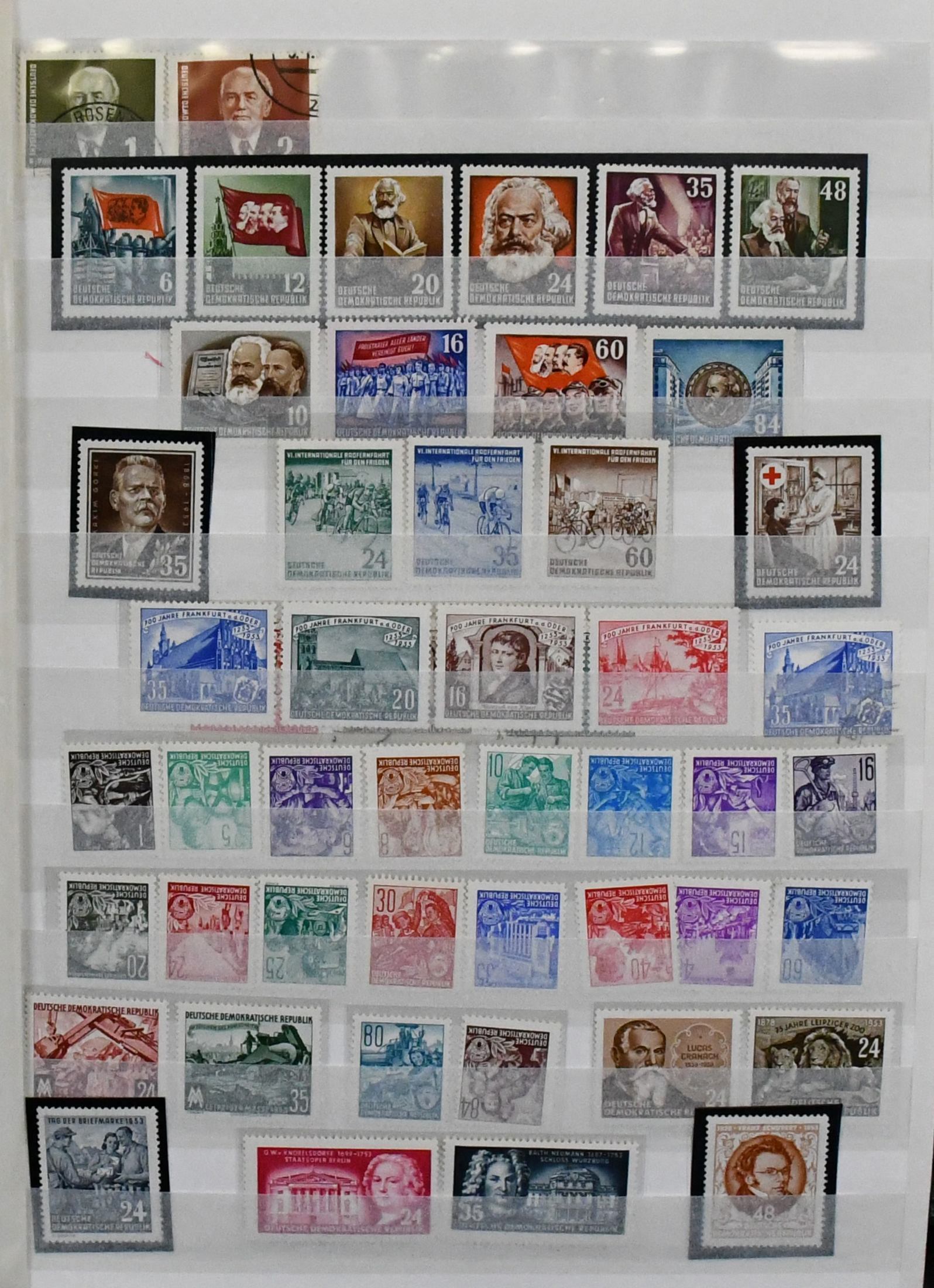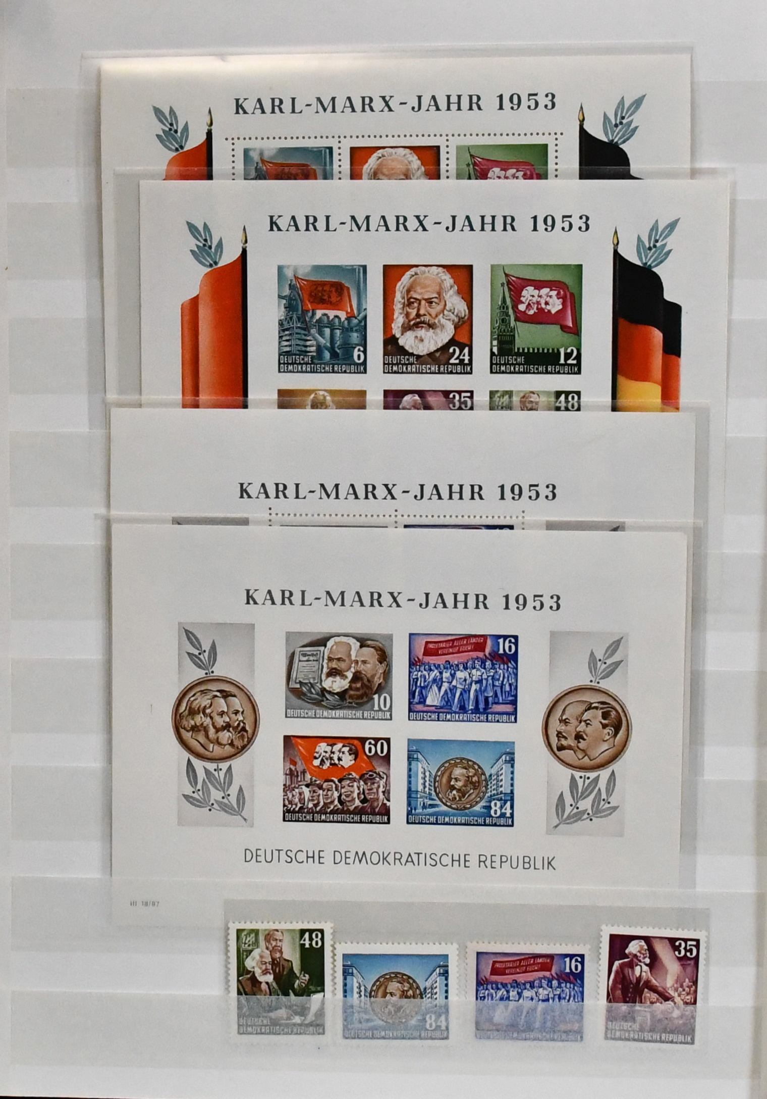 DDR, 1953/1990, postfrische (einige Werte 5-Jahresplan ungebr., Bl. 11 gest.) komplette Slg. inkl. allen vier Marx-Blöcken, Bl. 10, Bl. 12/15 usw., in zwei dicken E-Büchern. Mi. 3800,-
