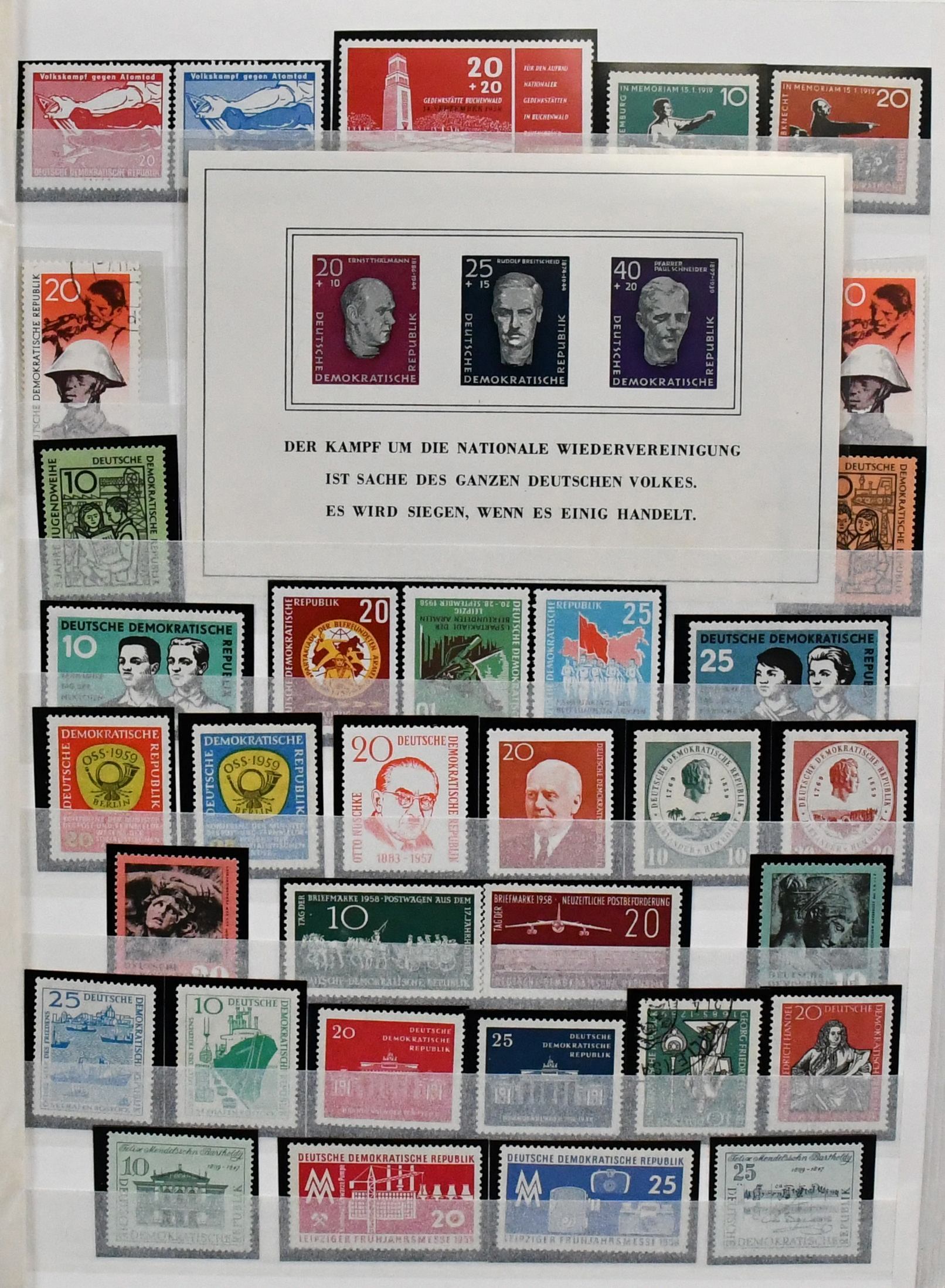 DDR, 1949-1990, fast kpl. Slg. in vier Vordruckalben (ohne Marx-Blöcke), anfangs gestempelt, ab ca. 1954 postfrisch, inkl. Messe-Ausgaben, Bl. 7, Chinesen, Akademie etc., dazu etliche Extras mit Zus.-Dr.-Bogen, Dienst usw.