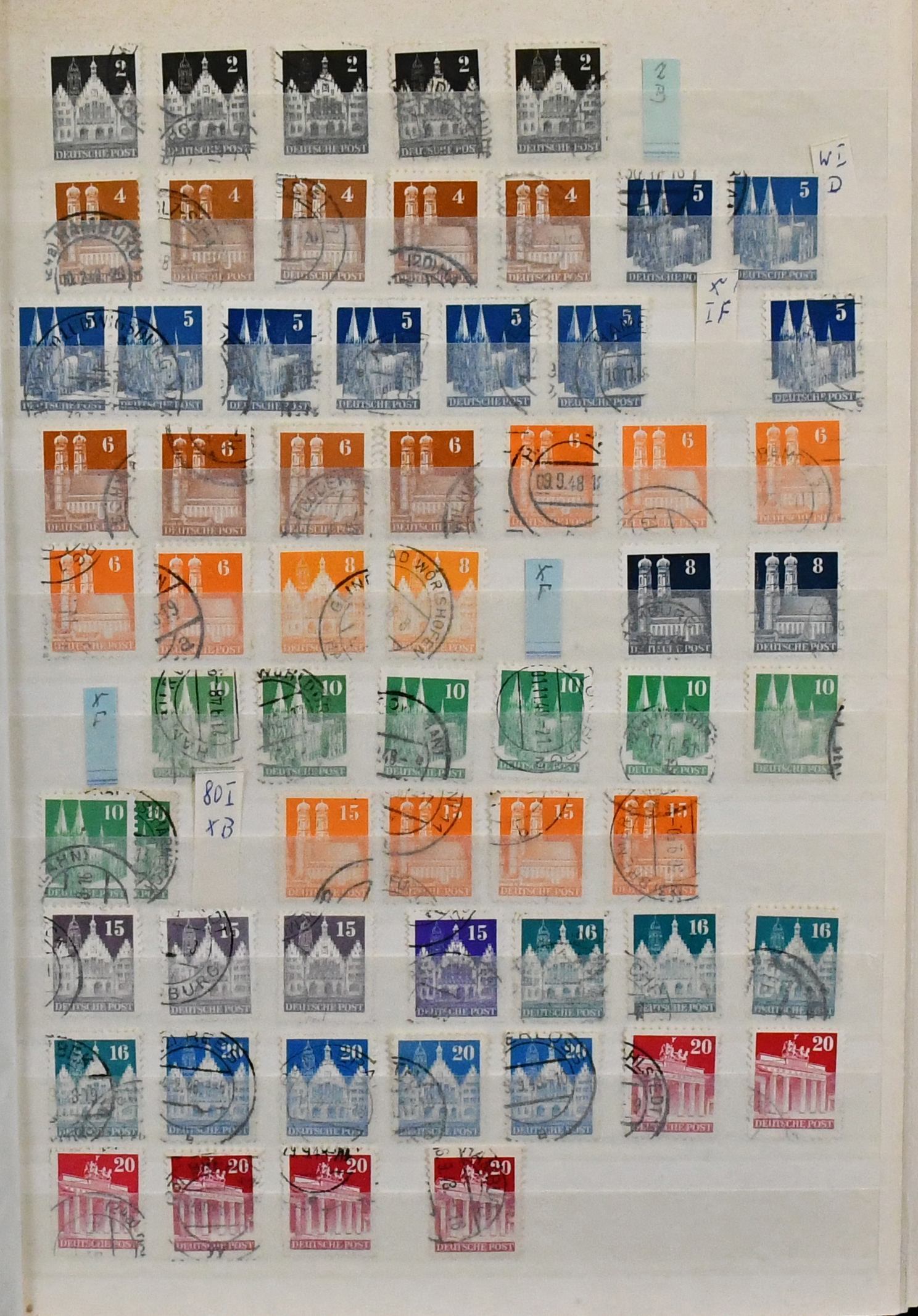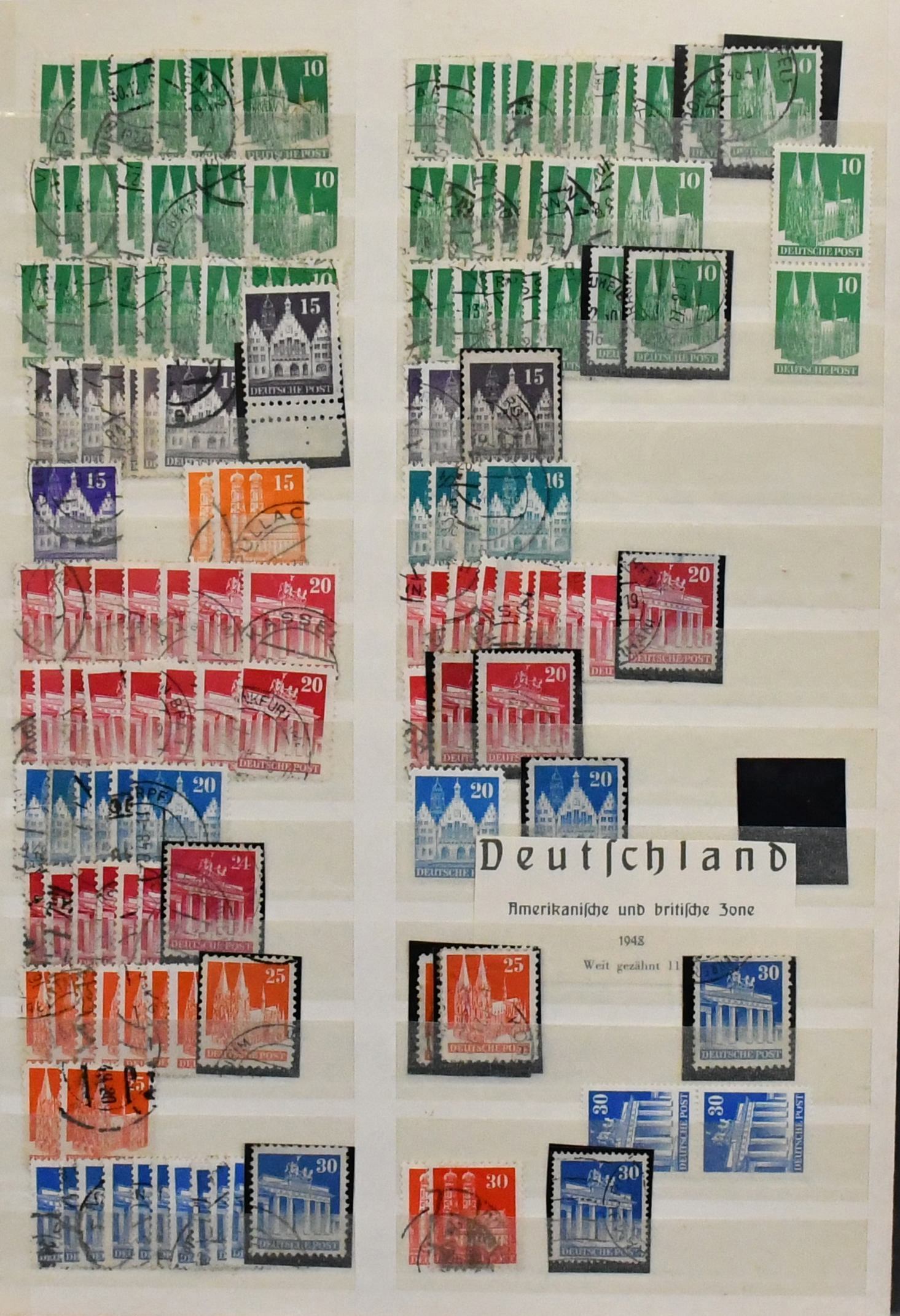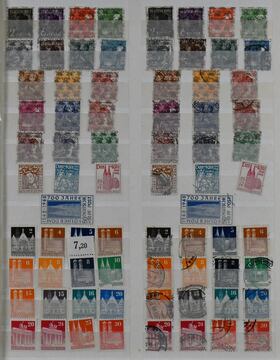 Bizone, Bauten, Partie von etwa 4000 gestempelten Werten, sortenreich, alle nach Typen, Zähnungen usw. spezialisiert, auf Steckkarten in einer Hawid-Kassette