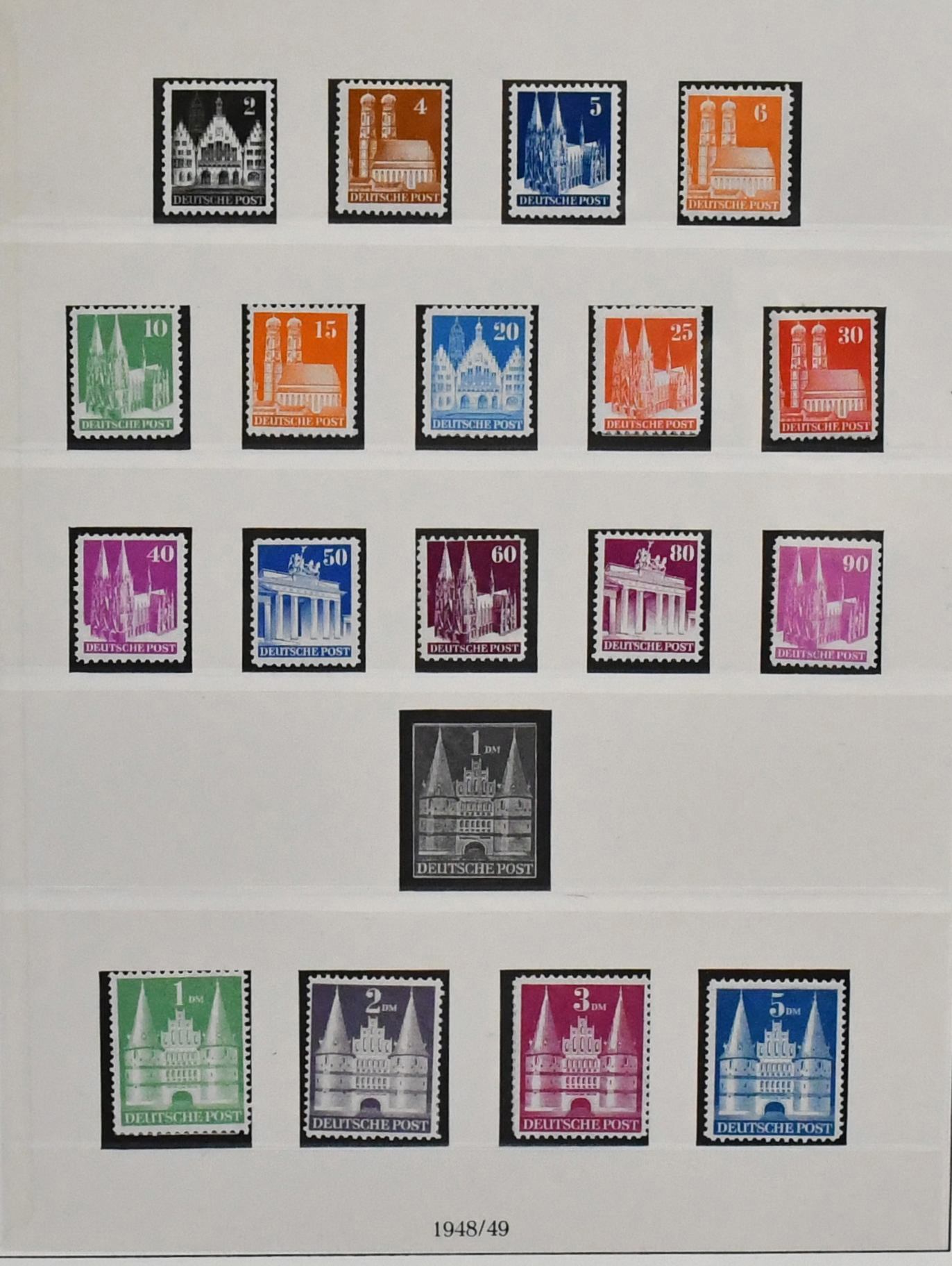 Bizone, 1945/49, fast kpl. Slg. ab Nr. 1/35, mit Nr. 36/51I/II, Bauten überkpl., Bl. 1 postfr. (Mi. 140,-) usw., auf Leuchtturm-Vordrucken. Michel fast vierstellig