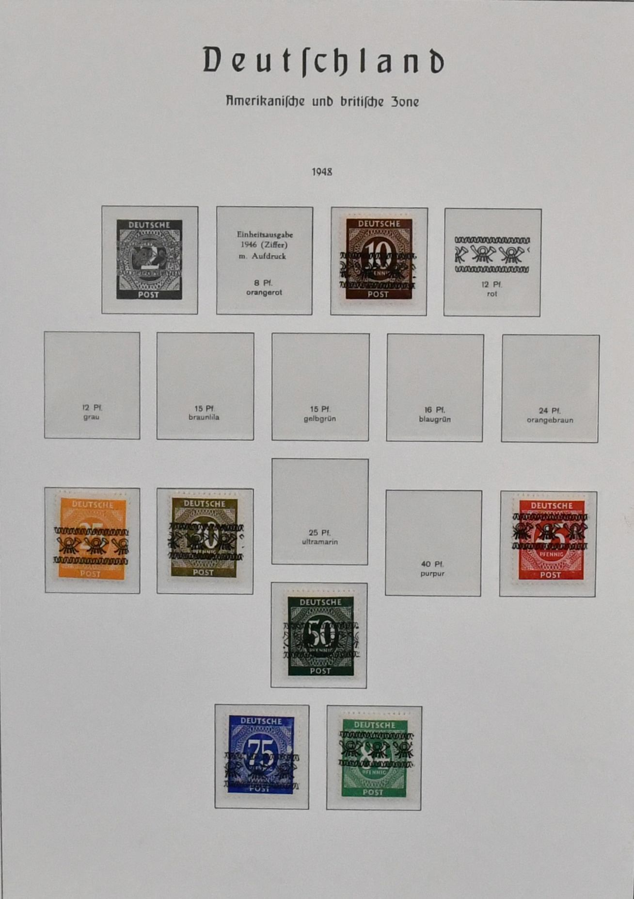 Bizone, bis auf die Ziffern-Band-/Netzaufdrucke (die enthaltenen sind falsch und unbewertet) kpl. Slg., oft postfrisch, ganz wenig, z.B. Nr. 49IIb, ungebraucht, u.a. mit Bauten eg/wg (hier wenige Marken gest.), einige Bauten-Abarten, alle Sondermarken, Bl. 1 SST. Mi. 1680,-
