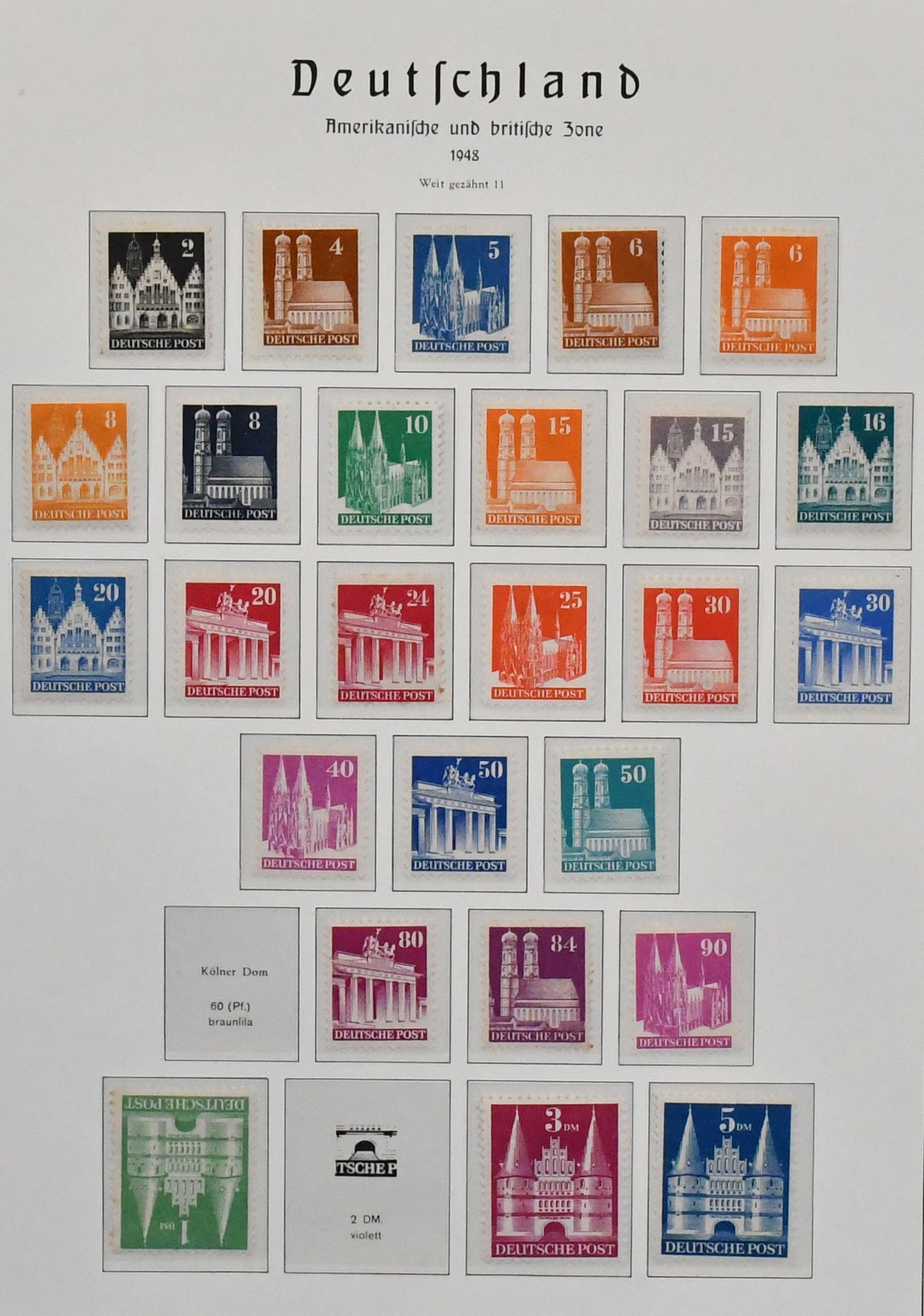 Bizone, sauber ungebrauchte Slg. mit AM-Post kpl., teils zusätzlich Unter-Nr. wie Nr. 34A, C, D, 36-51I/II, Bauten eg/wg, sowie die Sonderausgaben inkl. Bl. 1