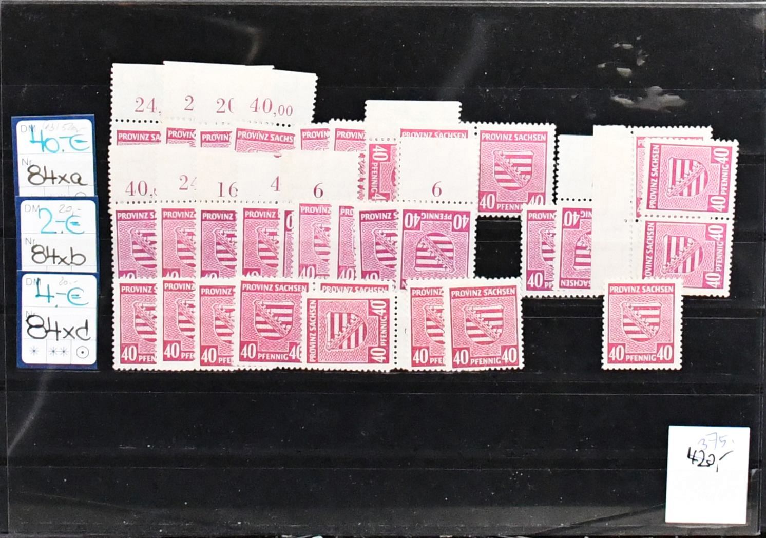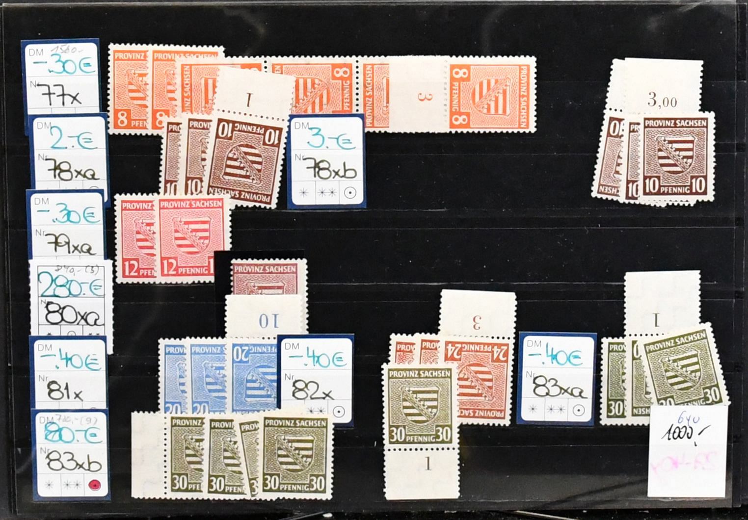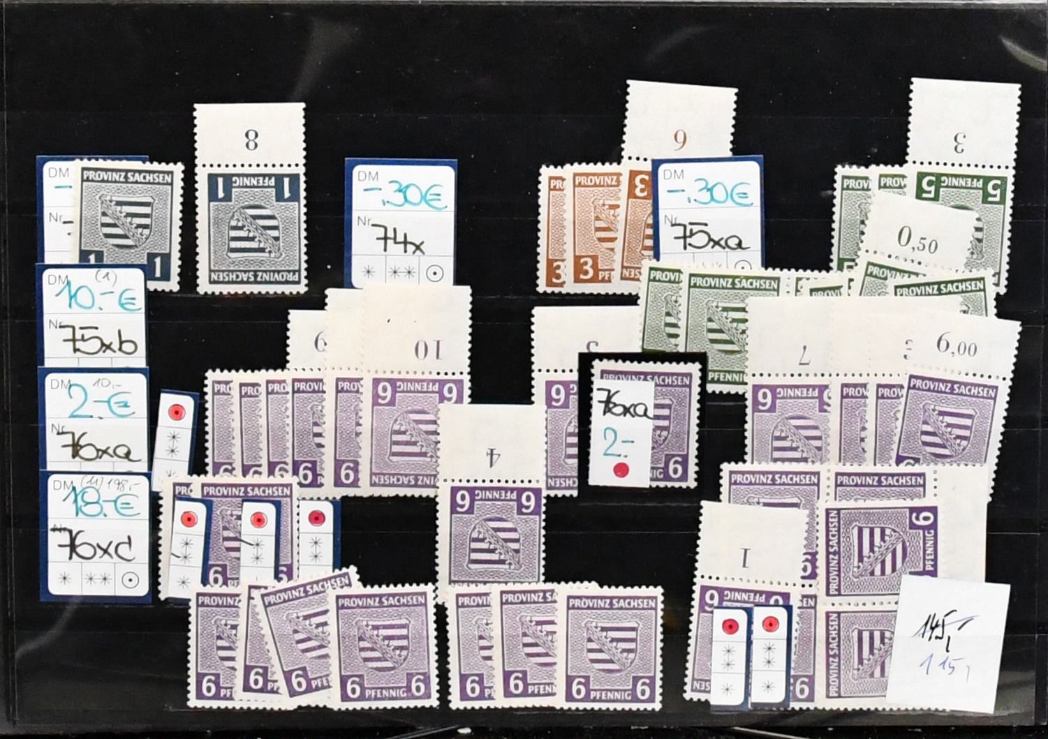 SBZ, Provinz Sachsen, postfr. Zusammenstellung ex Nr. 73/84, dabei Nr. 76Xc gepr., 80X best. gepr. Ströh BPP (Mi. 280,-), 83Xb per fünf (Mi. 350,-), je gepr., 84Xa per neun, je gepr. (360,-), usw. Vierstelliger KW