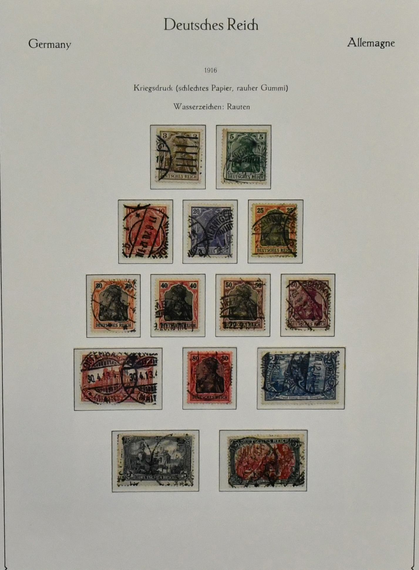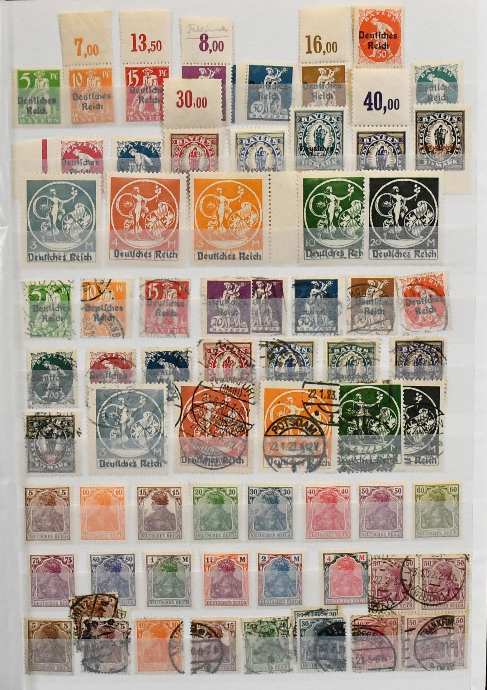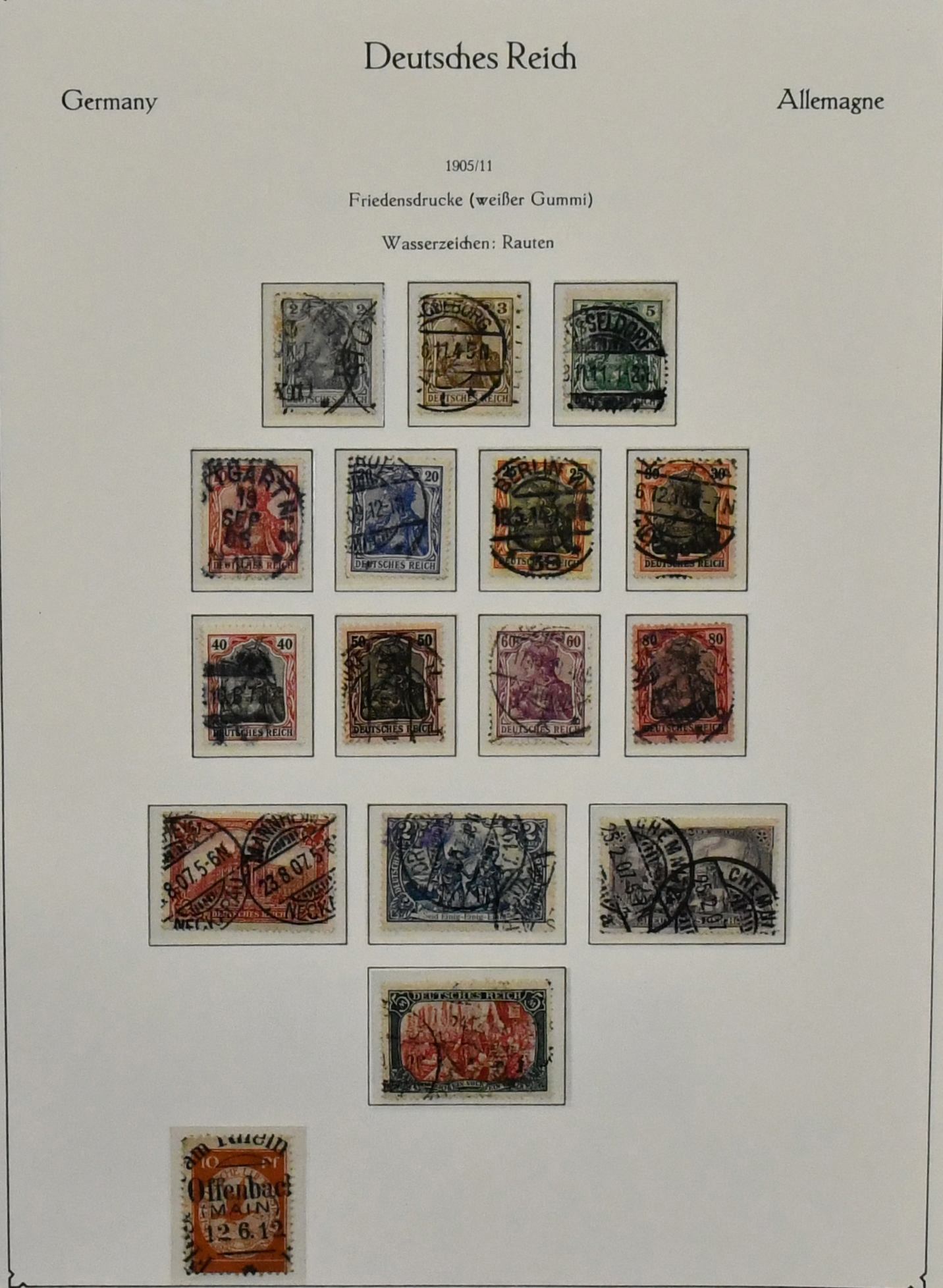Deutsches Reich, 1872-1923, umfangreiche, gestempelte, etwas untersch. Slg. mit Brustschilden ab Nr. 1/6, 7/10, 14/15, 16/22, 27/28 (Stempel zweifelhaft), Pfennig/e, Krone/Adler, Germania mit etlichen geprüften Werten, Infla ebenfalls mit geprüften, aber auch dubiosen Werten, dito Dienst, interessante Sammlung