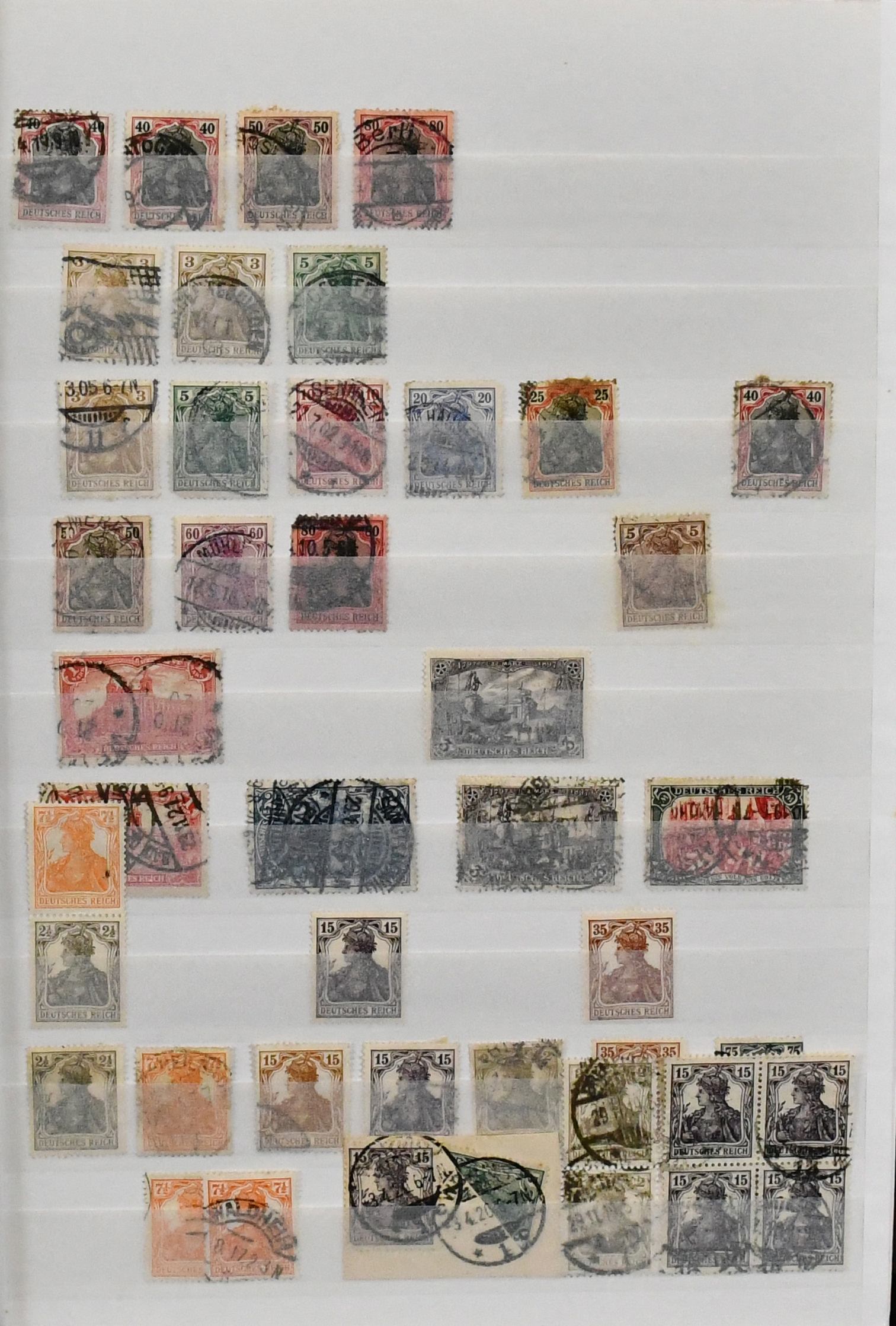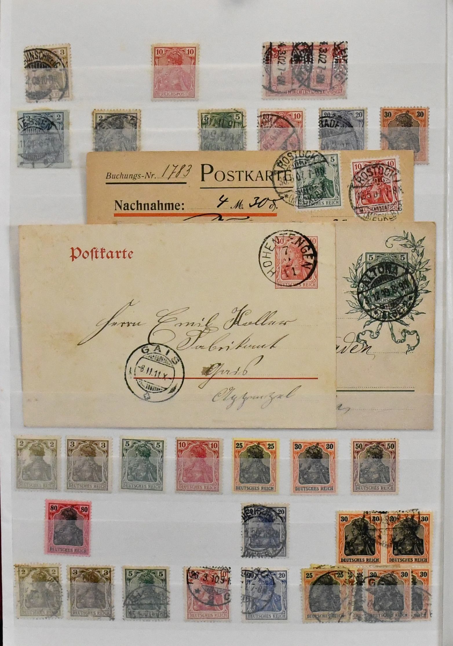 Deutsches Reich, 1872-1945, Bestand von ca. 400 Belegen ab den Brustschilden, dabei u.a. viele Germania-Frankaturen, Infla, Ansichtskarten, mit Dienstmarken frankierte Belege, Propaganda-Karten III. Reich usw., ferner einige Steckkarten mit Marken, u.a. etwas Kolonien, Abstimmungsgebiete etc.