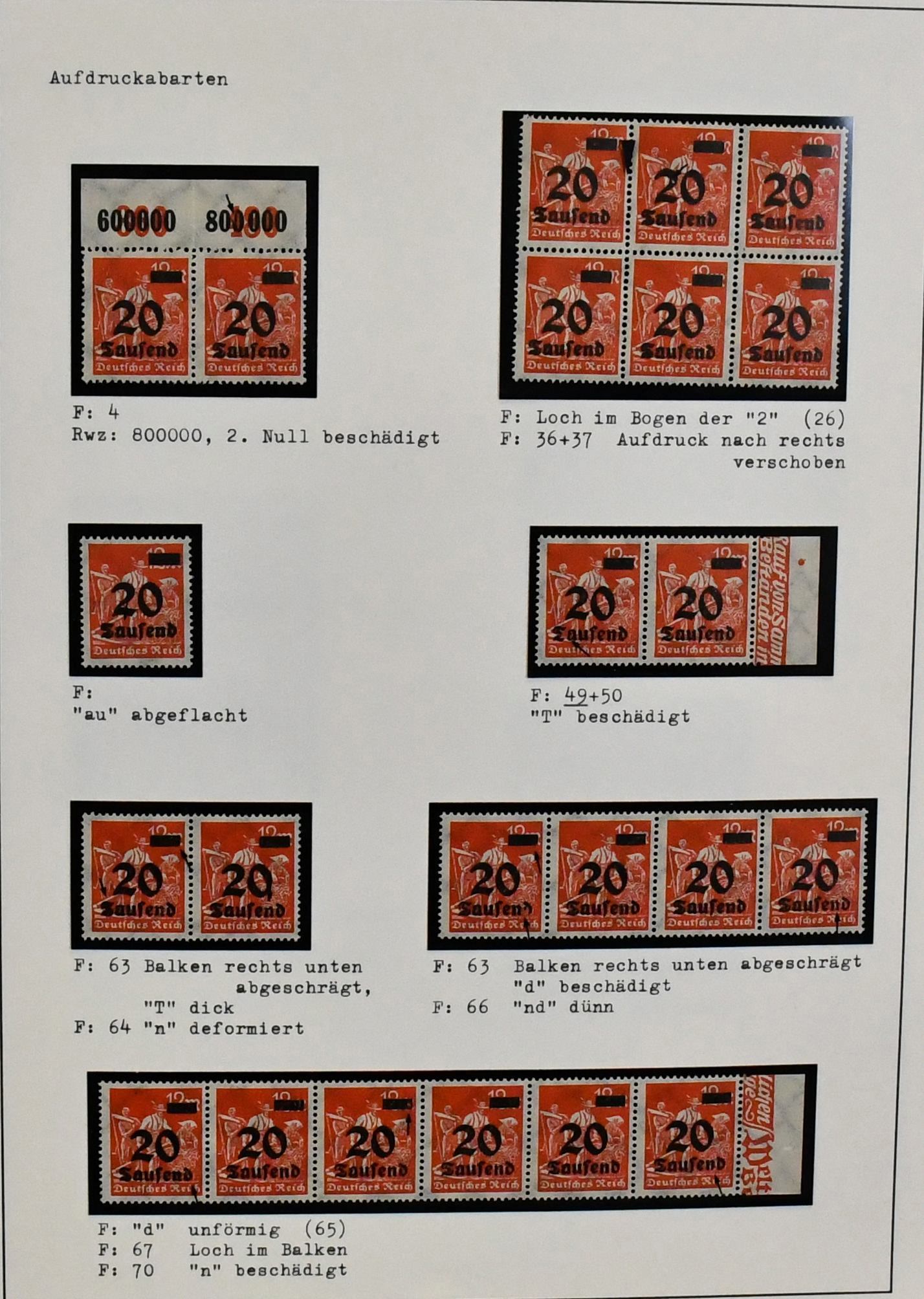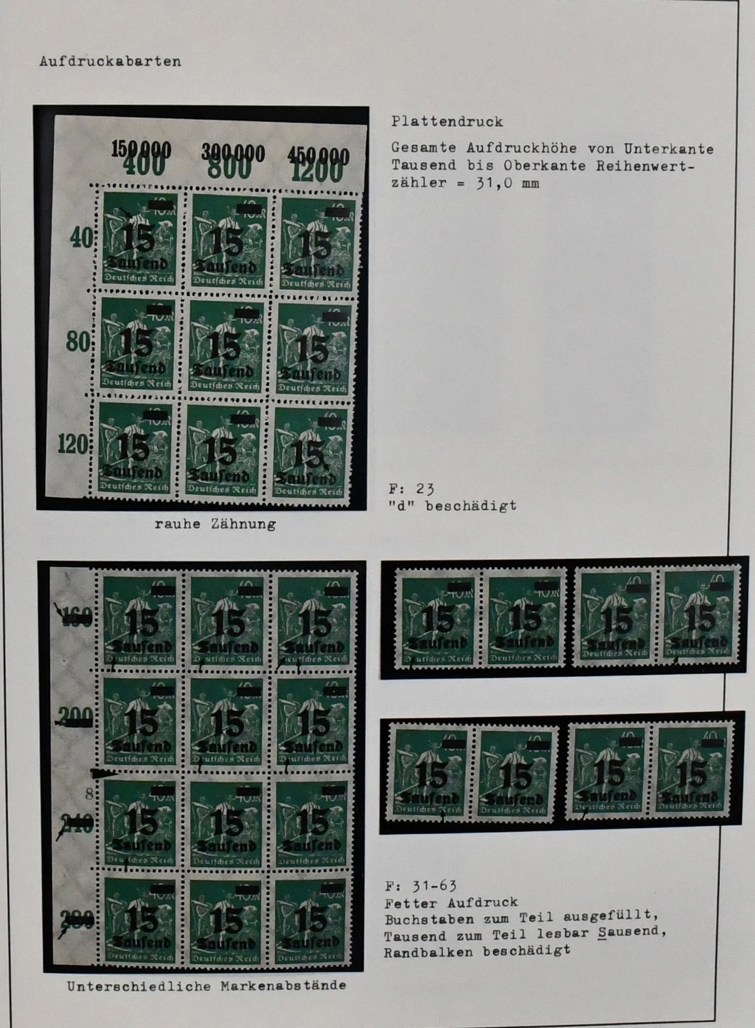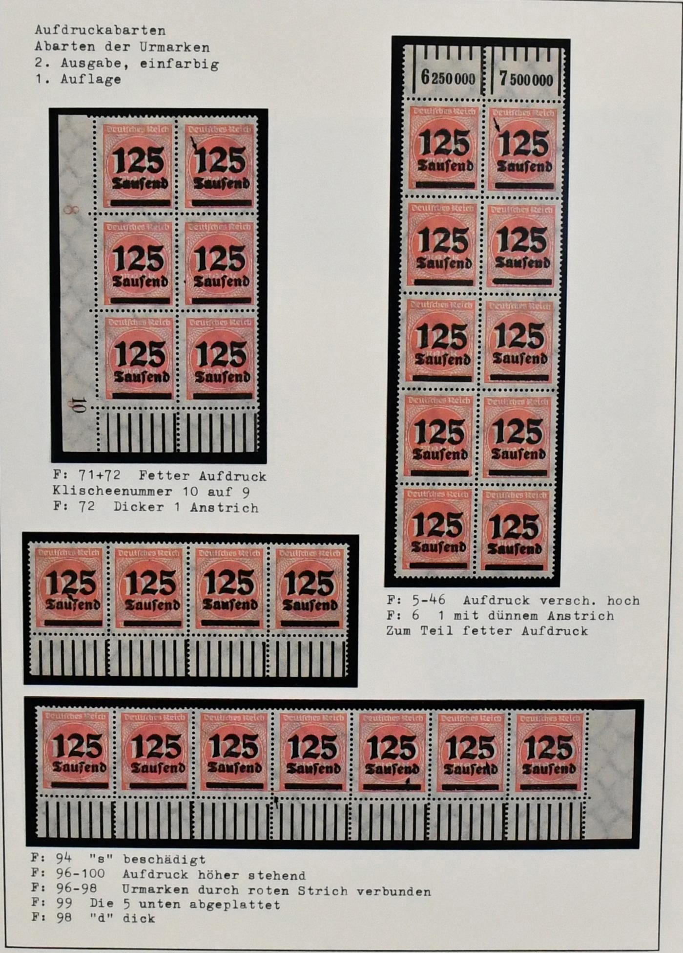 Deutsches Reich, Infla-Spezialsammlung im Leuchtturm-Ringbinder, nur aus Nr. 277-300, Aufdrucke, hauptsächlich postfrisch, mit vielen Randstücken, u.a. besseren Oberrändern, teils gepr. Farben, Besonderheiten mit HAN, Papieren, Gummisorten, versch. Drucken u.v.m. Mi. 3000,-