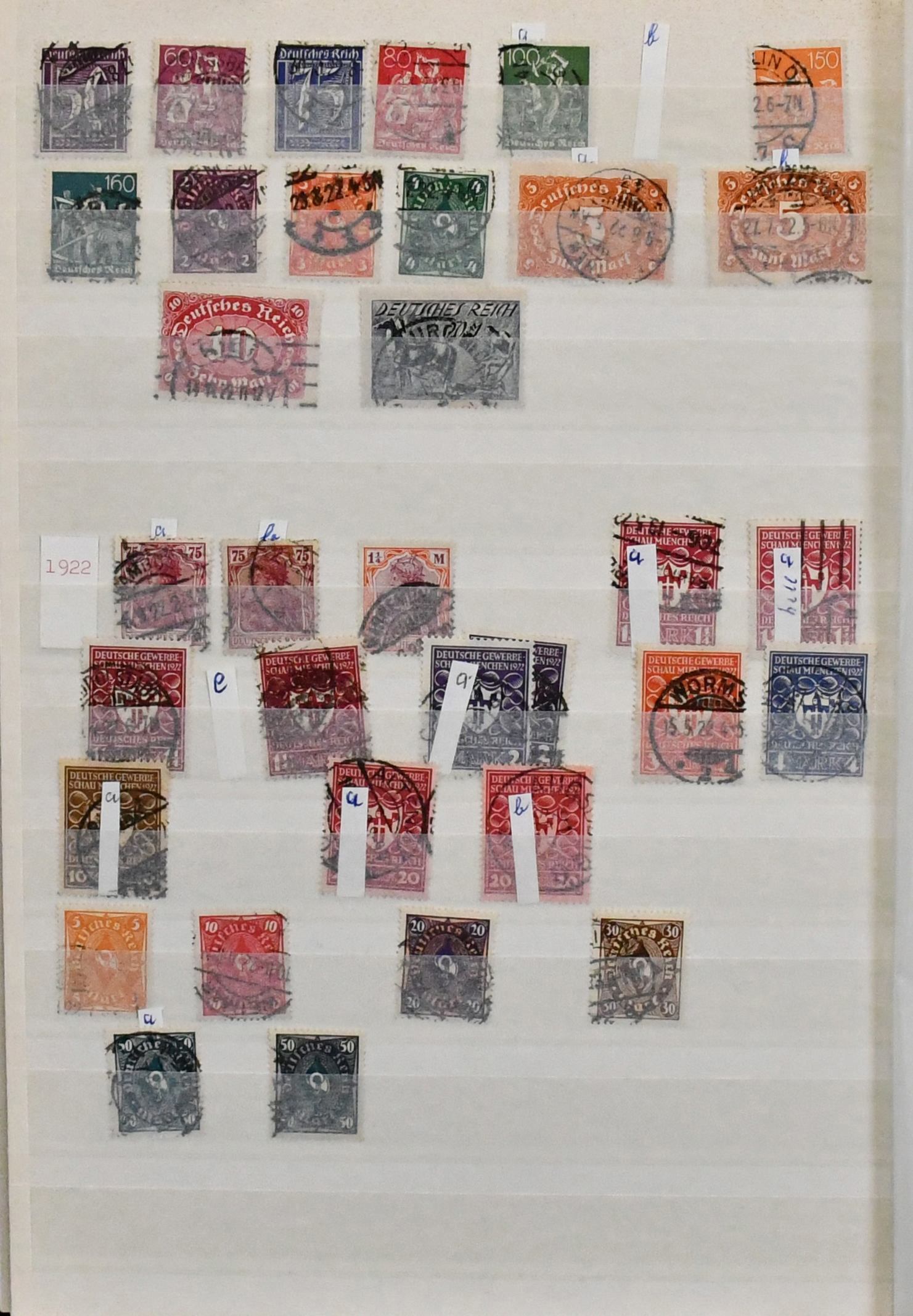 Deutsches Reich, 1919-1921, hauptsächlich gestempelte, lagerähnliche Sammlung mit ca. 5000 Werten, ab Kriegsgeschädigte, Nationalversammlung, Abschied mit gepr. Mark-Werten, Germania-Aufdrucke mit offensichtlichen Farben usw. Mi. günstigster Schnitt ca. 12500,-, sicher Fundgrube