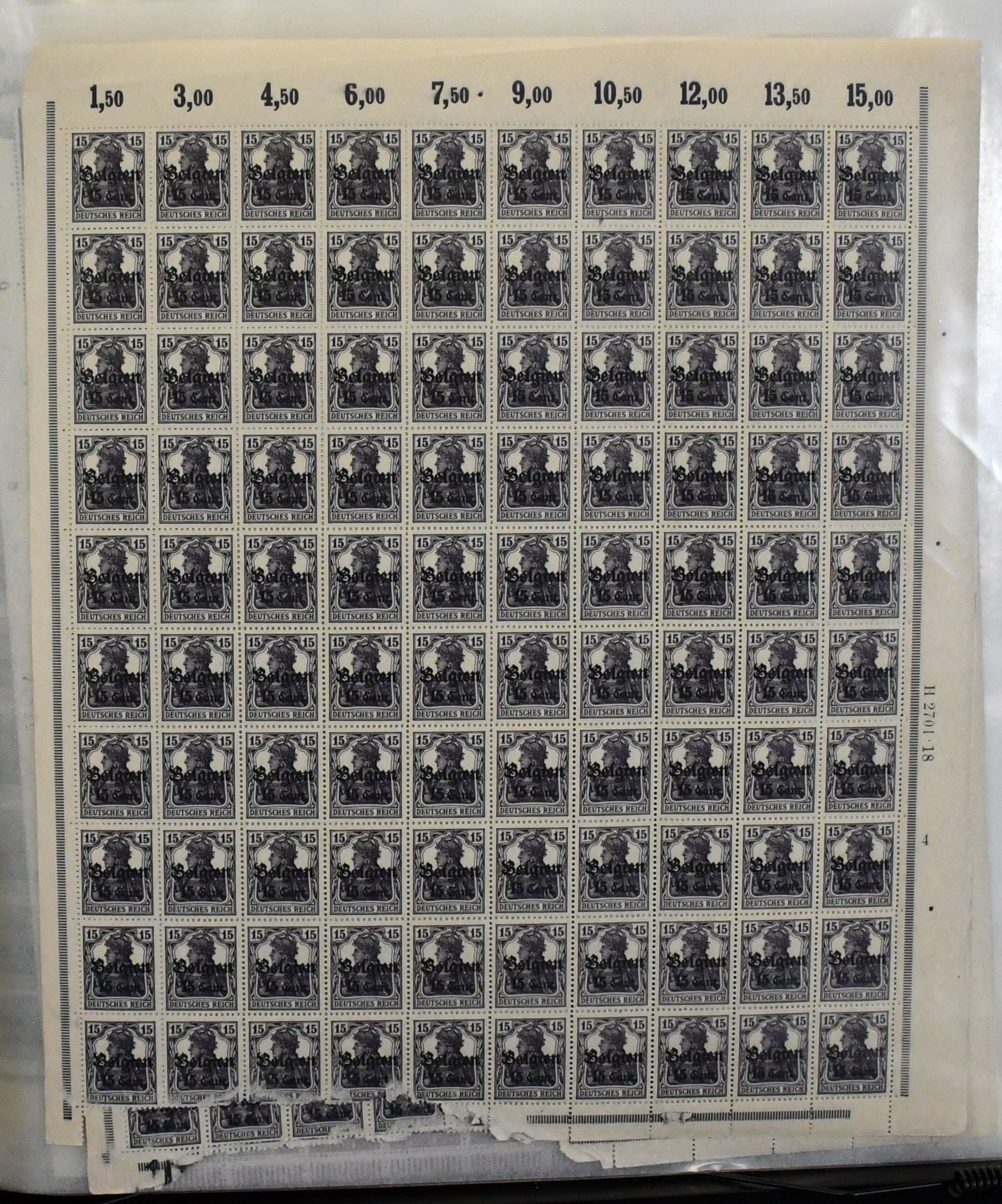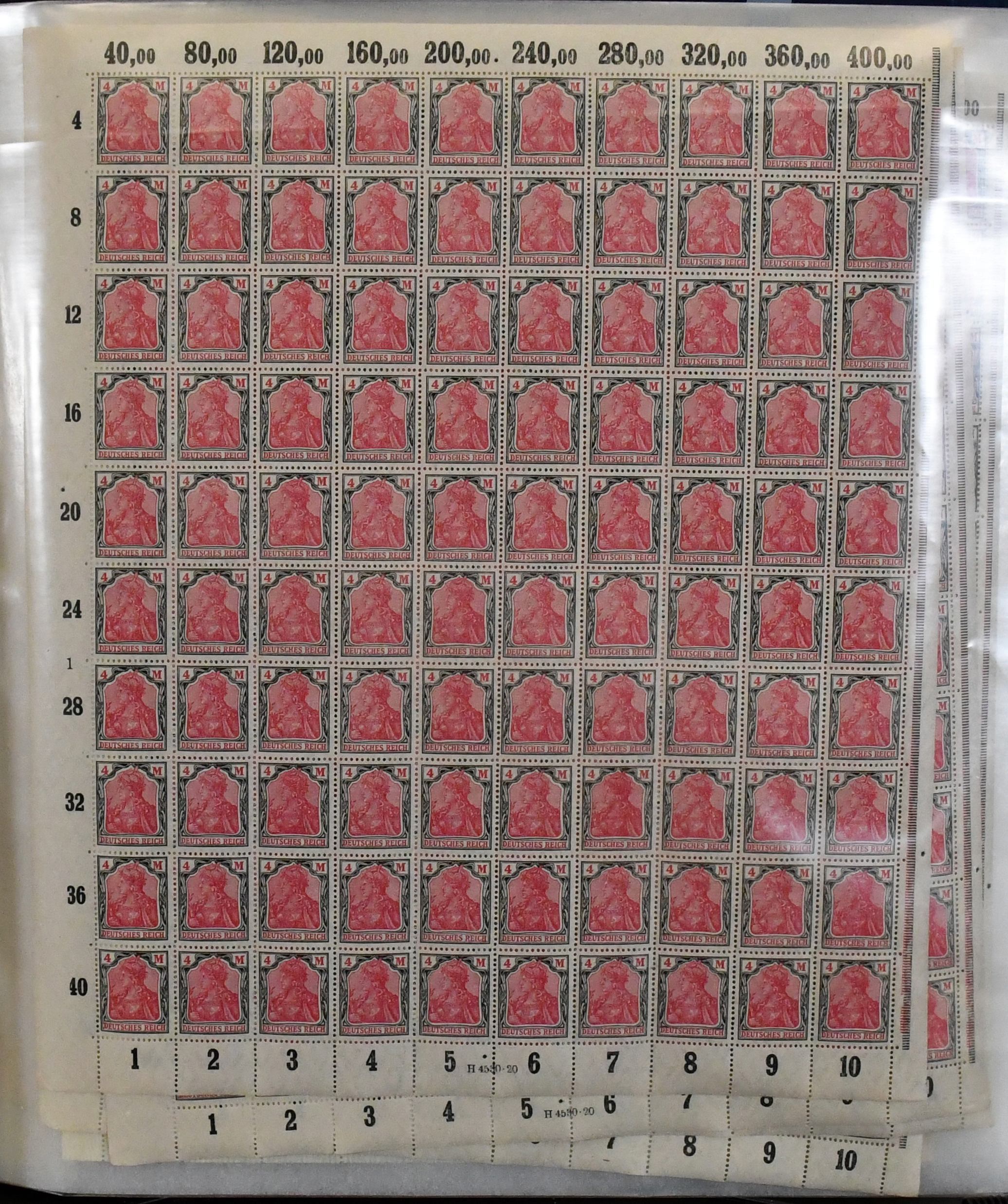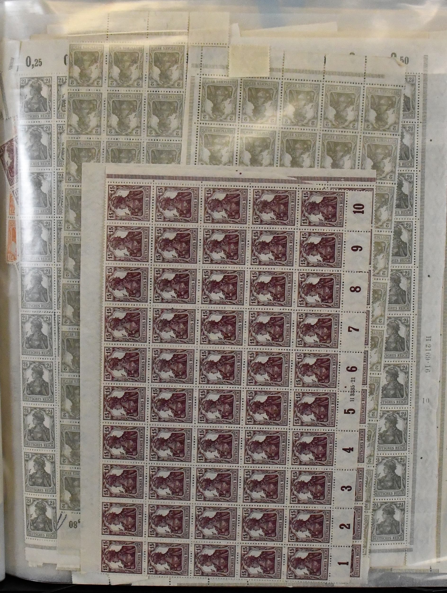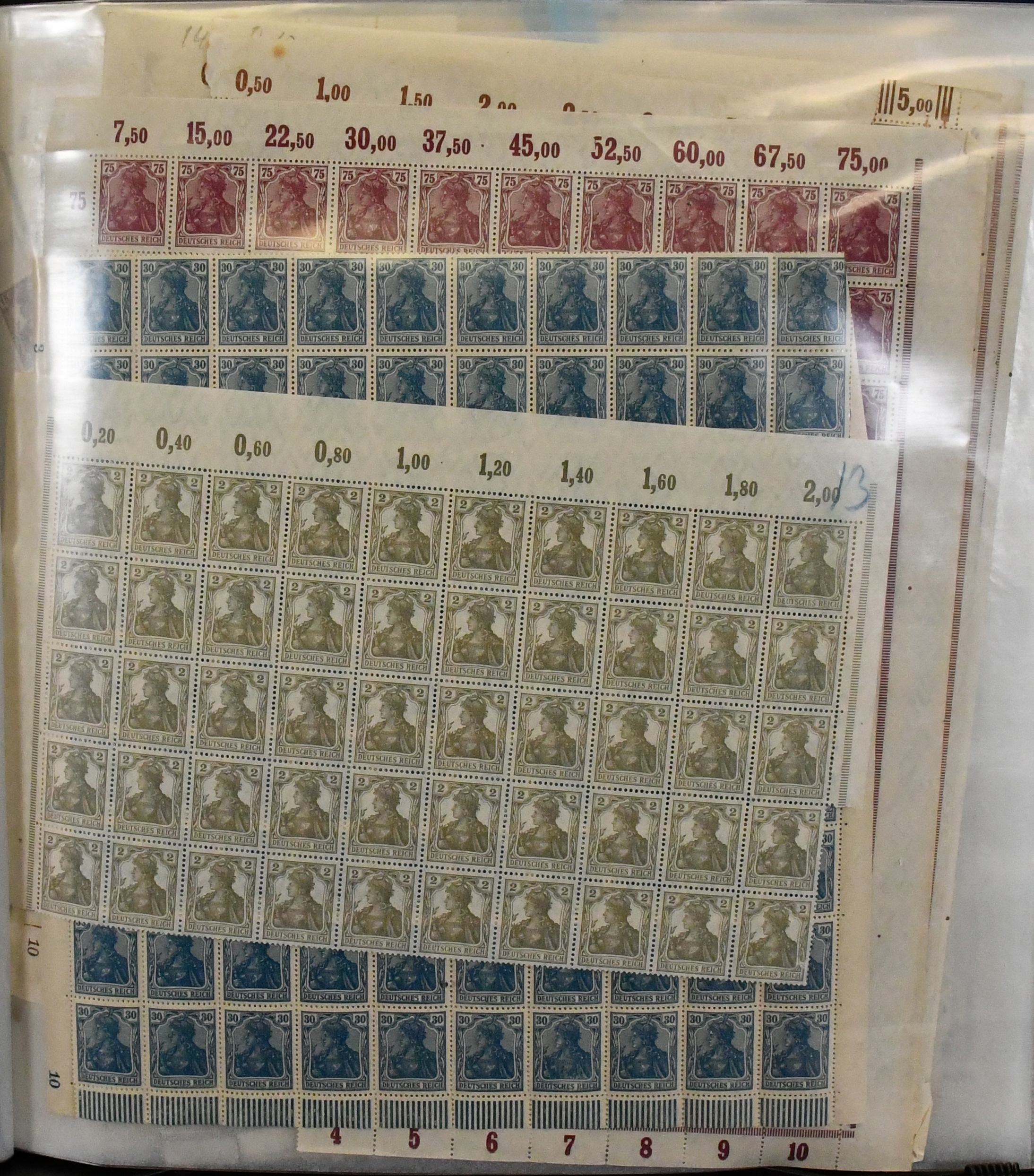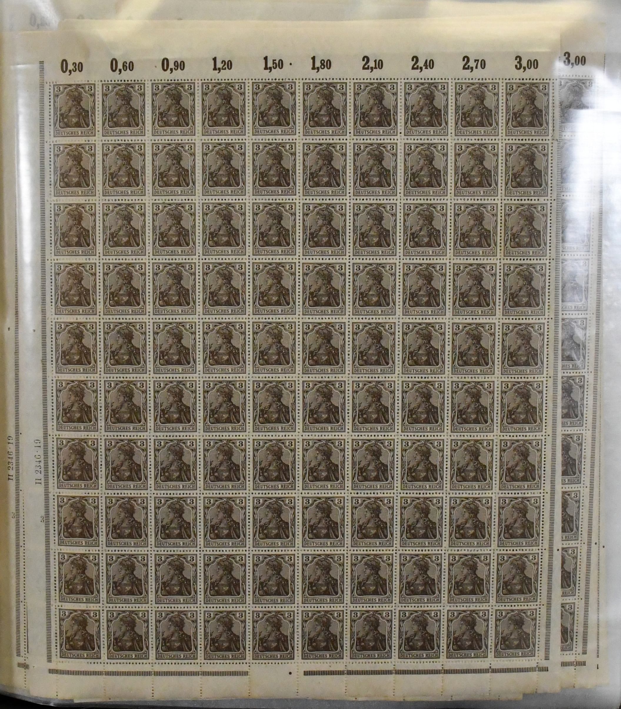 Deutsches Reich (und Bes. I. Wk.), Germania, Händlerbuch nur mit Germania-Ausgaben, oft in kpl. Bögen, auch Bogenteile bzw. Einzelwerte (z.B. zwei tadellose postfrische Nr. 69b je mit Attest), inkl. HAN-Bögen, Oberrändern etc., wahrscheinlich fünfstellige Markenanzahl, Fundgrube!