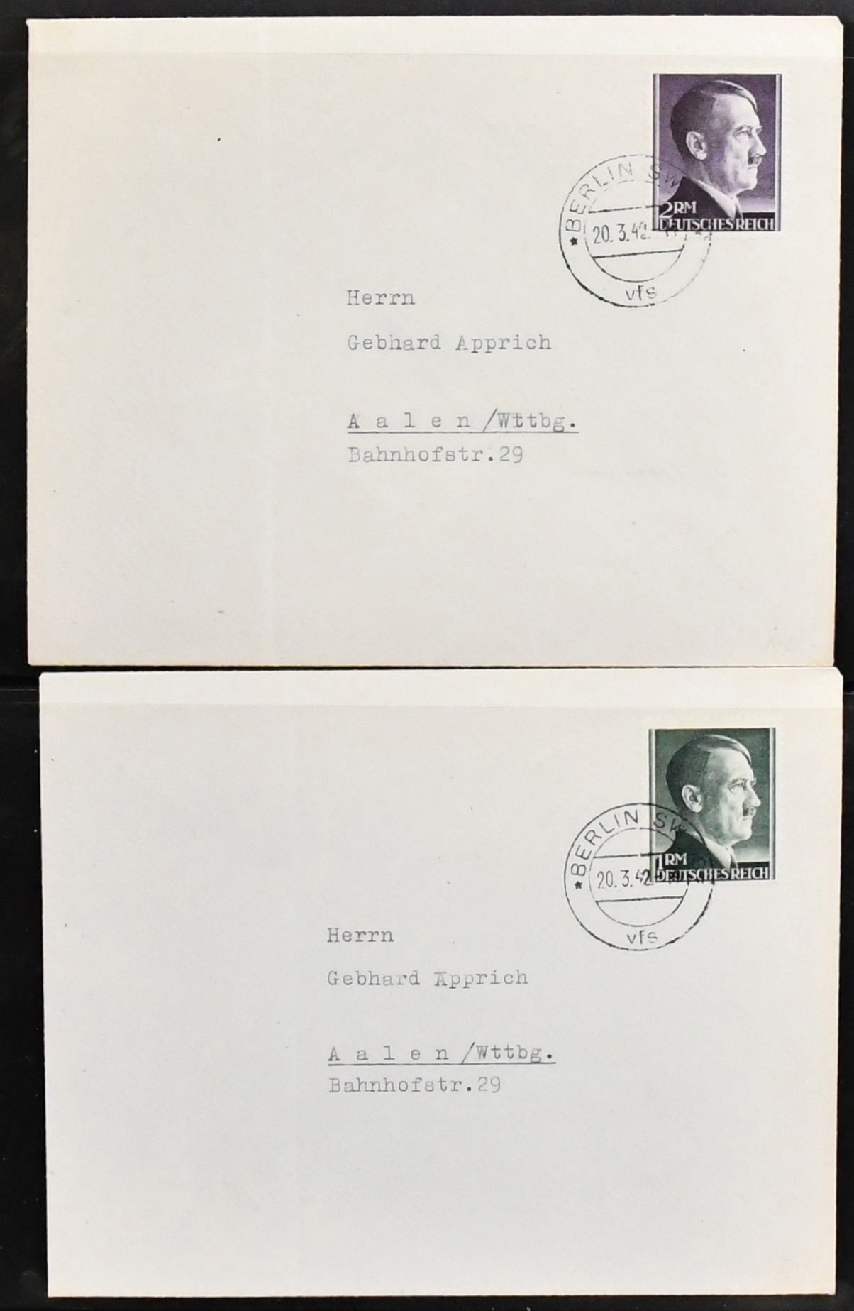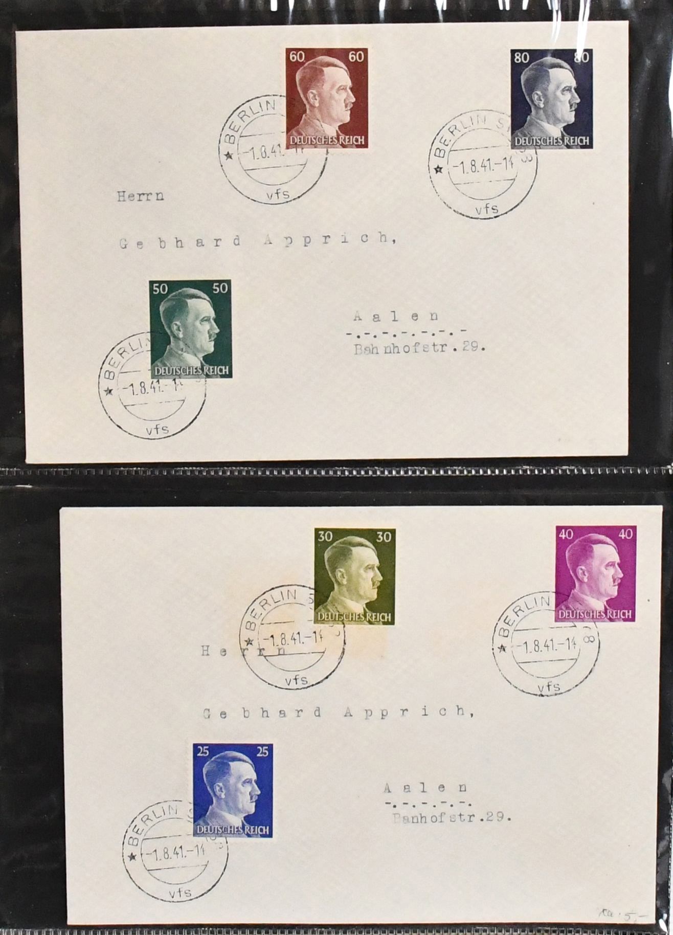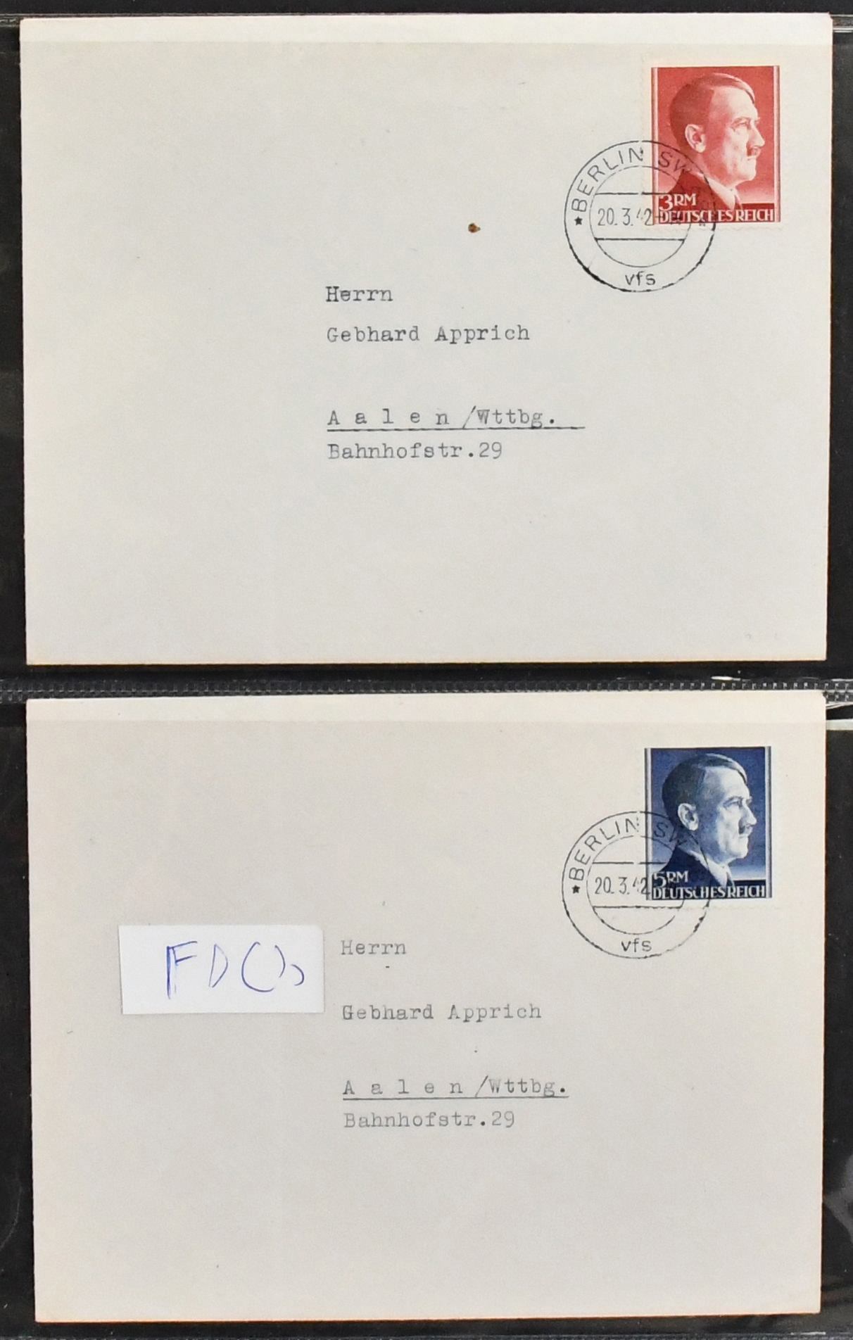 III. Reich, FDC-Partie inkl. Nr. 673-74, 750, sowie Hitler 1 Pfg. bis 5 Mk., ohne die später erschienene 42 Pfg., kpl. auf FDCs