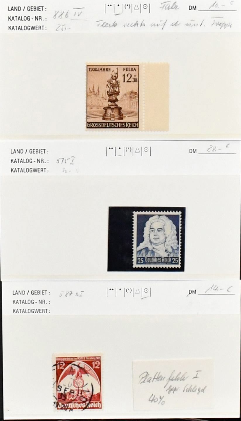 III. Reich, Partie besserer postfr. Ausgaben inkl. Nr. 575I (2, Mi. 140,-), seltener Nr. 760z (auf Kartonpapier, Michel nicht gelistet), 675-83 (100,-), 686-88 (110,-), 691-94, 698-99 teils mehrf. (320,-), 702-13(85), sowie Nr. 909-10 in VB (320,-). Ferner Nr. 538-39 ungebr. (augenscheinlich waager. Gummiriffelung?)