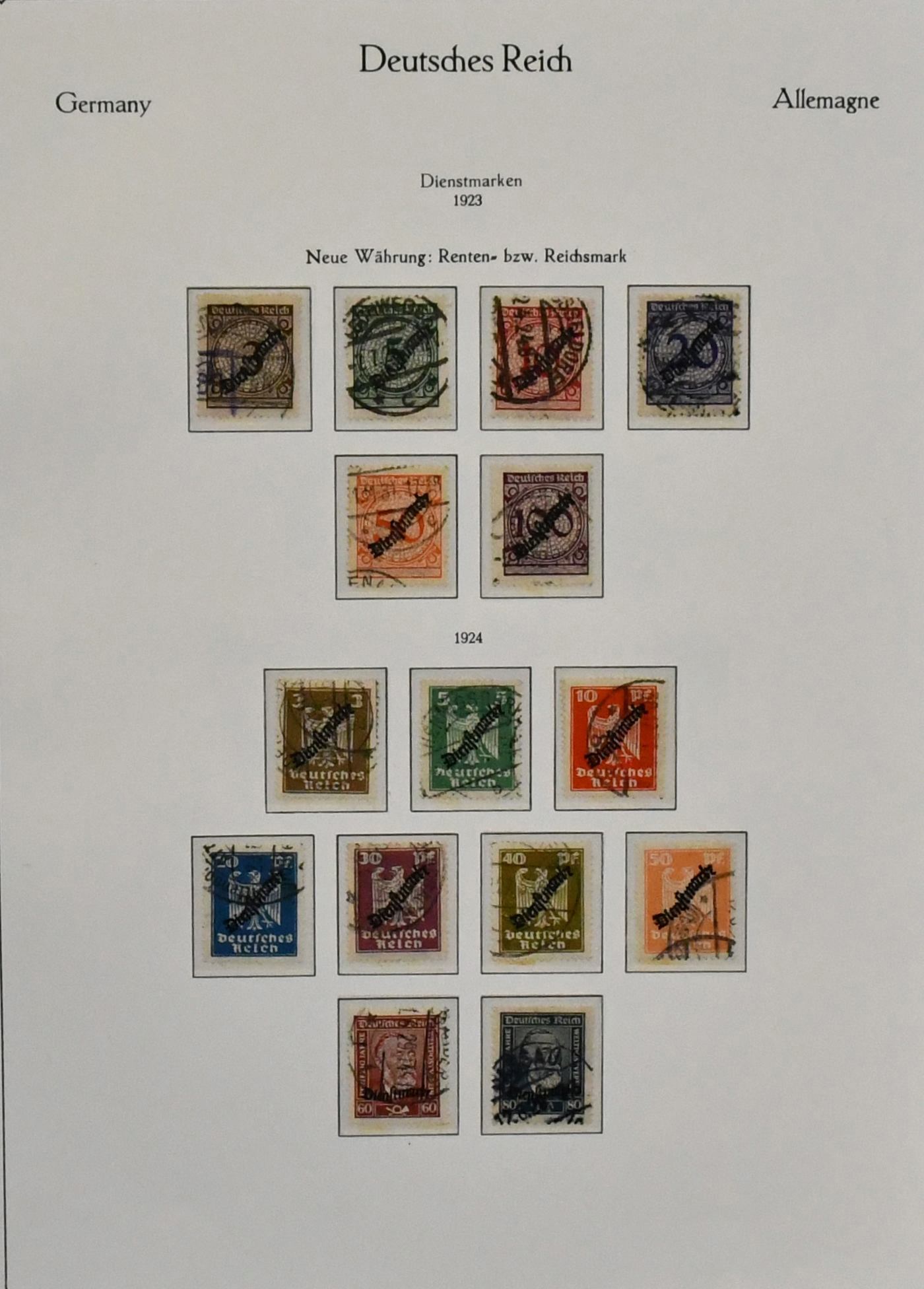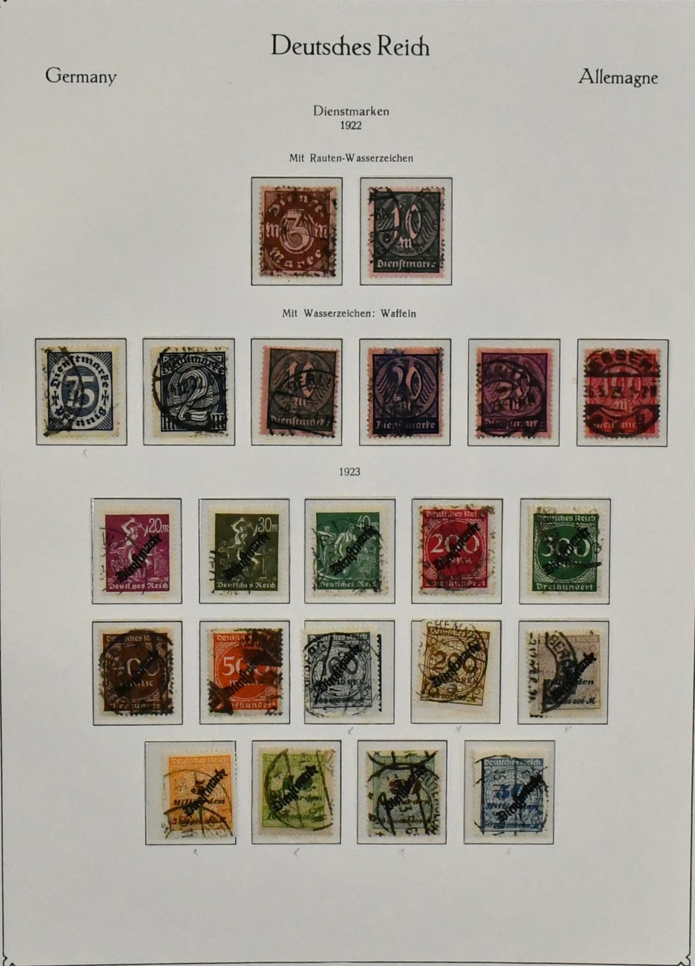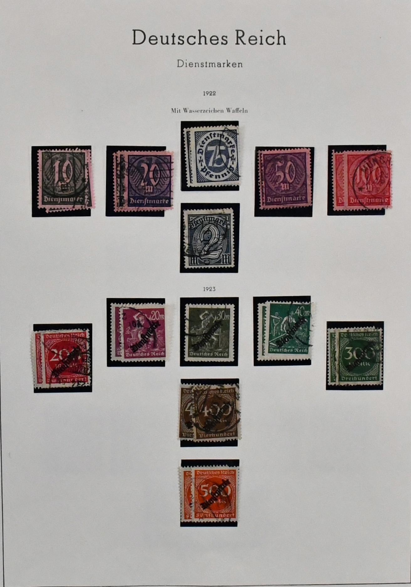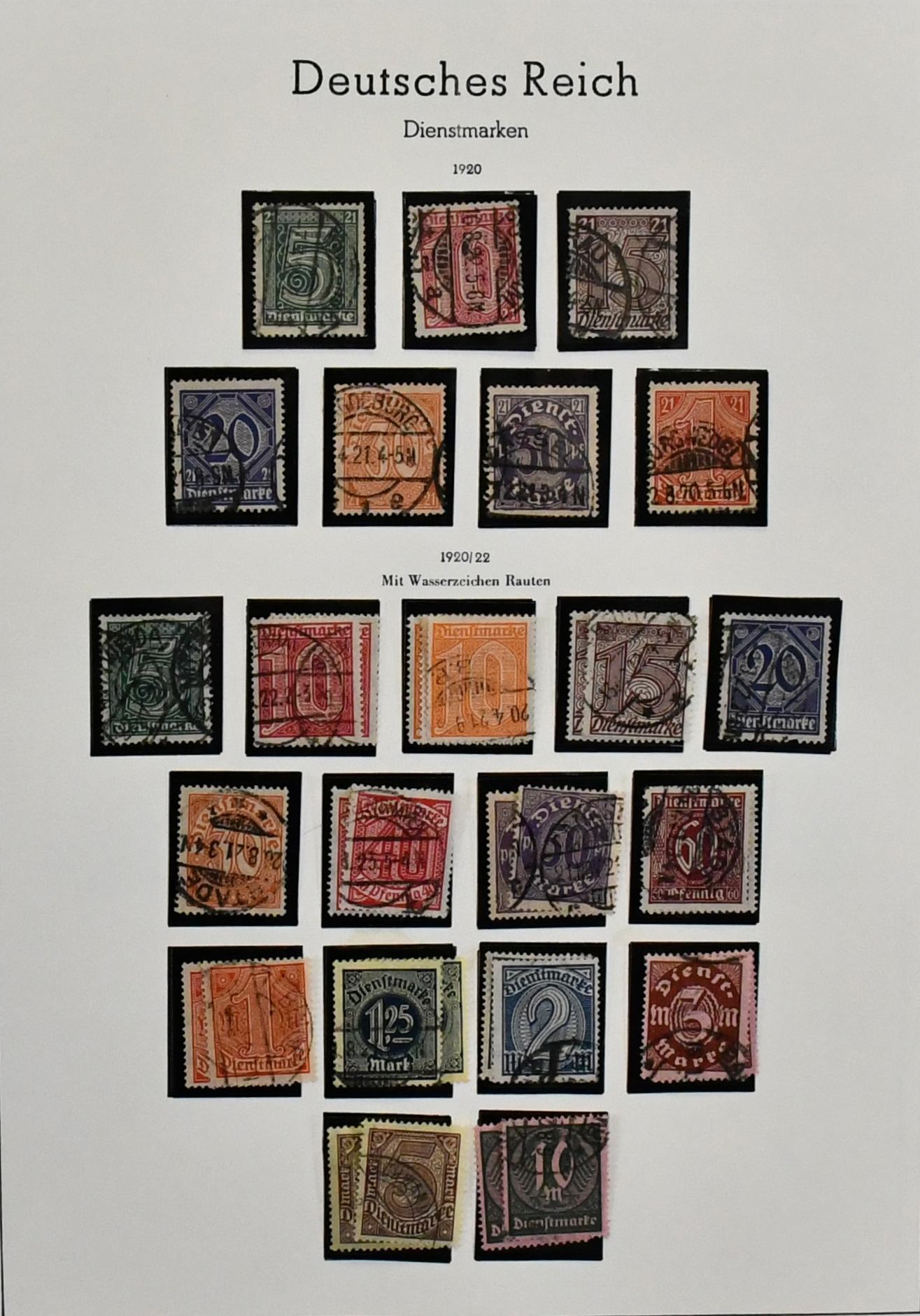 Dienst, postfr./ungebr. und gest. Posten, chronologisch auf SAFE-Blättern aufgezogen. Dabei Nr. 34/51 mehrf. gest., 83/88 auf Briefteil, viele bessere Infla-Werte, teils mit zweifelhaften Stempeln (ungeprüft) usw. Der Sammler ermittelte einen Michelwert von 12.000,-, unter Berücksichtigung des ungeprüften Inflateils vorsichtig taxiert