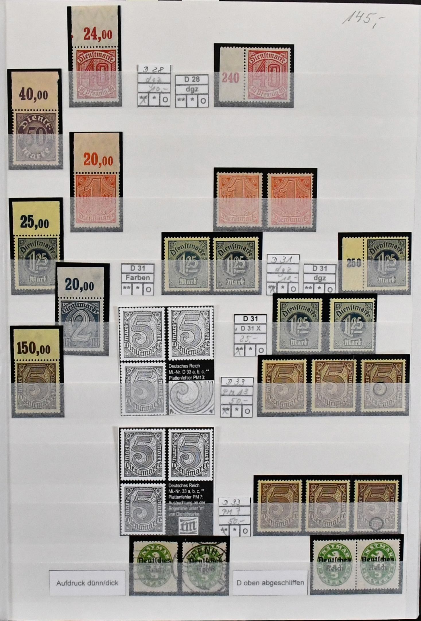Dienst, 1920/1923, meist postfr. Slg. mit ca. 100 Werten mit Besonderheiten, dabei Oberränder, z.B. Nr. 32POR postfr., durchgezähnte Seitenränder, Plattenfehler, u.a. Nr. 21 PF I, 39 PF I postfr. u. gest., usw.