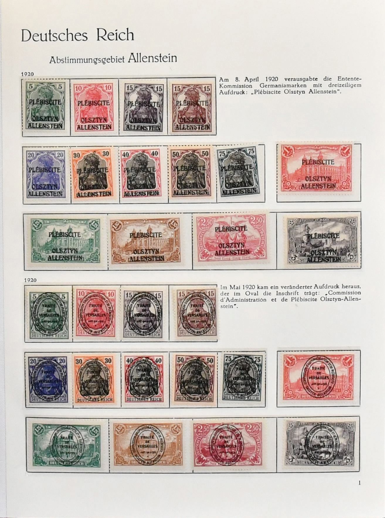Deutsche Abstimmungsgebiete, 1920, gestempelte u. ungebrauchte alte Slg. auf Vordrucken, mit Allenstein Nr. 1/28, Marienwerder Nr. 15/20, Oberschlesien Nr. 30/40, Schleswig und etwas Belgisches Rheinland