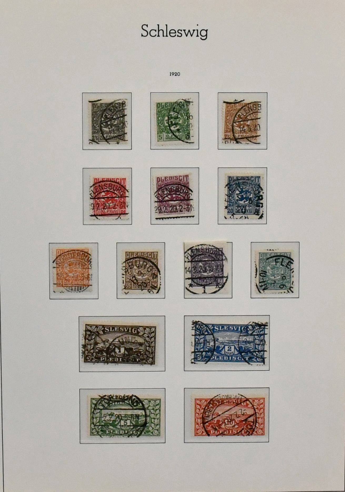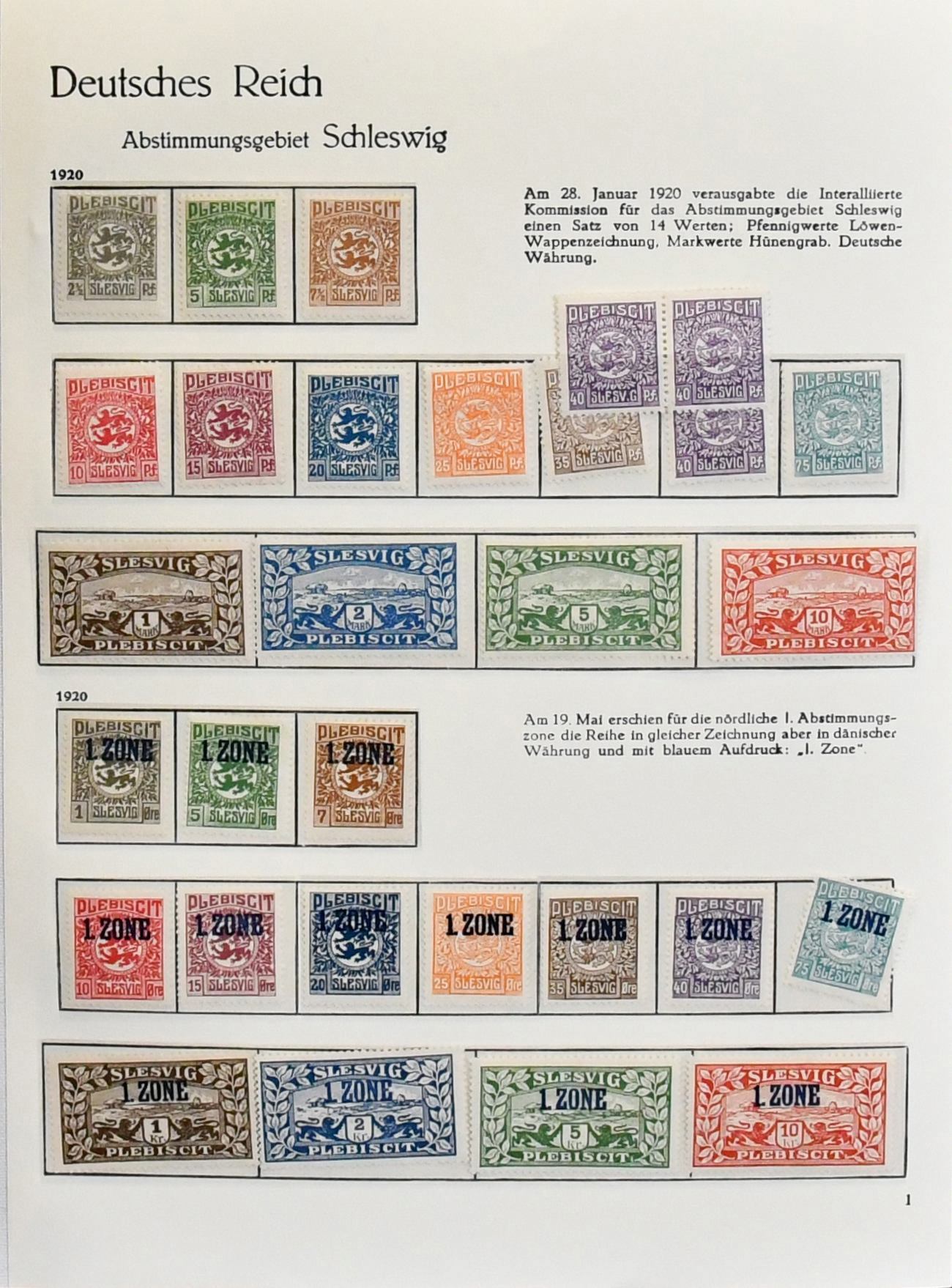 Deutsche Abstimmungsgebiete, 1920, Slg. mit Allenstein Nr. 1/28, Marienwerder Nr. 1/16 u. 22/43, sowie Schleswig Nr. 1/28 inkl. 26/28b, alles auf "sprechenden" Behrens-Vordrucken