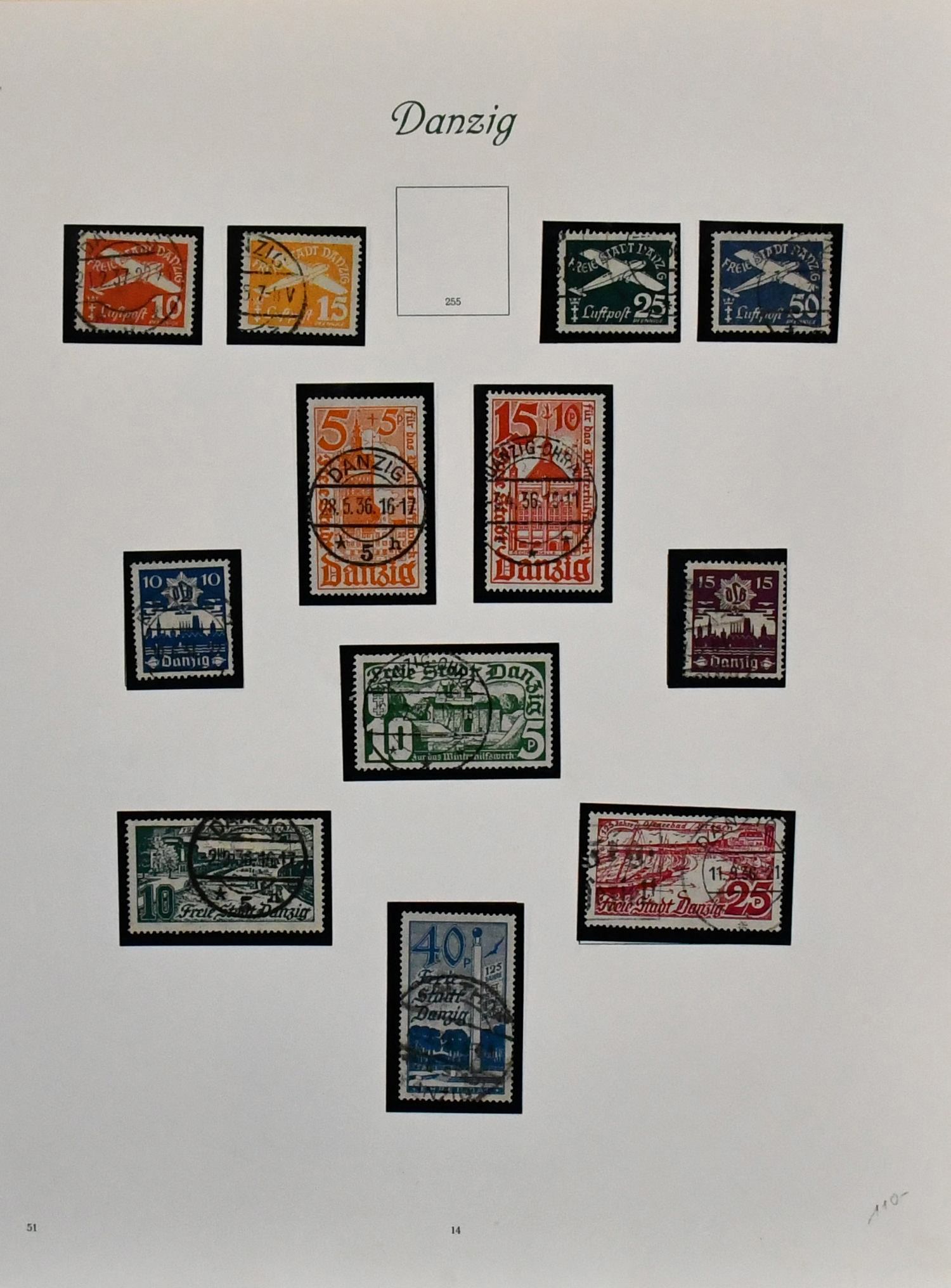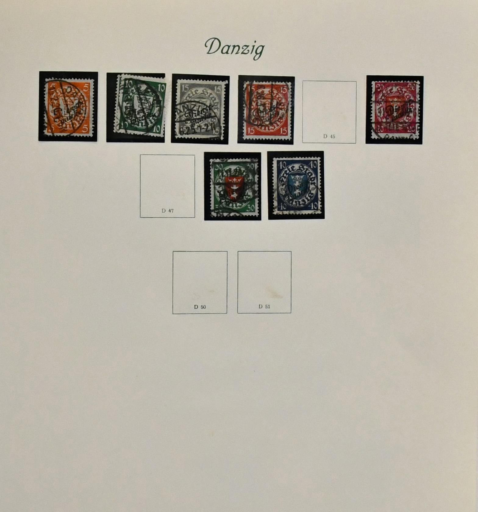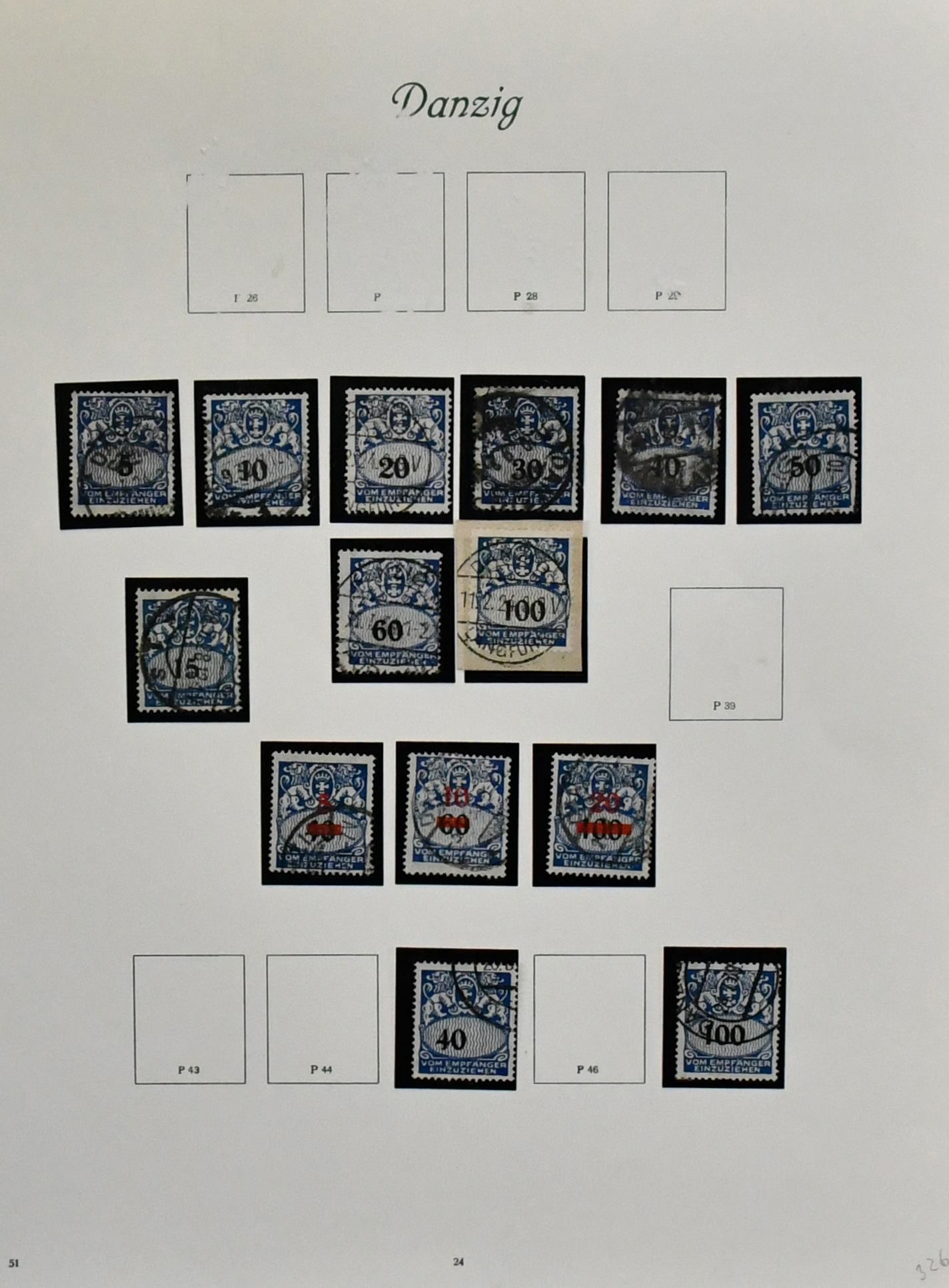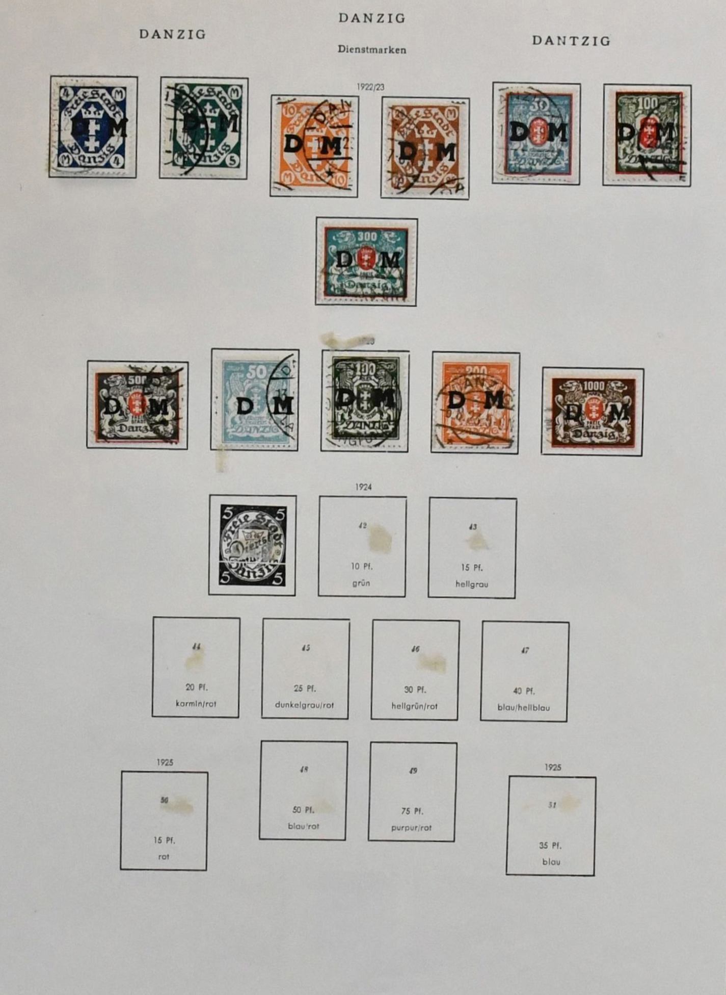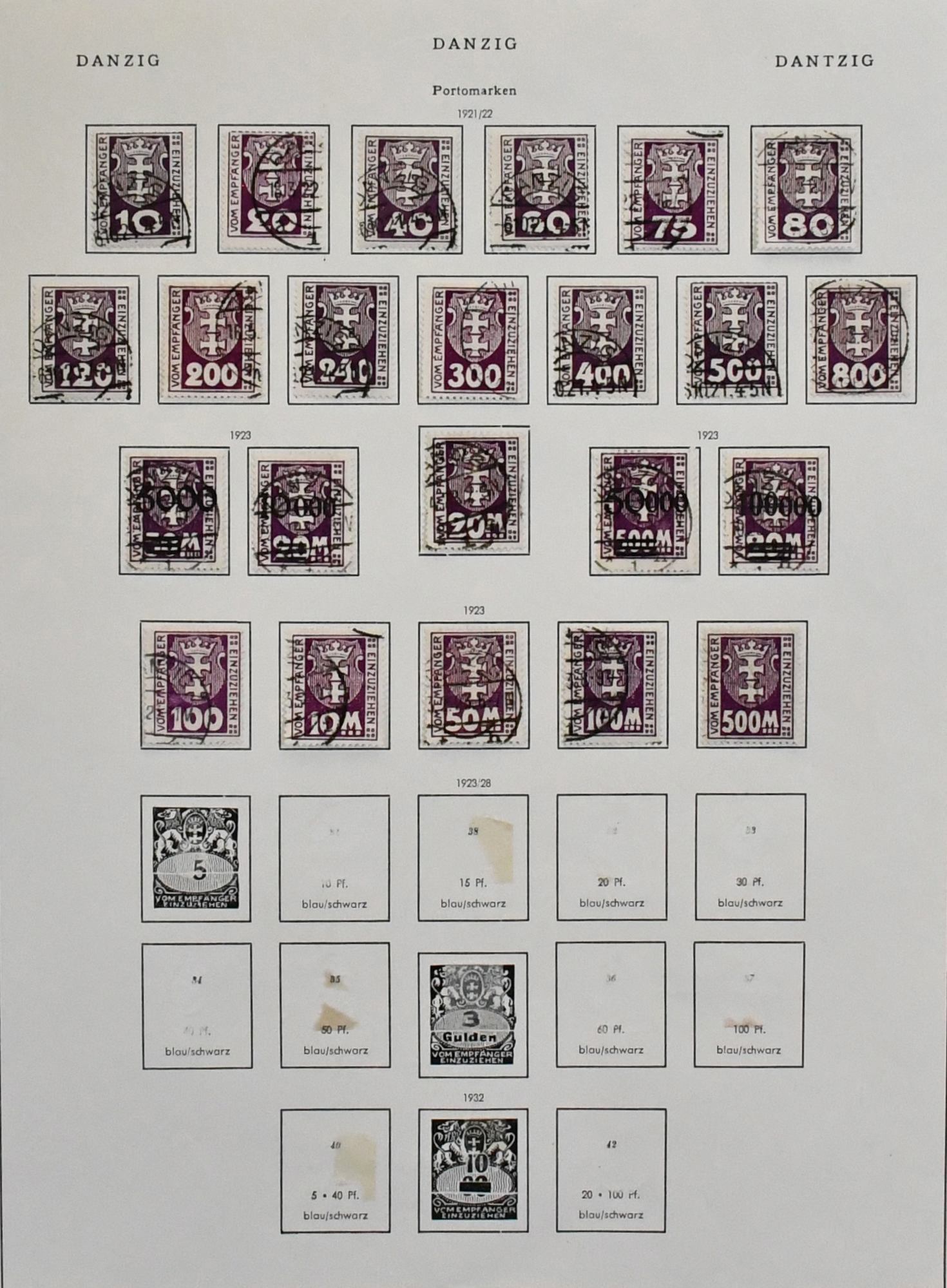 Danzig, 1920/1939, umfangreiche Sammlung, lediglich ohne beide Innendienst-Sätze und Nr. 237, nahezu kpl., inkl. Nr. 1/31, 37 per zwei, 41/46I, 41/46 und 45/46II, 50/192 teils mehrf., einige Infla-Ganzsachen, Nr. 202/11, 220/35, 238/39 gest., Bl. 1/2 einmal gest., sowie auf Briefen, Bl. 3 gest., allen Winterhilfen, Nr. 297 postfr. mit Plattennummer usw. Dazu Dienst Nr. 1/51 und Porto Nr. 1/47 ebenso kpl.
