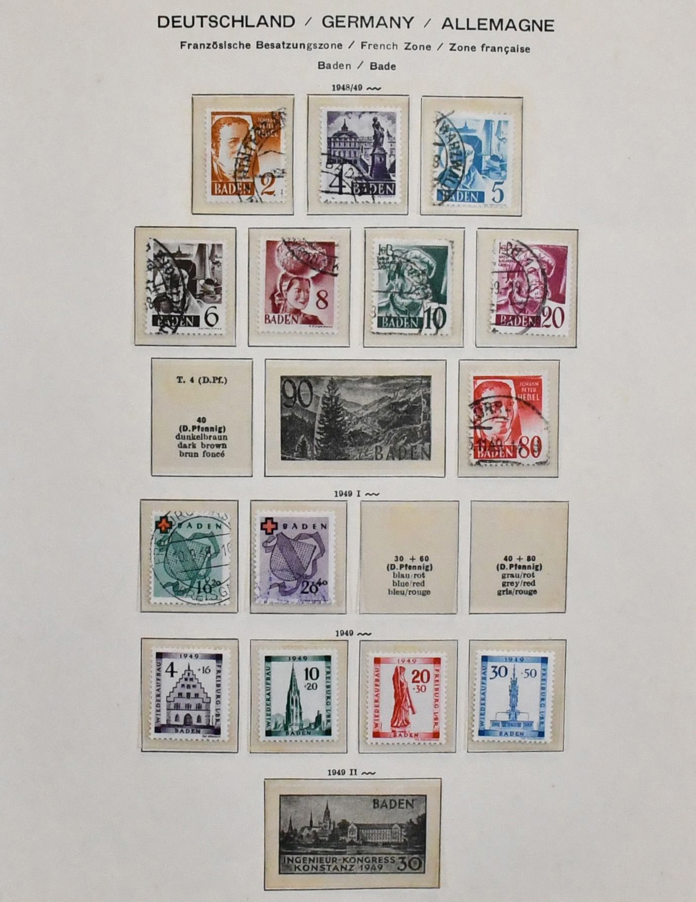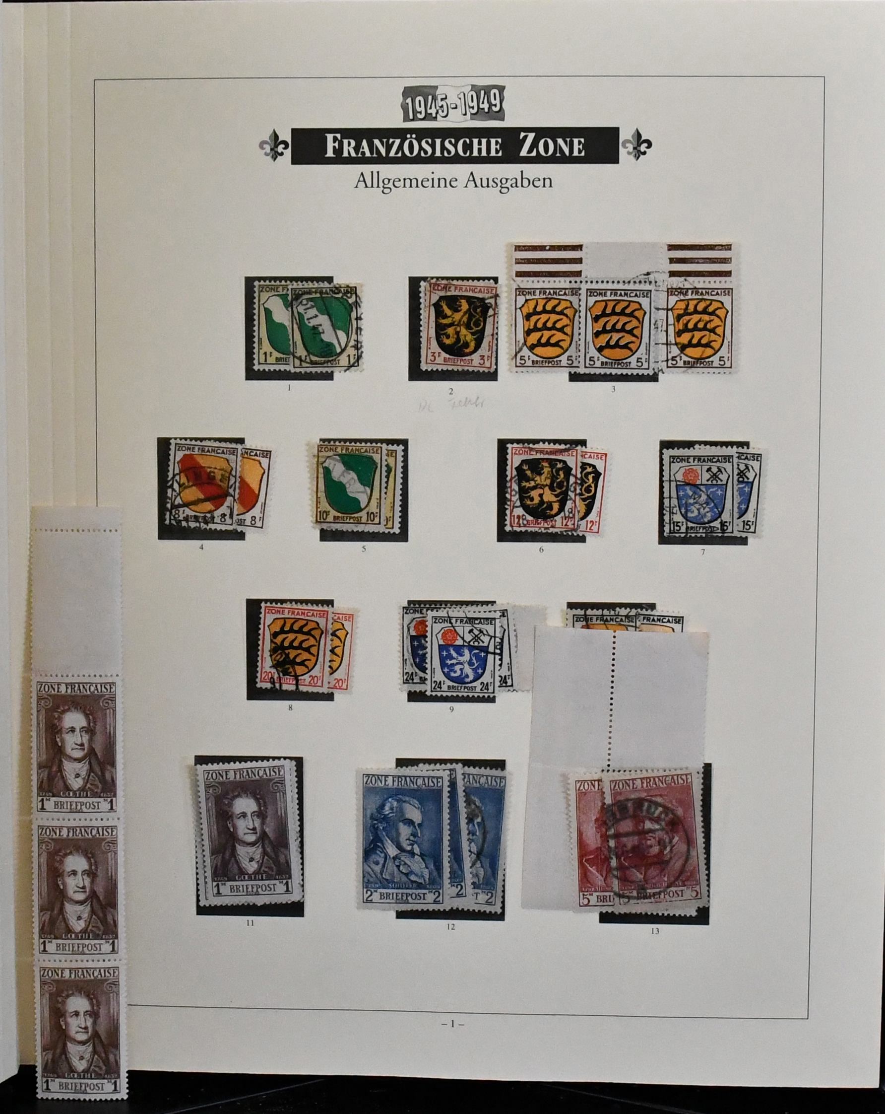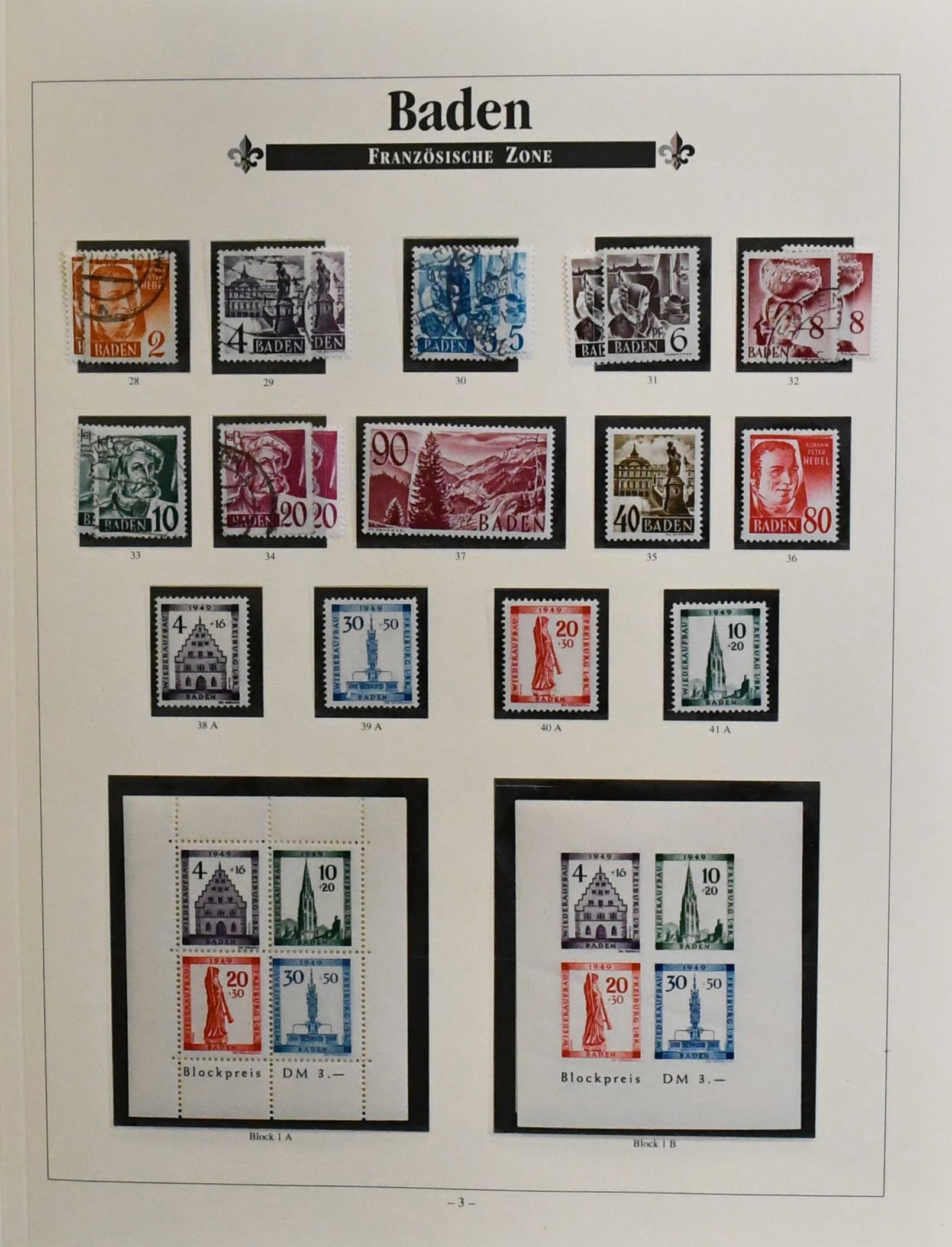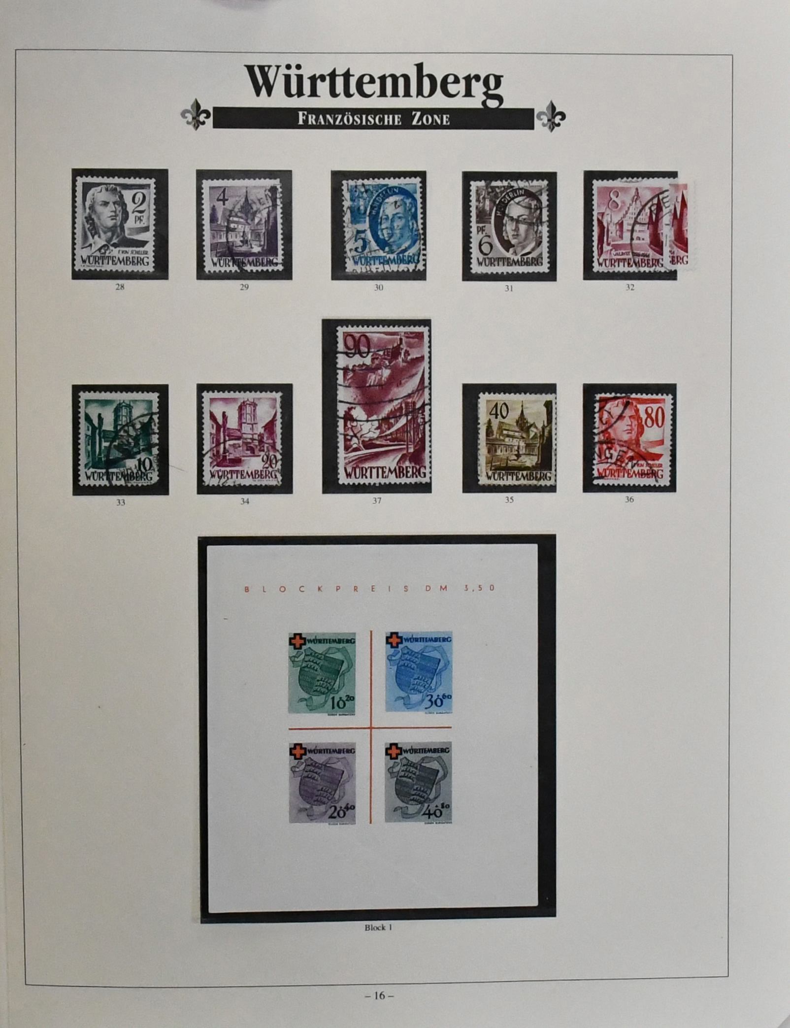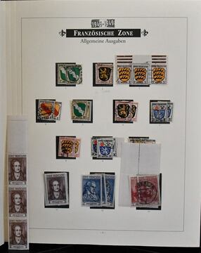 Französische Zone, Slg. von Baden bis Württemberg, bis auf zwei Rotkreuz-Blöcke und einem -Satz, nahezu kpl. Slg. im Sieger-Vordruckalbum. Dabei Allg. Ausgabe Nr. 1/13 gest. (Mi. 250,-), Baden Nr. 1/57 kpl., postfr. Bl. 1A/B, Rheinl.-Pfalz Nr. 1/41 gest. (Mi. 739,-), Württemberg Nr. 1/39 gest. (Mi. 336,-), Bl. 1 (160,-) usw.