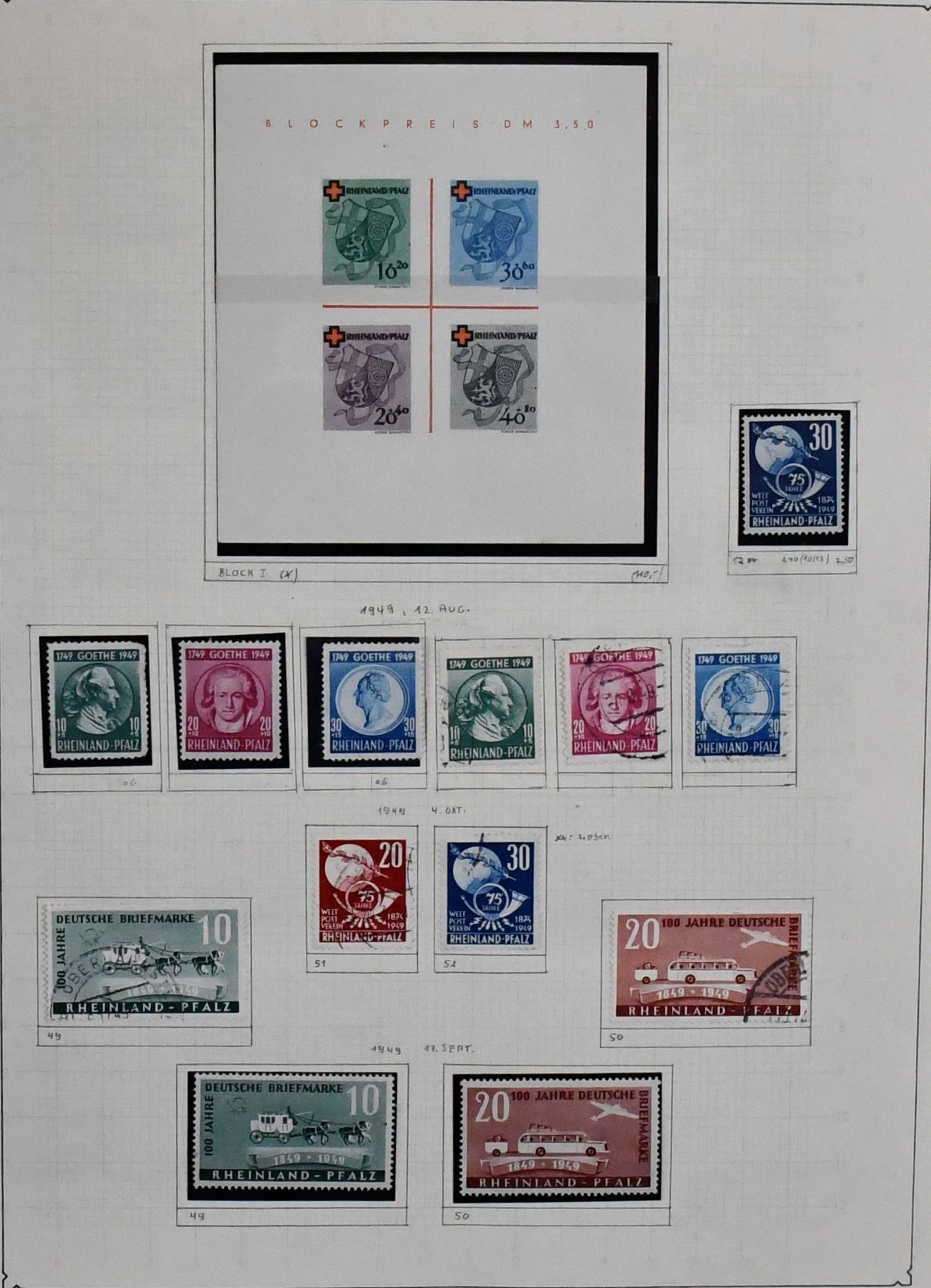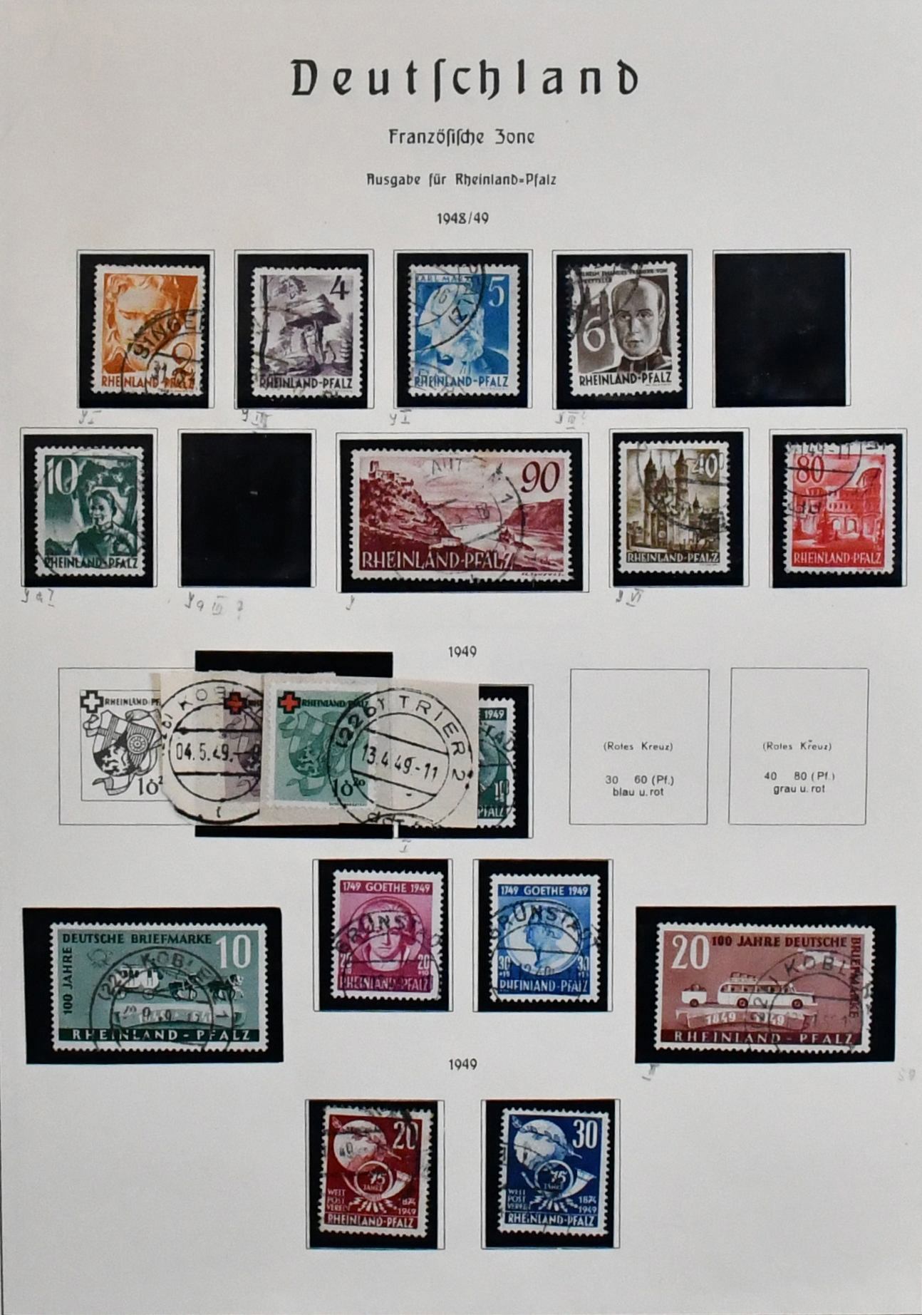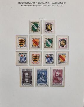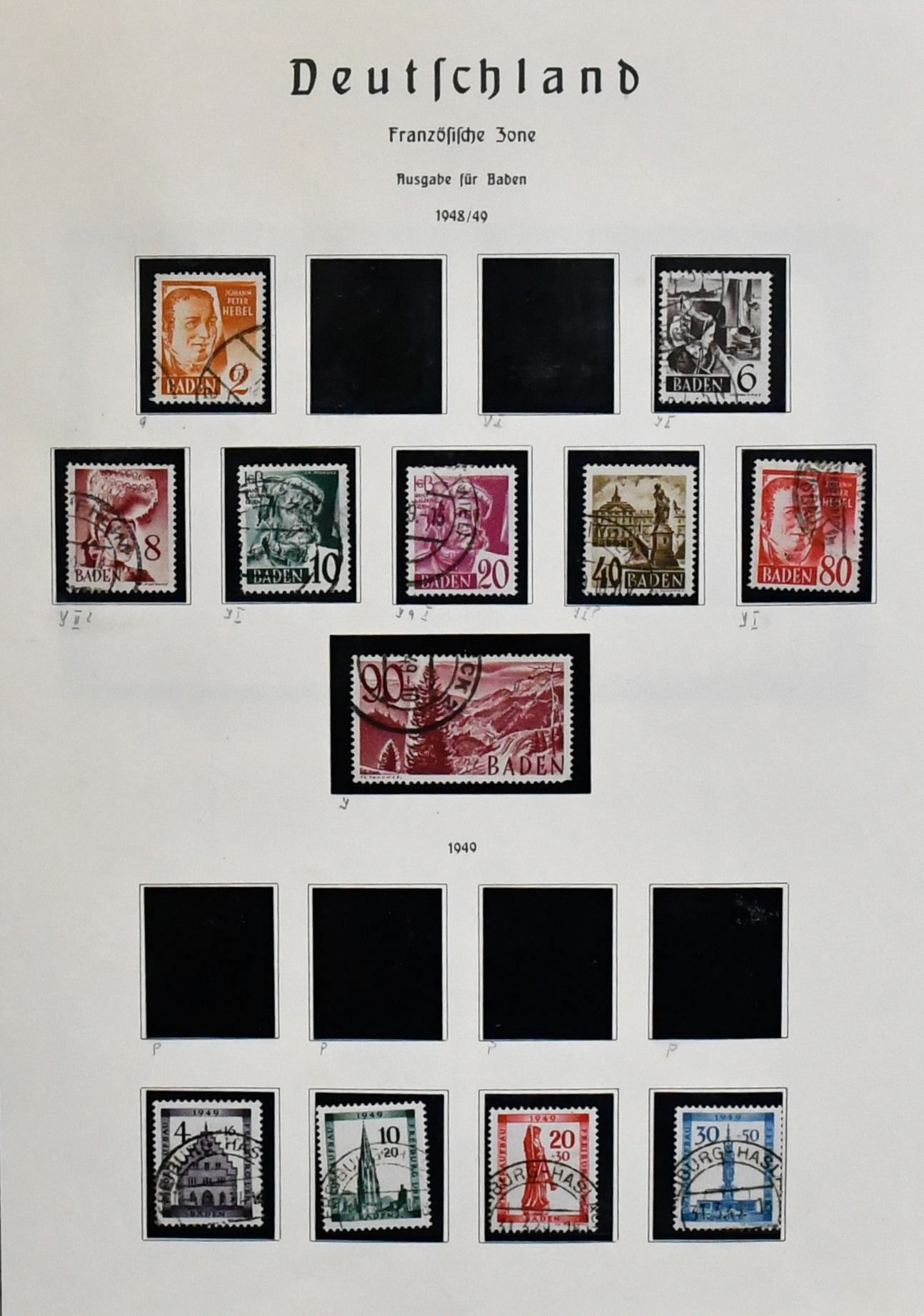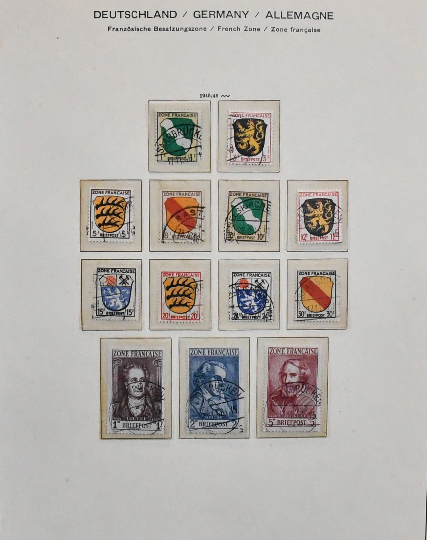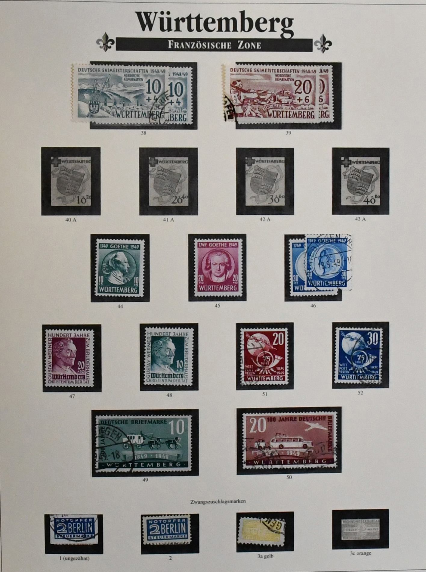 Französische Zone, Slg. von Baden bis Württemberg, bis auf zwei Rotkreuz-Blöcke und einem -Satz, nahezu kpl. Slg. im Sieger-Vordruckalbum. Dabei Allg. Ausgabe Nr. 1/13 gest. (Mi. 250,-), Baden Nr. 1/57 kpl., postfr. Bl. 1A/B, Rheinl.-Pfalz Nr. 1/41 gest. (Mi. 739,-), Württemberg Nr. 1/39 gest. (Mi. 336,-), Bl. 1 (160,-) usw.