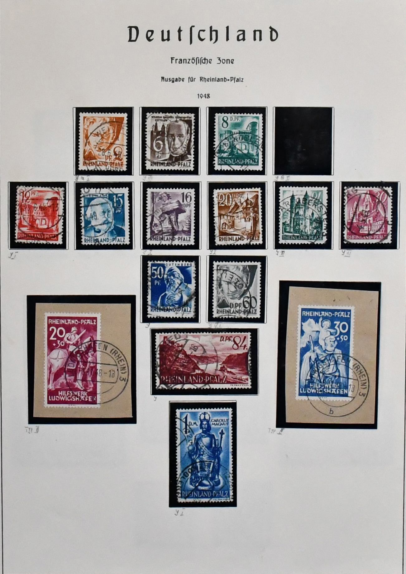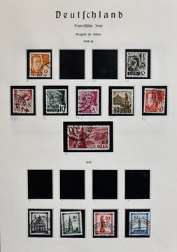 Französische Zone, 1945/49, gestempelte Slg. mit u.a. Baden Nr. 38/41A (Mi. 200,-), Bl. 1A/B mit ESST, gepr. Schlegel BPP (Mi. 140,-), Rheinl.-Pfalz Nr. 30/31 (150,-), 42/43 auf Briefstücken, gepr. Schlegel (Mi. 220,-), 46/52 (188,-), Württemberg Nr. 28/39 (300,-), 44/46 gepr. Schlegel (Mi. 120,-) usw., auf Leuchtturm-Vordrucken. Mi. 1600,-