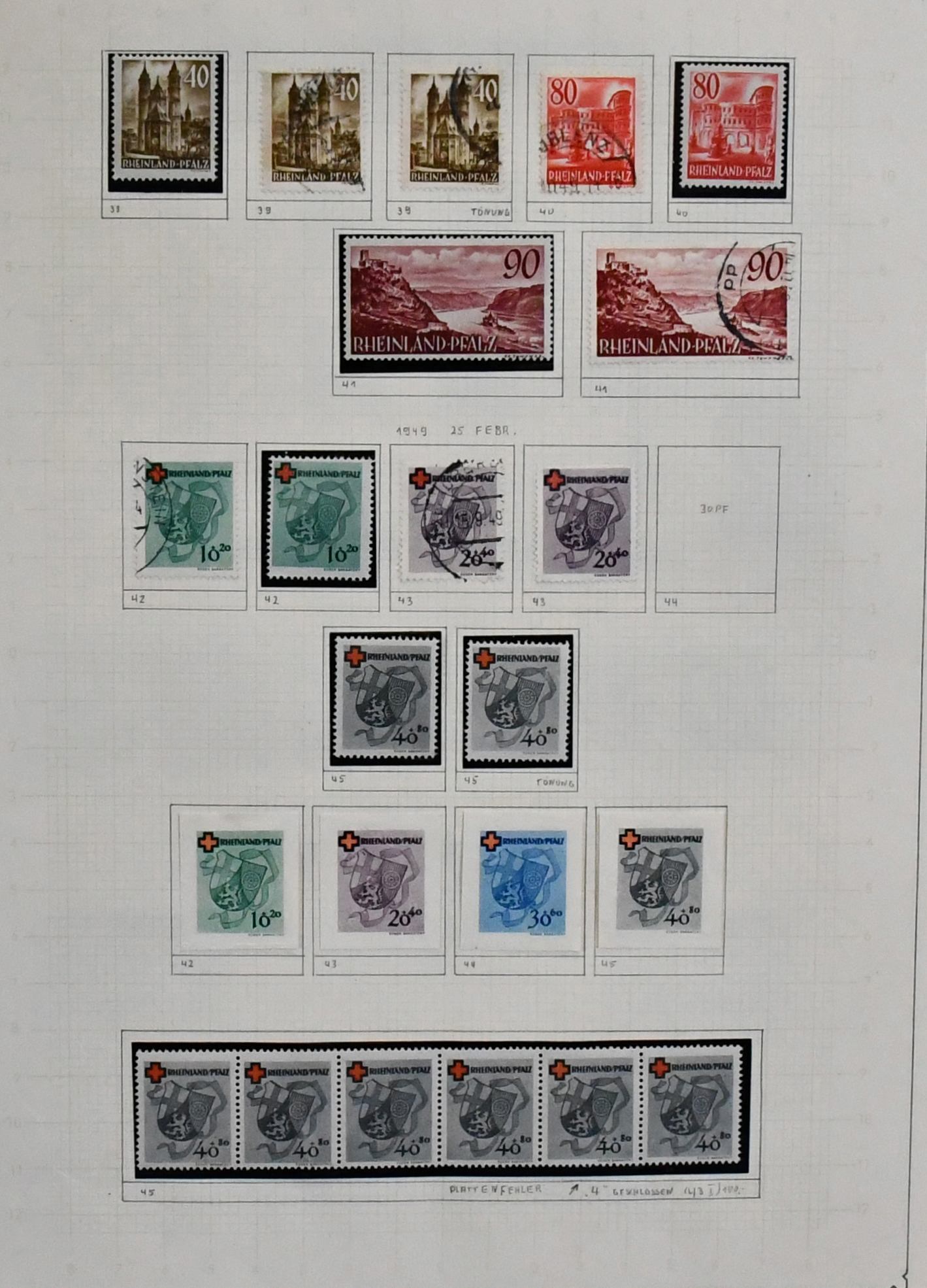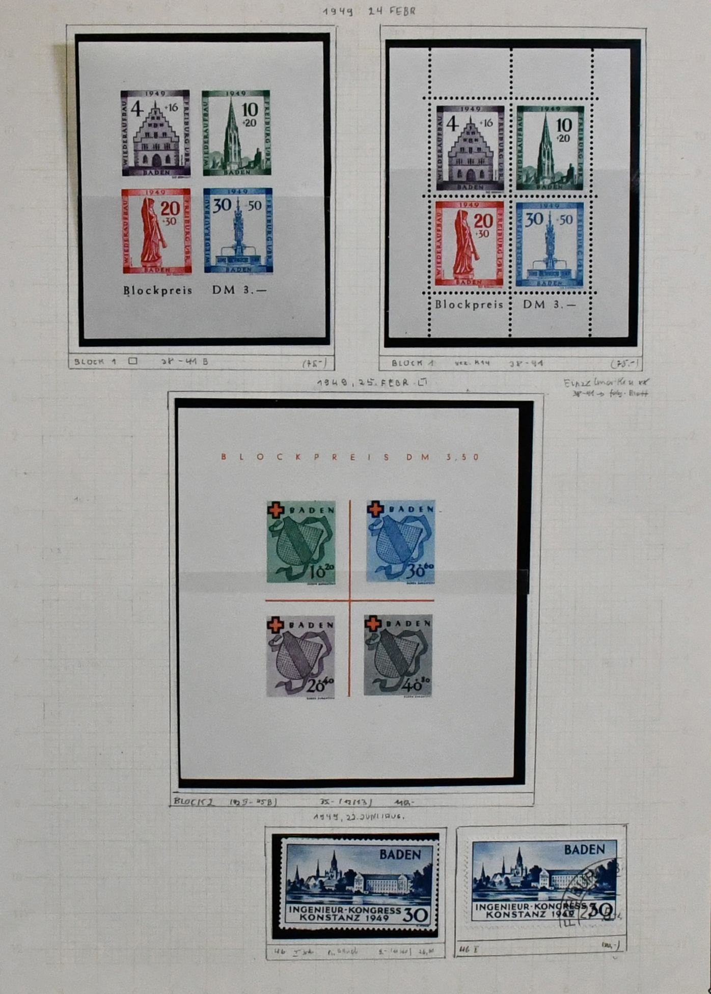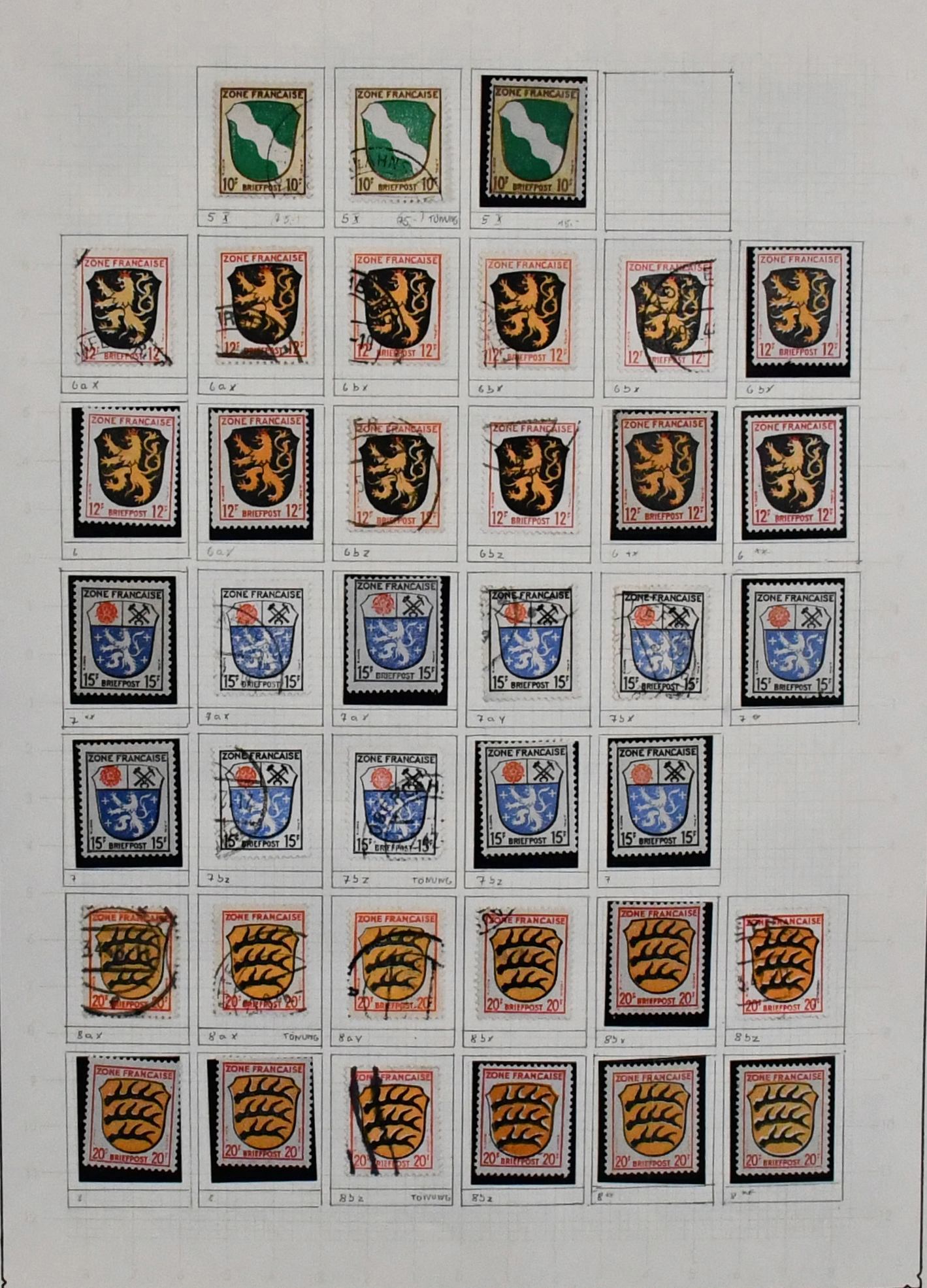 Französische Zone, 1945/49, postfr., ungebr. und gest. Slg. mit etwa 1200 Werten, von Baden bis Württemberg, im dicken E-Buch. Dabei insbesondere die Freimarken-Ausgaben umfangreich nach Typen spezialisiert, bessere Ausgaben wie Baden Bl. 1A/B, Nr. 50/55, Rheinl.-Pfalz mit Rotkreuz-Block und -Satz, Nr. 46/52 usw. Mi., gemäß beiliegender Berechnungen des Sammlers, 6000,- Euro