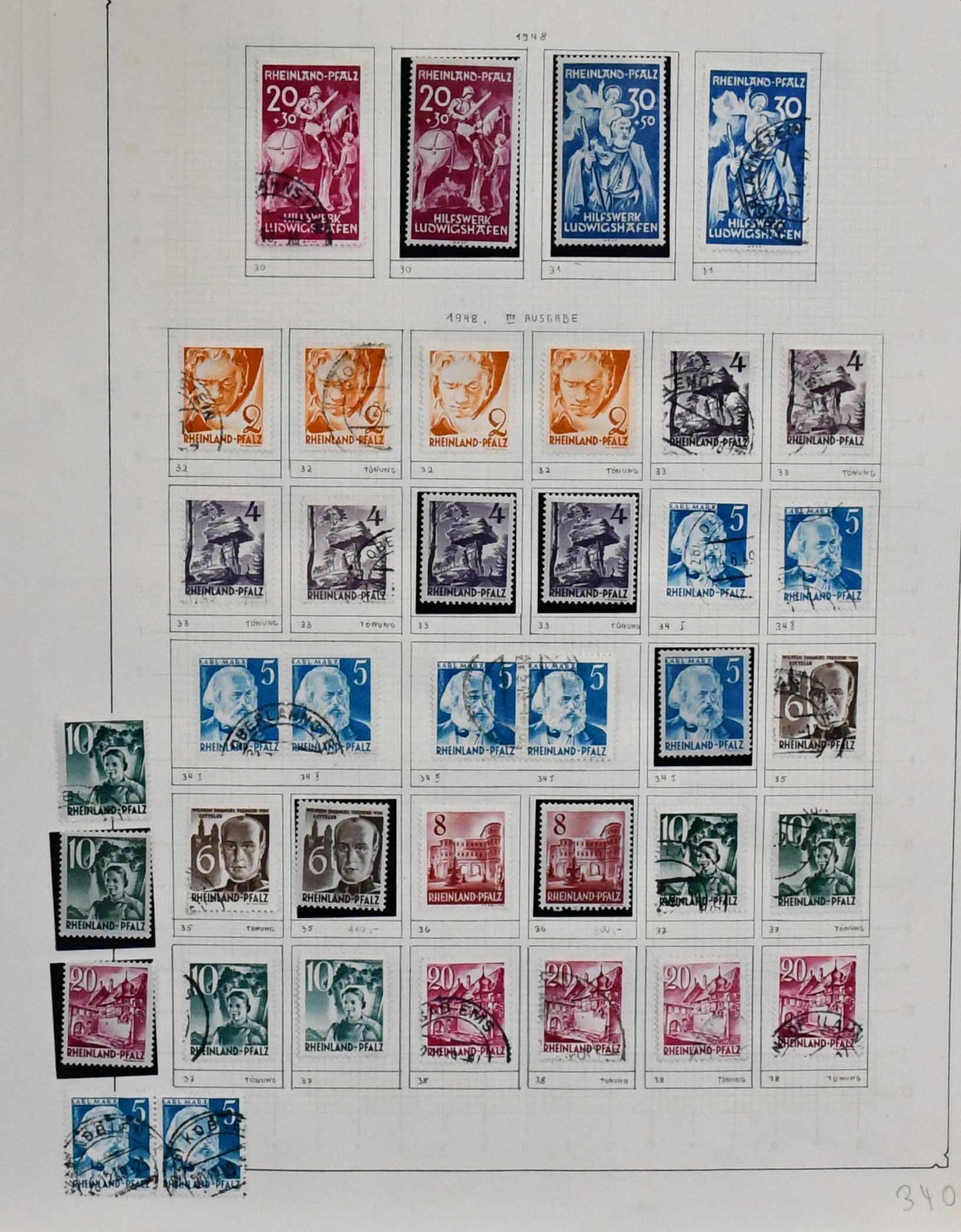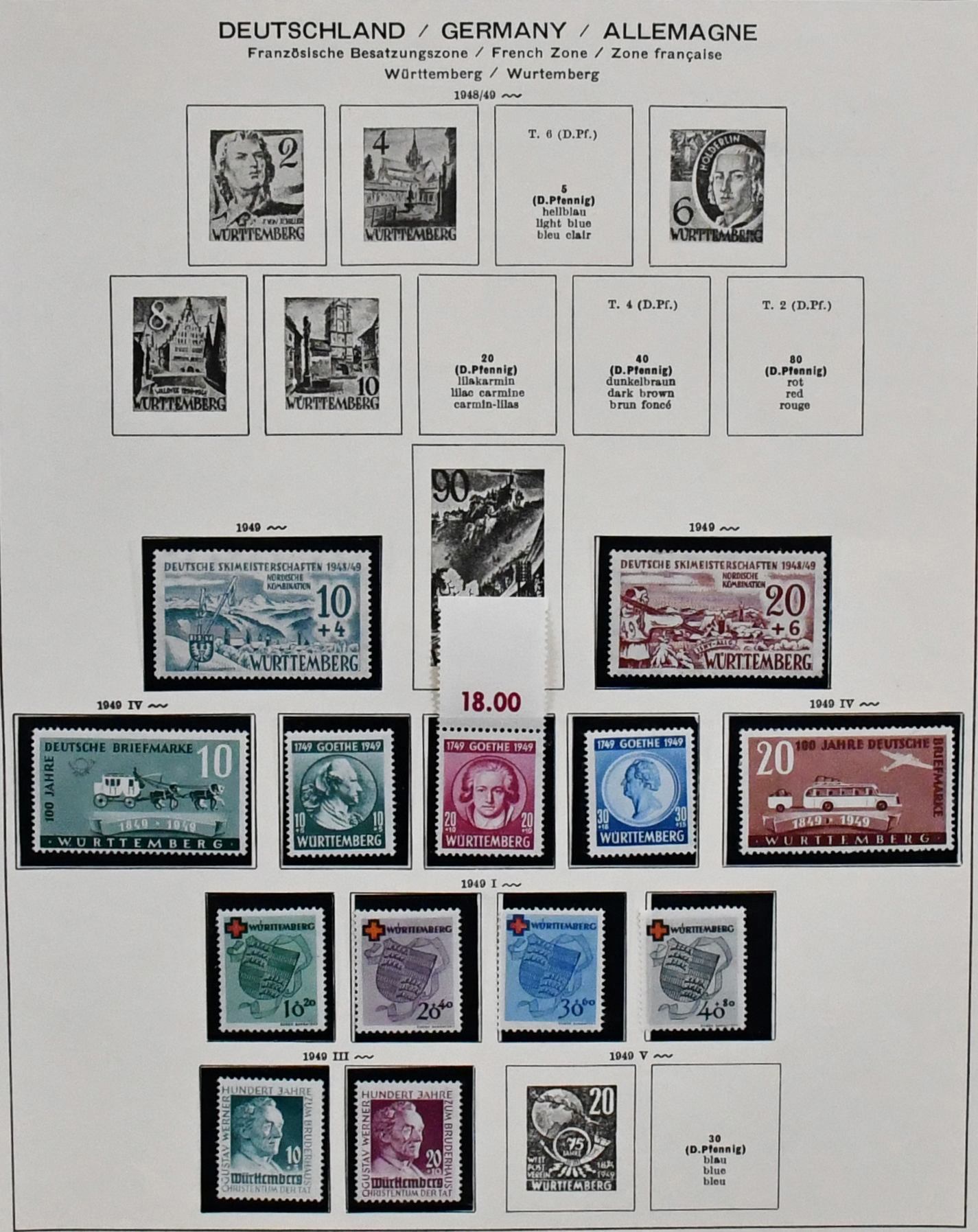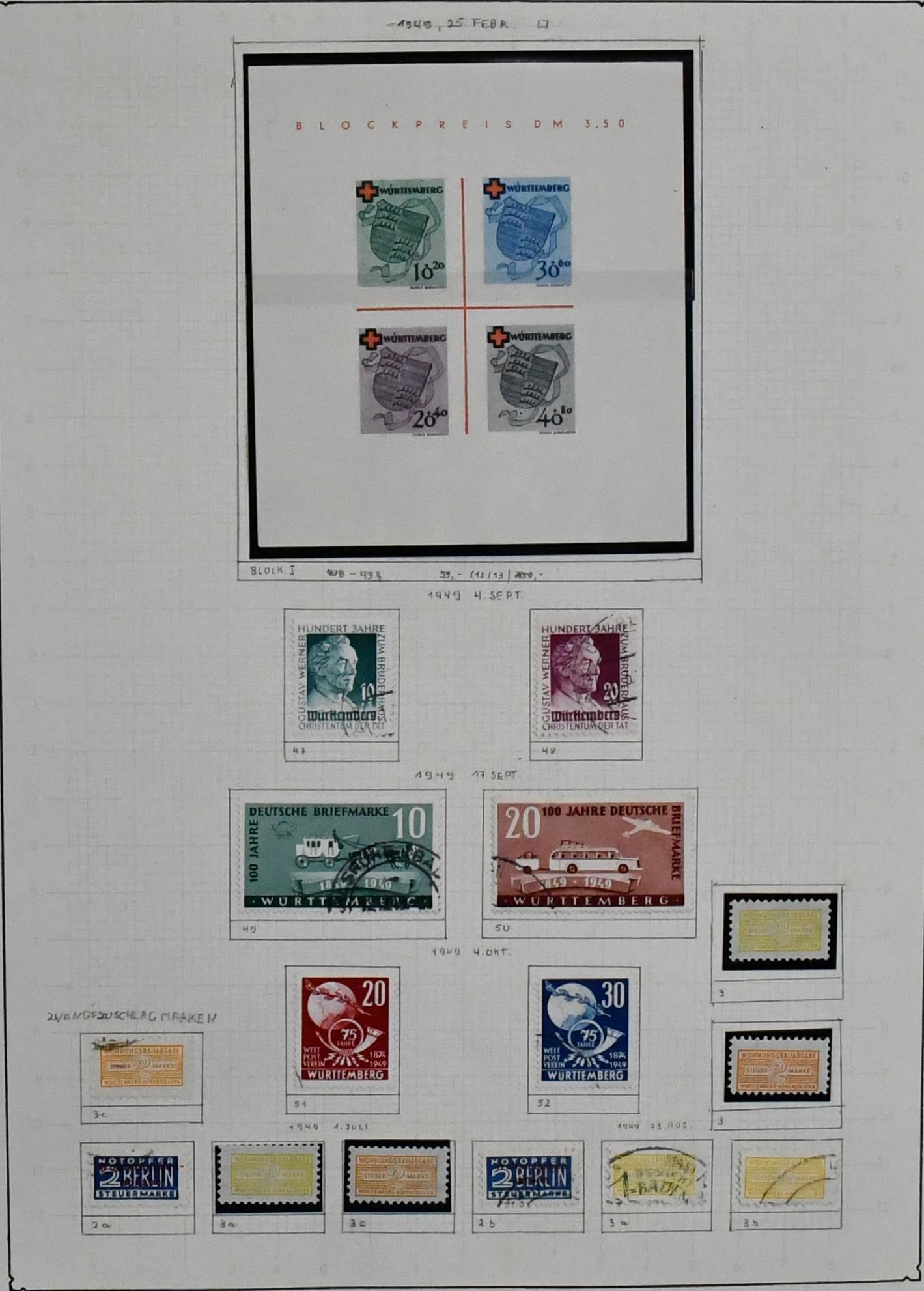 Französische Zone, 1945/49, postfr., ungebr. und gest. Slg. mit etwa 1200 Werten, von Baden bis Württemberg, im dicken E-Buch. Dabei insbesondere die Freimarken-Ausgaben umfangreich nach Typen spezialisiert, bessere Ausgaben wie Baden Bl. 1A/B, Nr. 50/55, Rheinl.-Pfalz mit Rotkreuz-Block und -Satz, Nr. 46/52 usw. Mi., gemäß beiliegender Berechnungen des Sammlers, 6000,- Euro