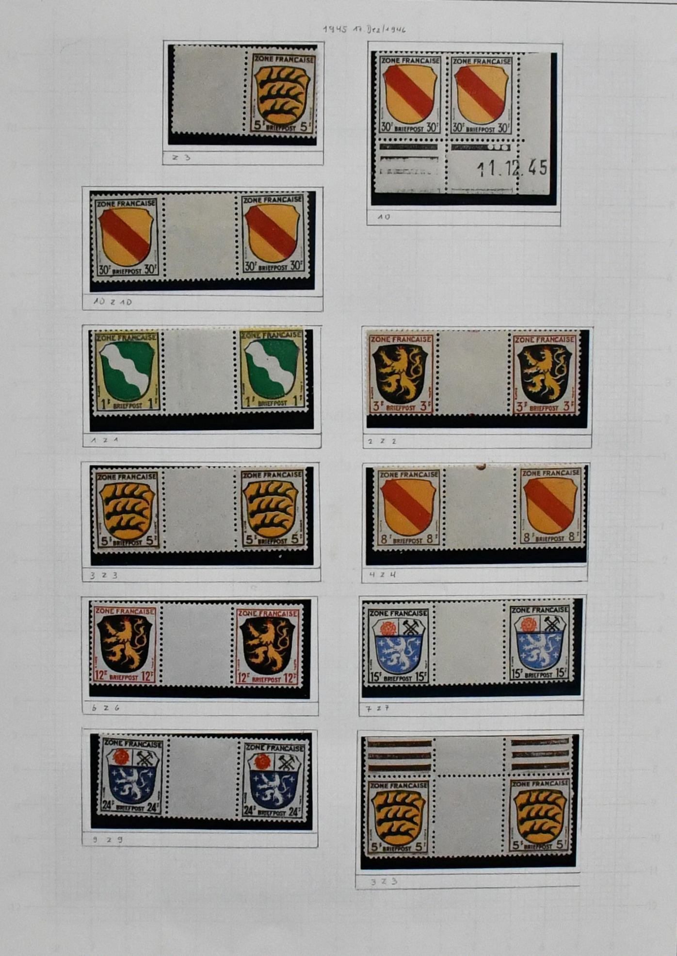 Französische Zone, postfrischer Bestand mit alleine rund 700 (!) Zwischenstegpaaren der Allgem. Ausgabe (Mi. billigst alleine schon 4200,-), sowie 1000 Werten Baden und Rheinland-Pfalz inkl. Einheiten, einigen Druckdaten und Abarten etc. Insgesamt enorm hoher KW