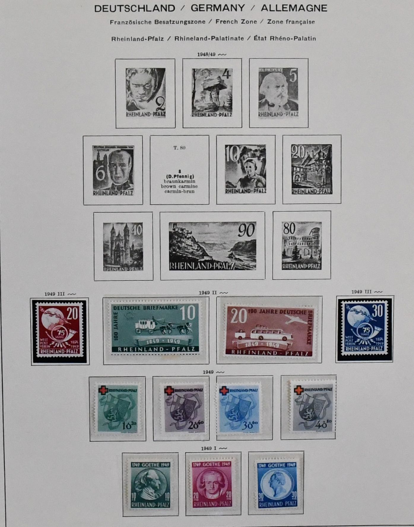 Französische Zone, 1945/49, umfangreiche, postfr., ungebr. und gest. nahezu kpl. Slg. auf KABE-Blättern. Dabei Freimarken-Sätze spezialisiert, alle Rotkreuz-Blöcke, Baden Bl. 1A/B postfr., Rotkreuz-Sätze von Baden und Rheinl.-Pfalz, letzterer mit postfr. Sechserstreifen Nr. 45A, einmal mit Plattenfehler I, usw. Mi. 4100,-
