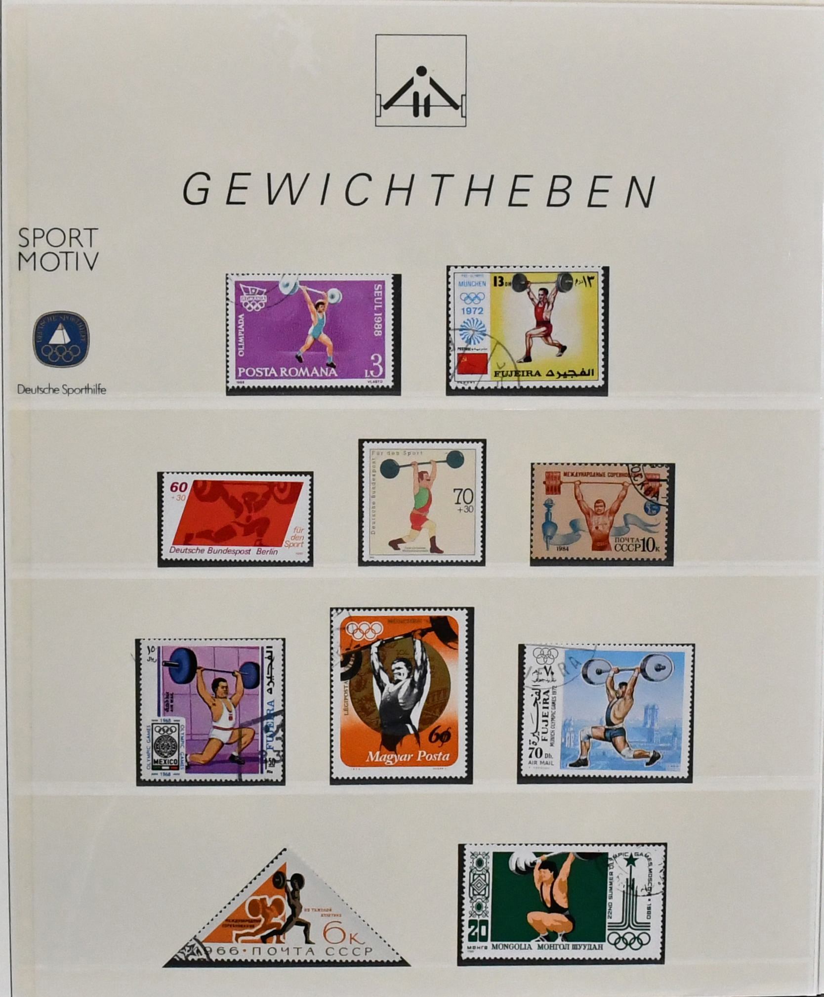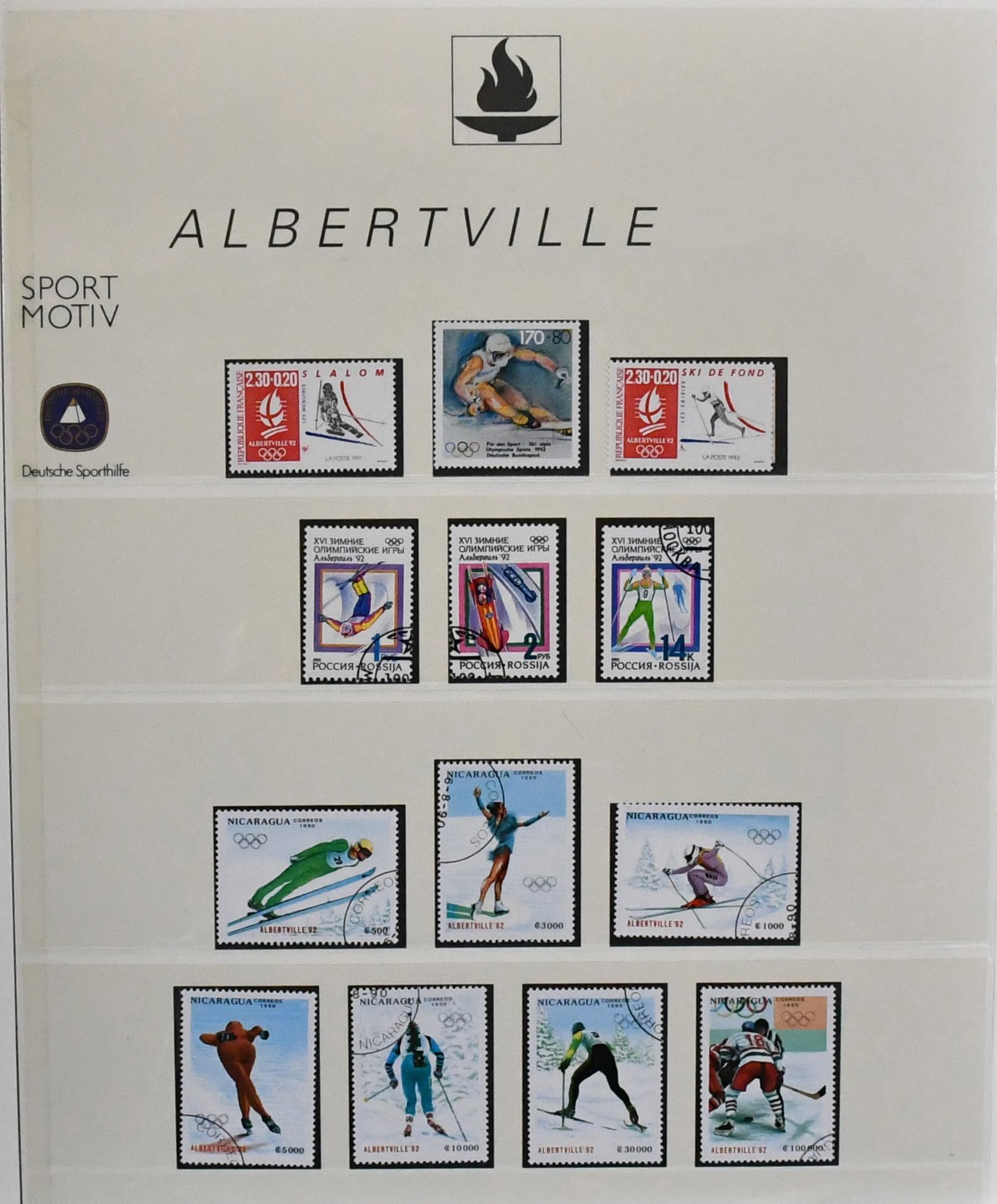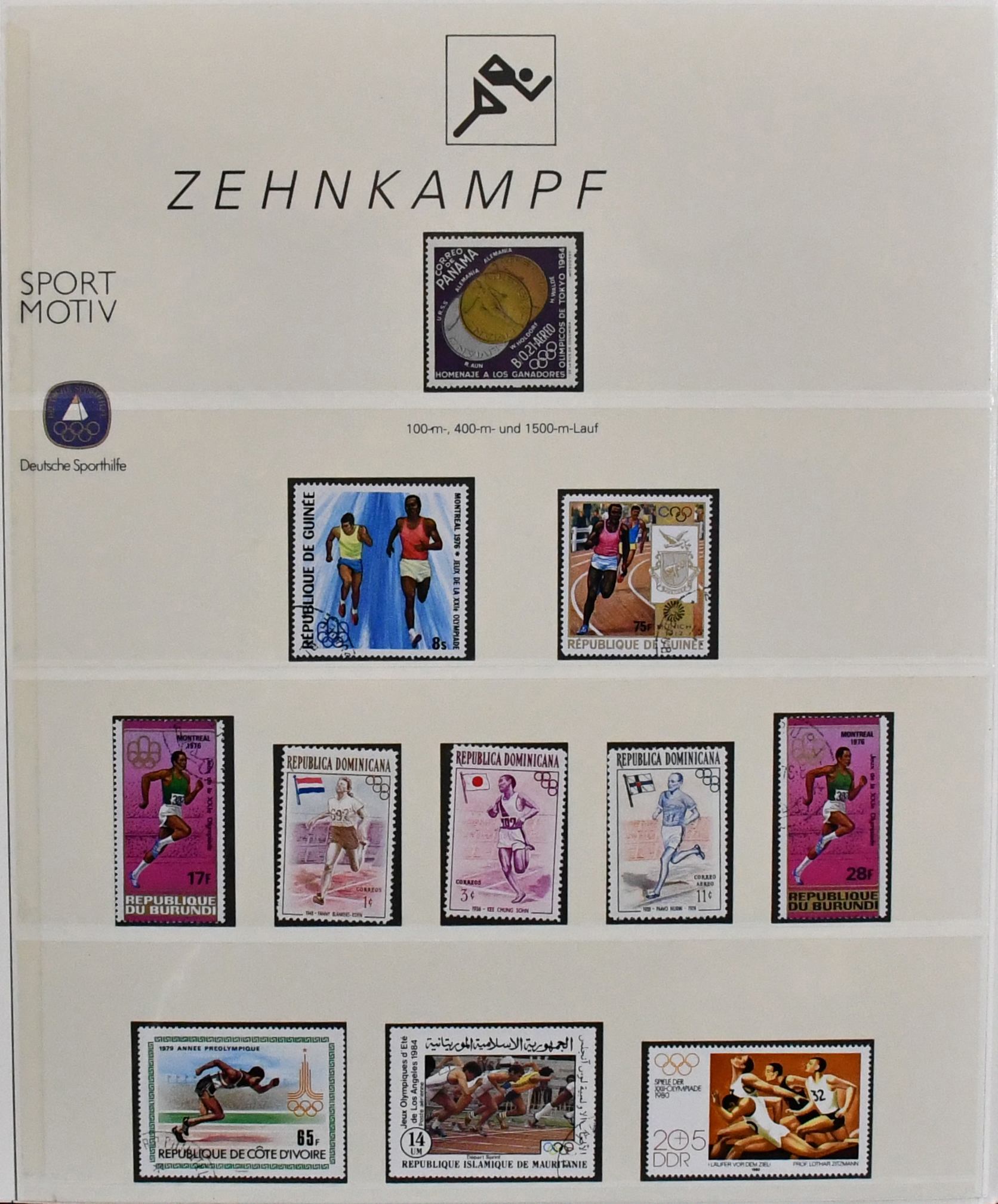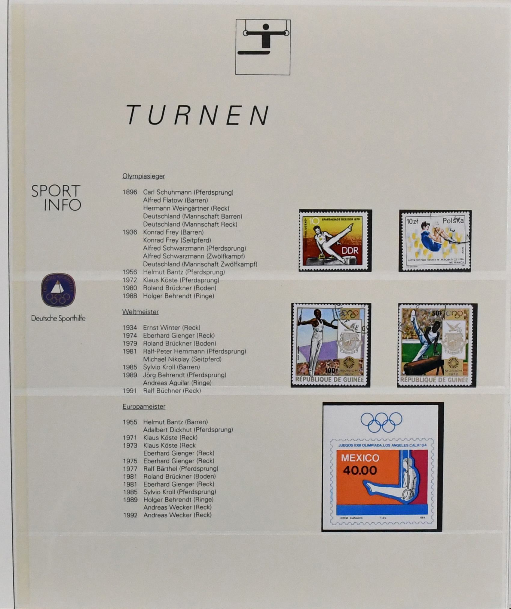 Olympia, Abo-Sammlung der Deutschen Sporthilfe auf 61 Vordrucken, dazu viele Textseiten, in zwei Lindner-Ringbindern mit Marken und Belegen aus aller Welt
