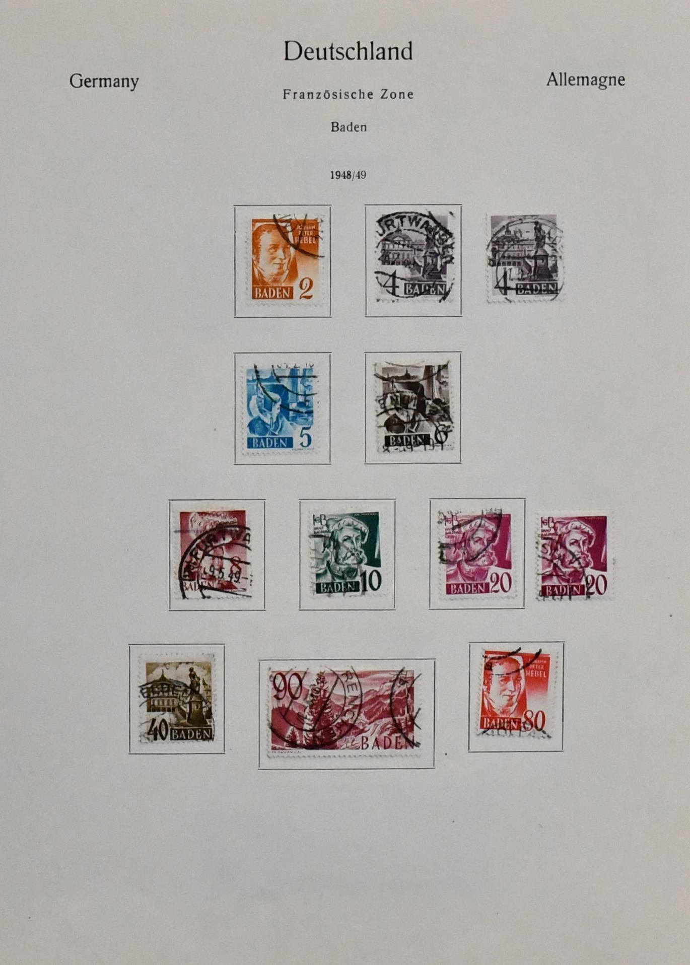 Französische Zone, gestempelte Slg. aller drei Gebiete, mit Allg. Ausgabe Nr. 1/13 (Mi. 250,-), Baden Bl. 1A/B mit Gefälligkeitsstpl., gepr. Schlegel BPP (Mi. 140,-), Rheinl.-Pfalz Nr. 30/41 (700,-), 46/52 (188,-), Württemberg Nr. 44/52 (Mi. 211,-) usw.