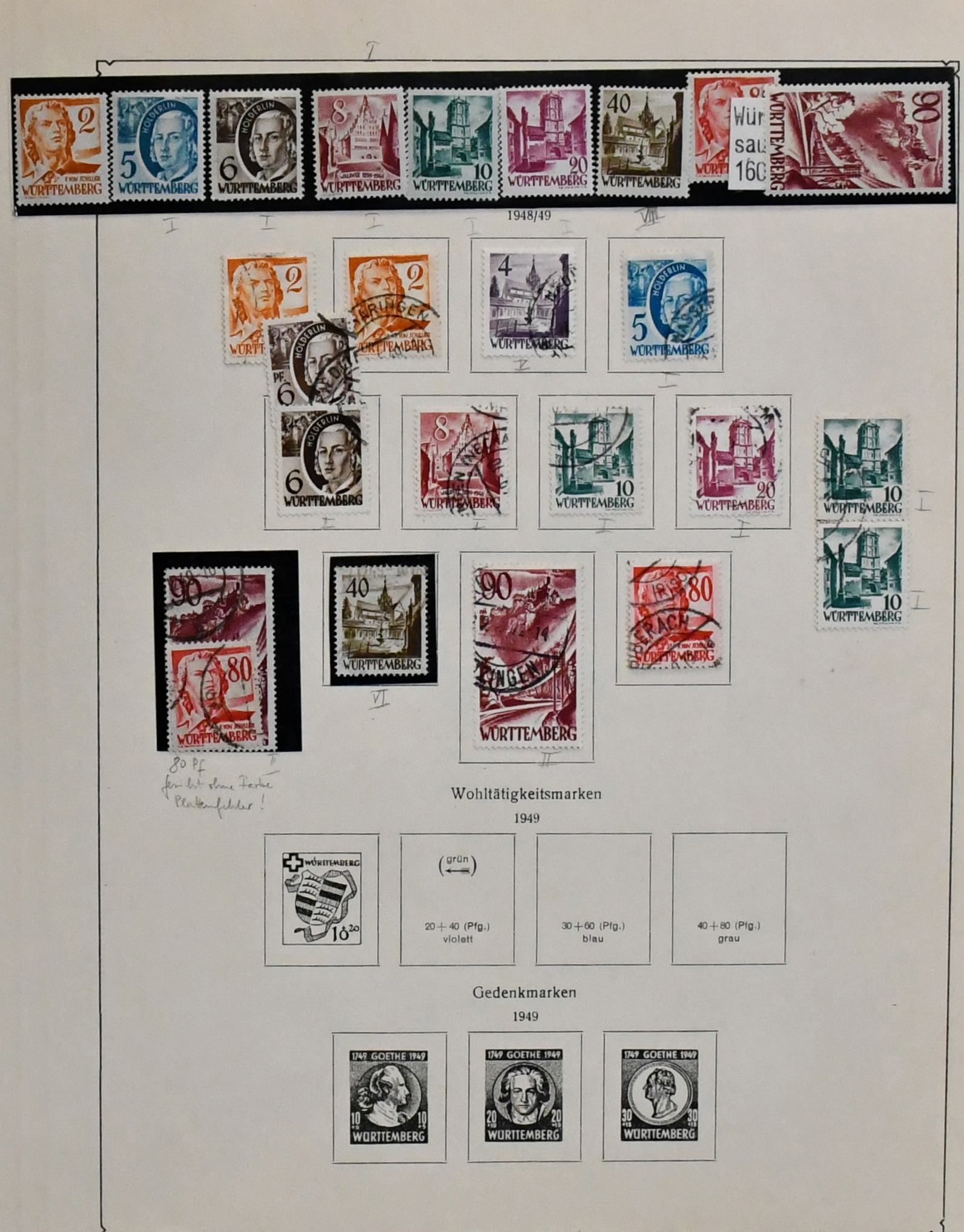 Französische Zone, 1945/49, gest. Slg. mit Allg. Ausgabe, Baden Nr. 37, 38, 54/56, Rheinl.-Pfalz Nr. 1/41, ohne Nr. 36, kpl. (Mi 239,-), 49/52, Württemberg Nr. 1/37 (276,-), 44/52 (211,-) usw., auf Vordrucken. Mi. 1350,-