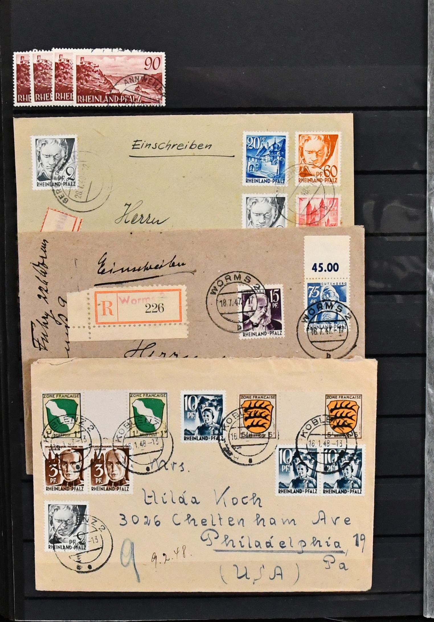 Französische Zone, meist postfr. Partie mit u.a. Baden dreimal Nr. 37, zweimal Nr. 38/41A, Nr. 46 und 50/52, Rheinland-Pfalz zweimal Bl. 1, Nr. 42/45A, Württemberg Nr. 26/27 in Viererblöcken, alle genannten postfrisch, besserer Zwangszuschlagsausgaben etc. Mi. 2500,-