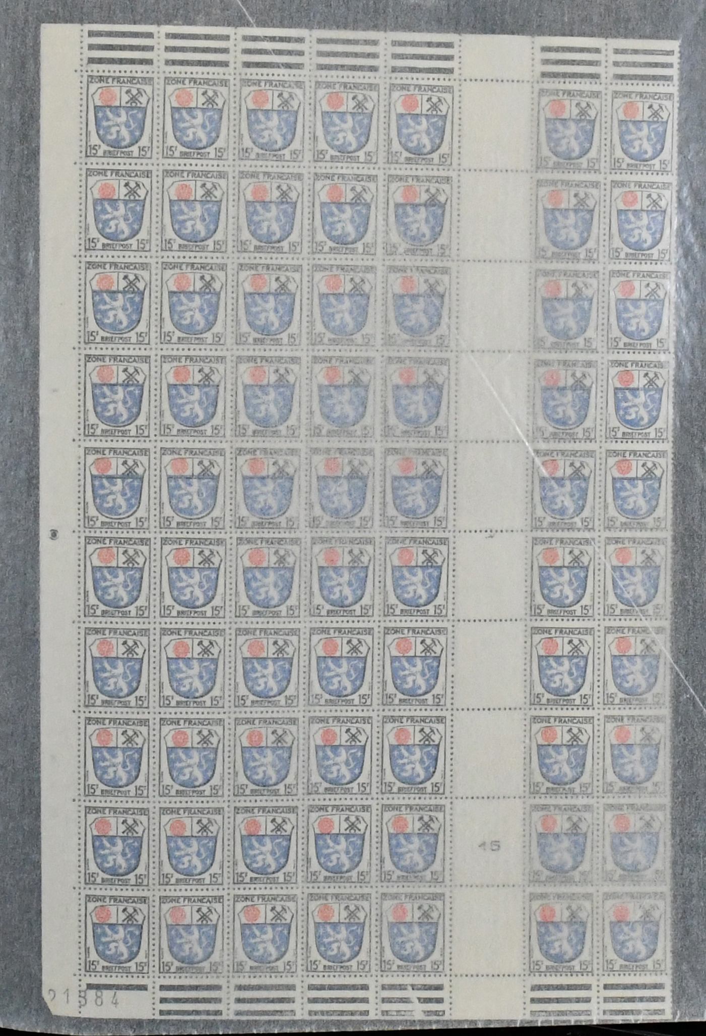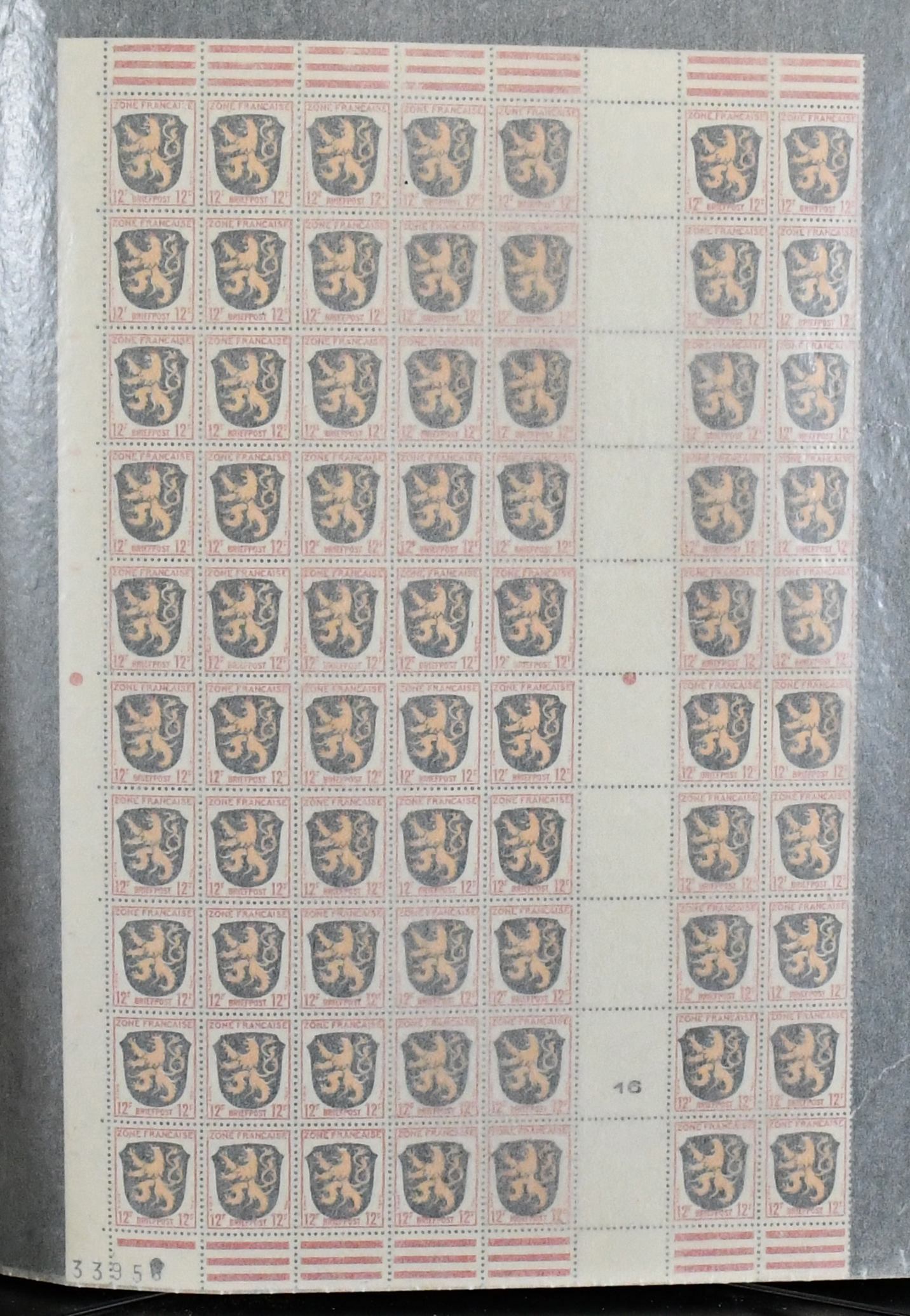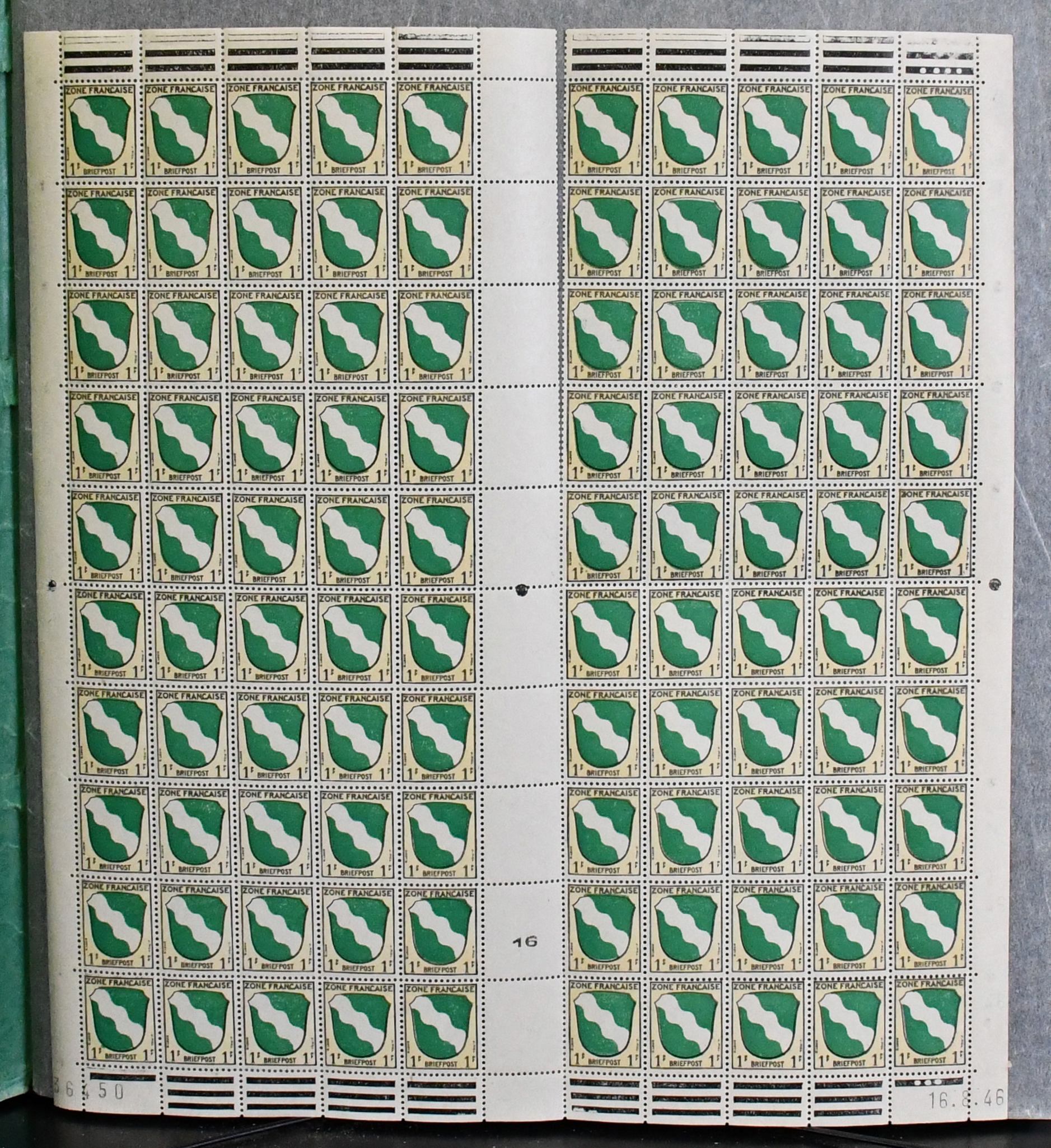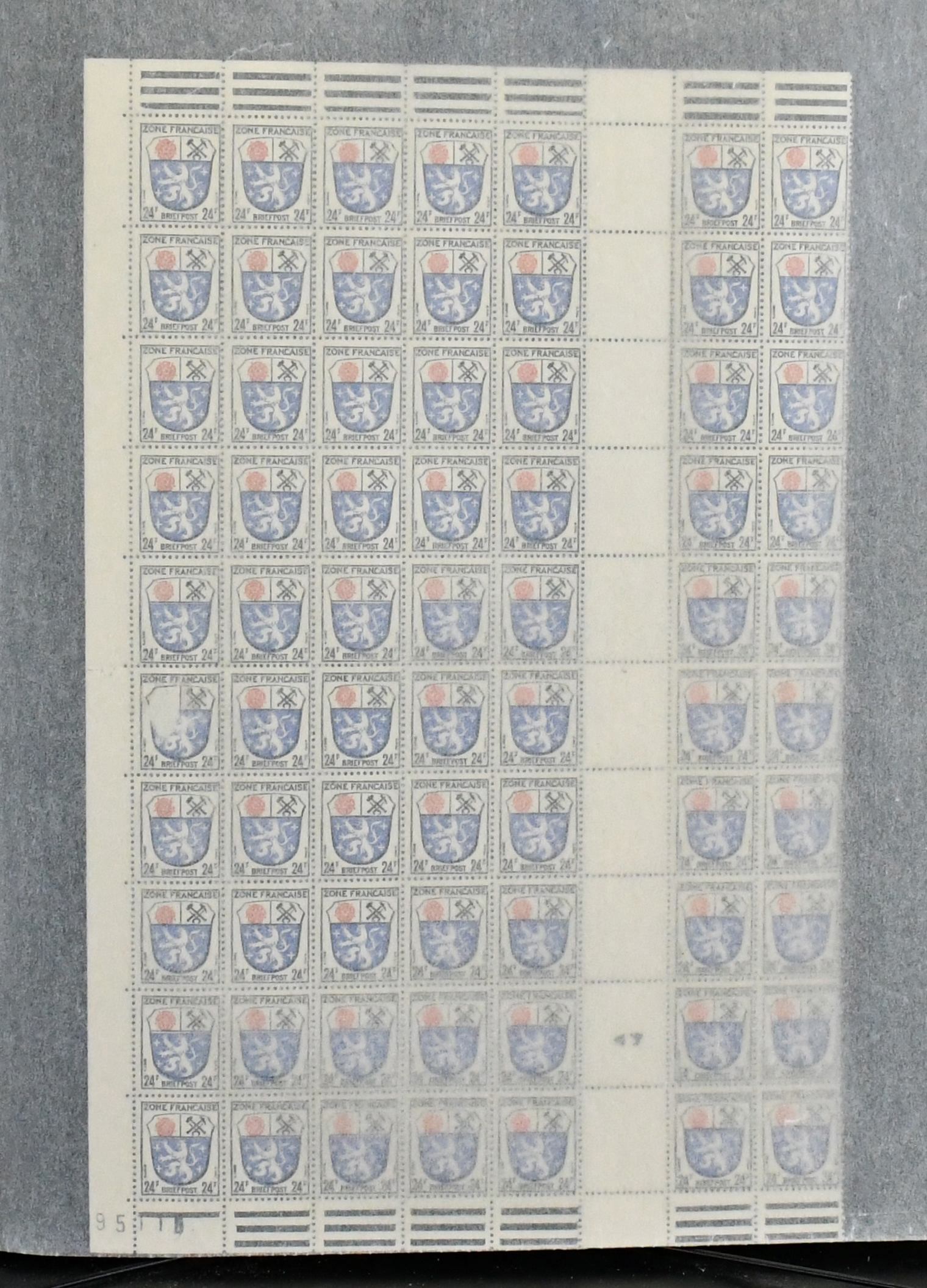 Französische Zone, Allg. Ausgabe, Partie von 1900 postfr. Werten in Bogenteilen sowie 12 kompletten Bogen. Dabei alleine 200 Zwischenstegpaare (diese alleine 1200,- Mi.)