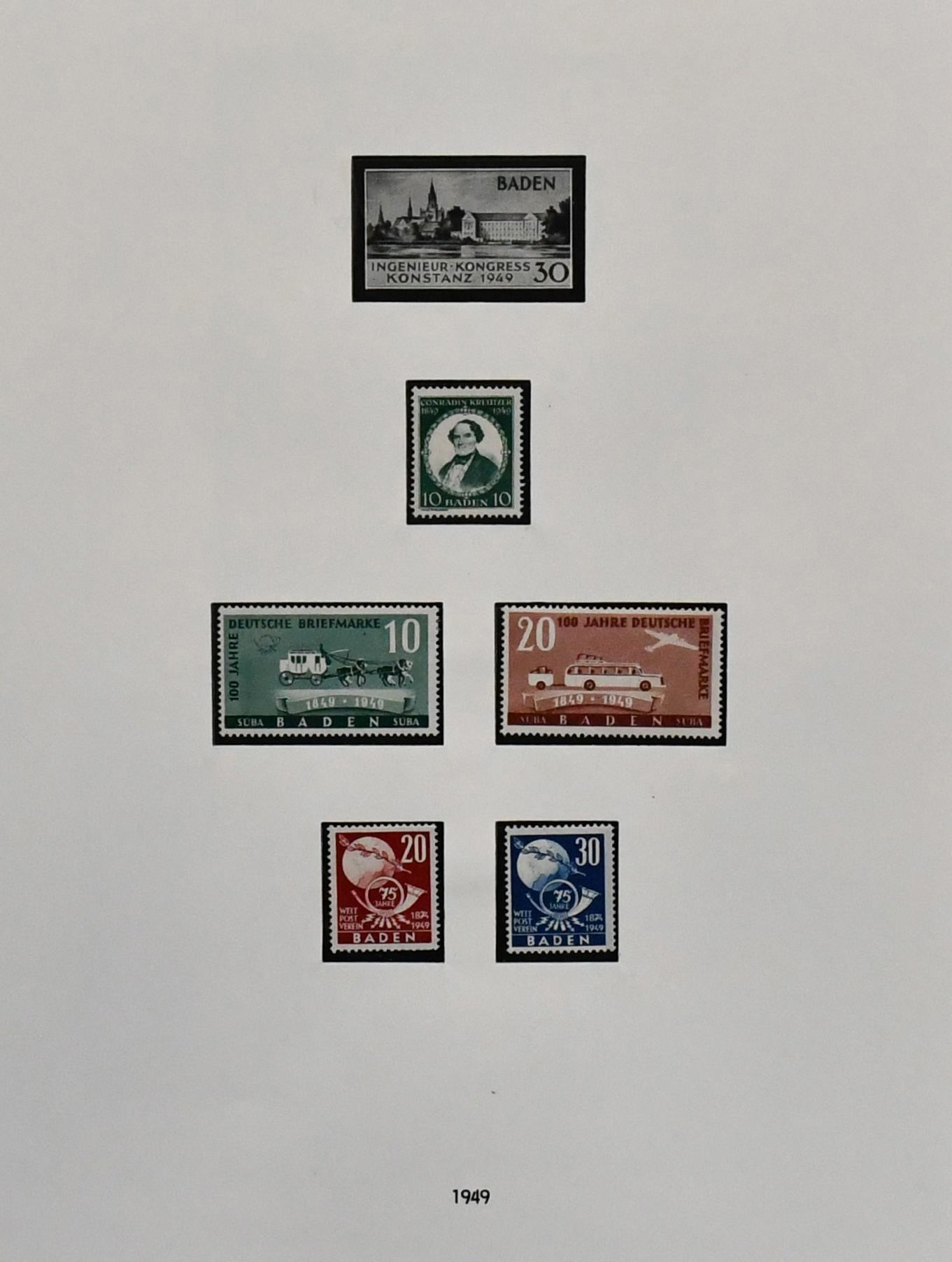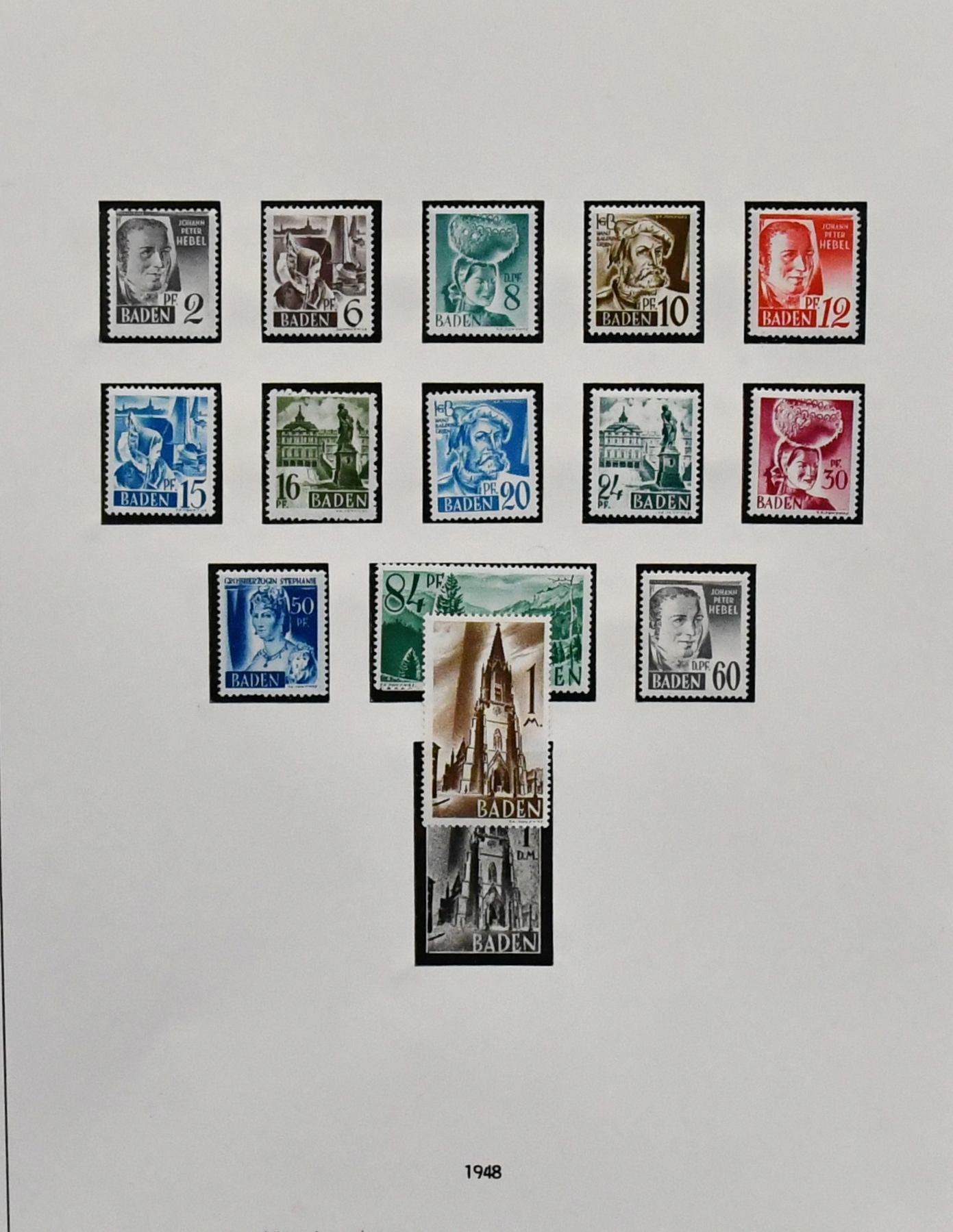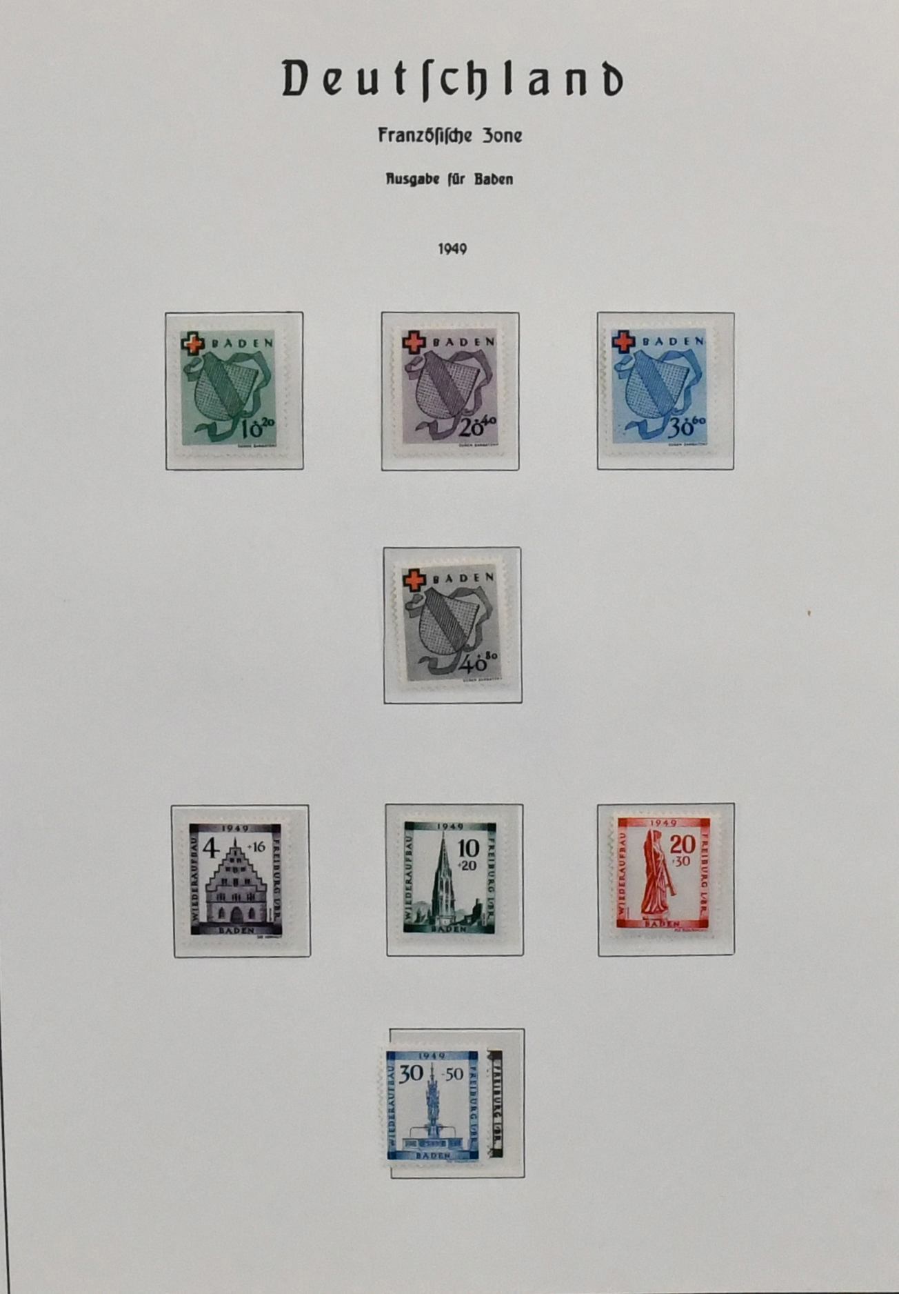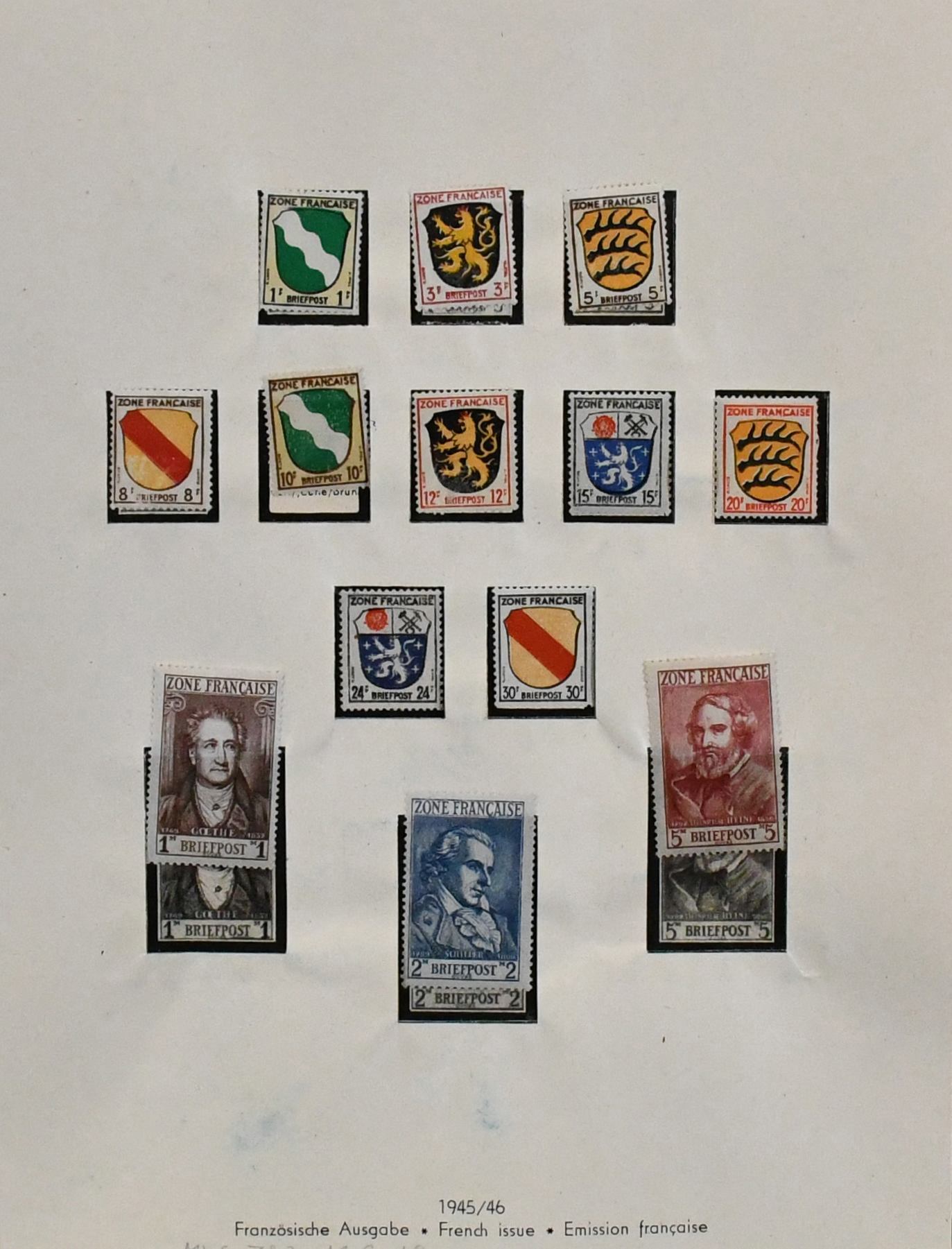 Französische Zone, 1945/49, postfr./ungebr. Slg. mit Allg. Ausgabe Nr. 1/13, Baden Nr. 1/37, 47/57, Rheinland-Pfalz Nr. 42/52, Württemberg Nr. 28/52 usw., auf Leuchtturm-Vordrucken