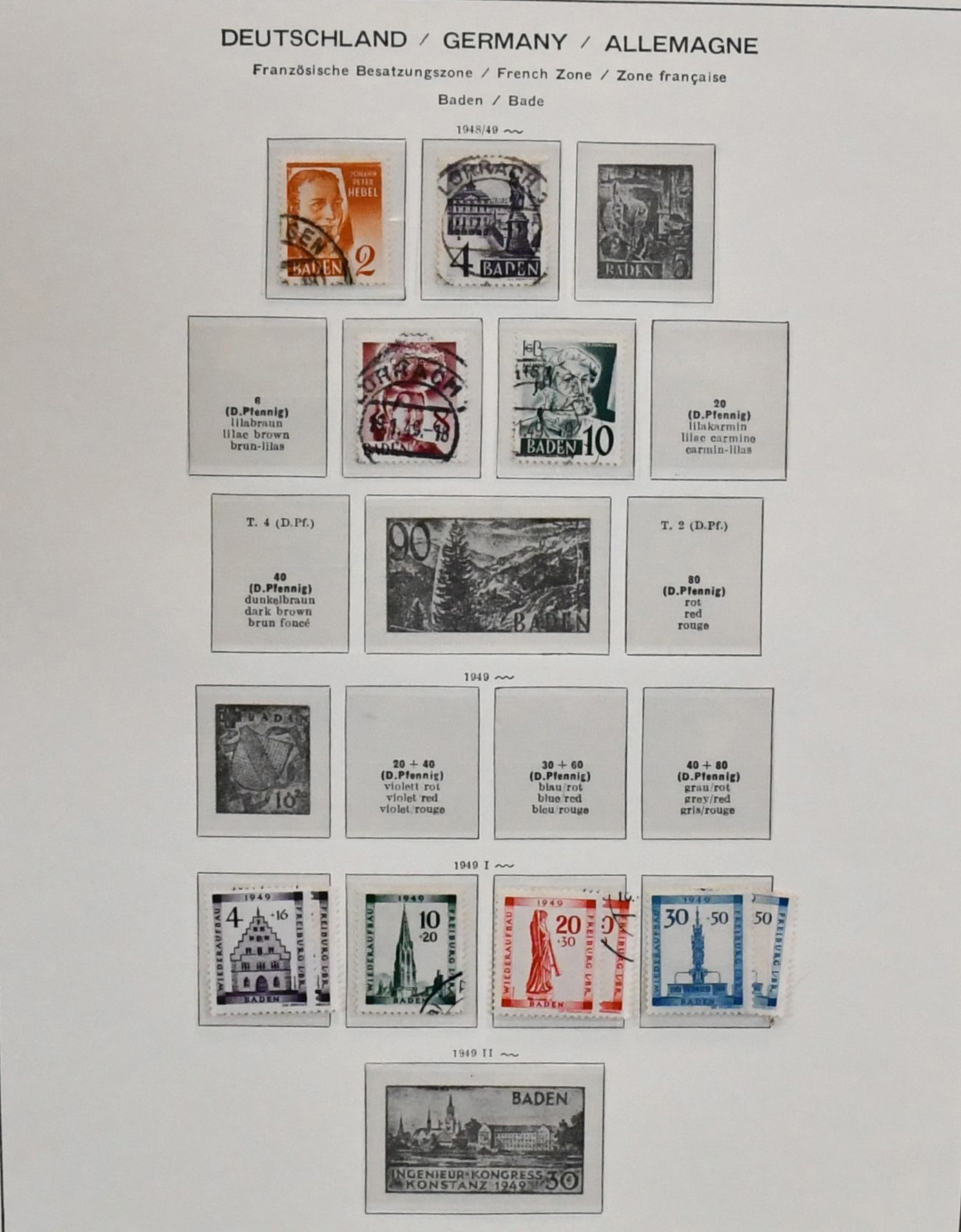 Französische Zone, 1945/49, Slg. mit Allg. Ausgabe Nr. 1/13 gest. (Mi. 250,-), Baden Bl. 1A/B, Rheinland-Pfalz Nr. 46/52 gest. (Mi. 178,-), Württemberg Nr. 37/39 gest. (Mi. 190,-) usw., auf SAFE-Dual-Vordrucken