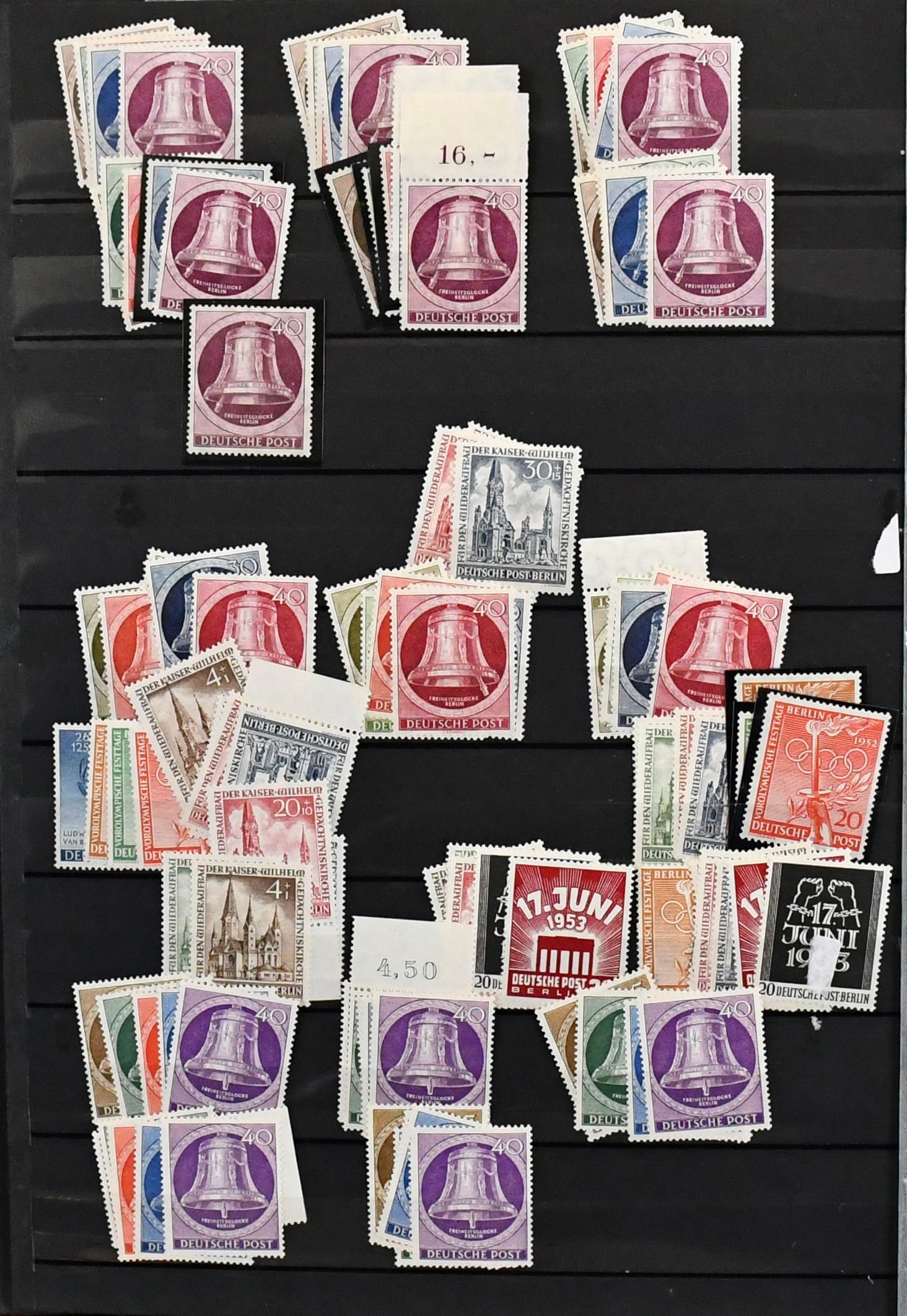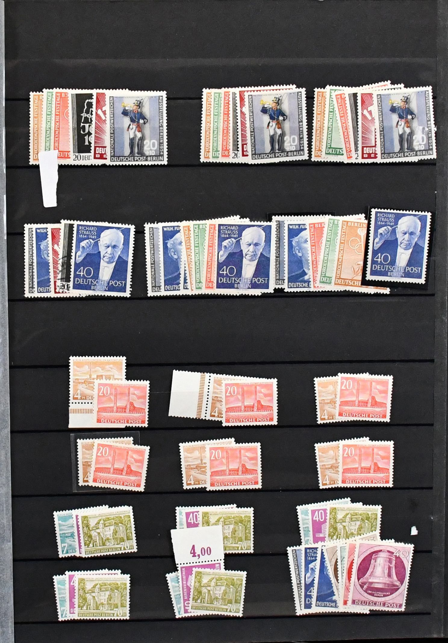 Berlin, 1948/1990, riesiger postfrischer, anfangs wenig ungebr. und gest. Bestand, chronologisch in drei dicken Lageralben. Dabei viele bessere Ausgaben, u.a. etliche Aufdruckwerte inkl. Nr. 6 u. 10 gest., gepr., Nr. 18 u. 20 postfr., gepr. Schlegel, 27 mehrf., u.a. einmal auf Luftpostbrief, gute Nr. 35/41 mind. viermal gest., 68/70 gest., gepr. Schlegel, Bl. 1 höher sign. Schlegel, Nr. 71/74 mehrf., teils auf Belegen, etliche Glocken-Sätze, Nr. 121/23 viermal postfr. usw. Der gesamte Michelwert beträgt rund 40.000,-, wobei nur die ersten Jahre von 1948-1954 bereits einen Katalogwert von 12.000,- haben