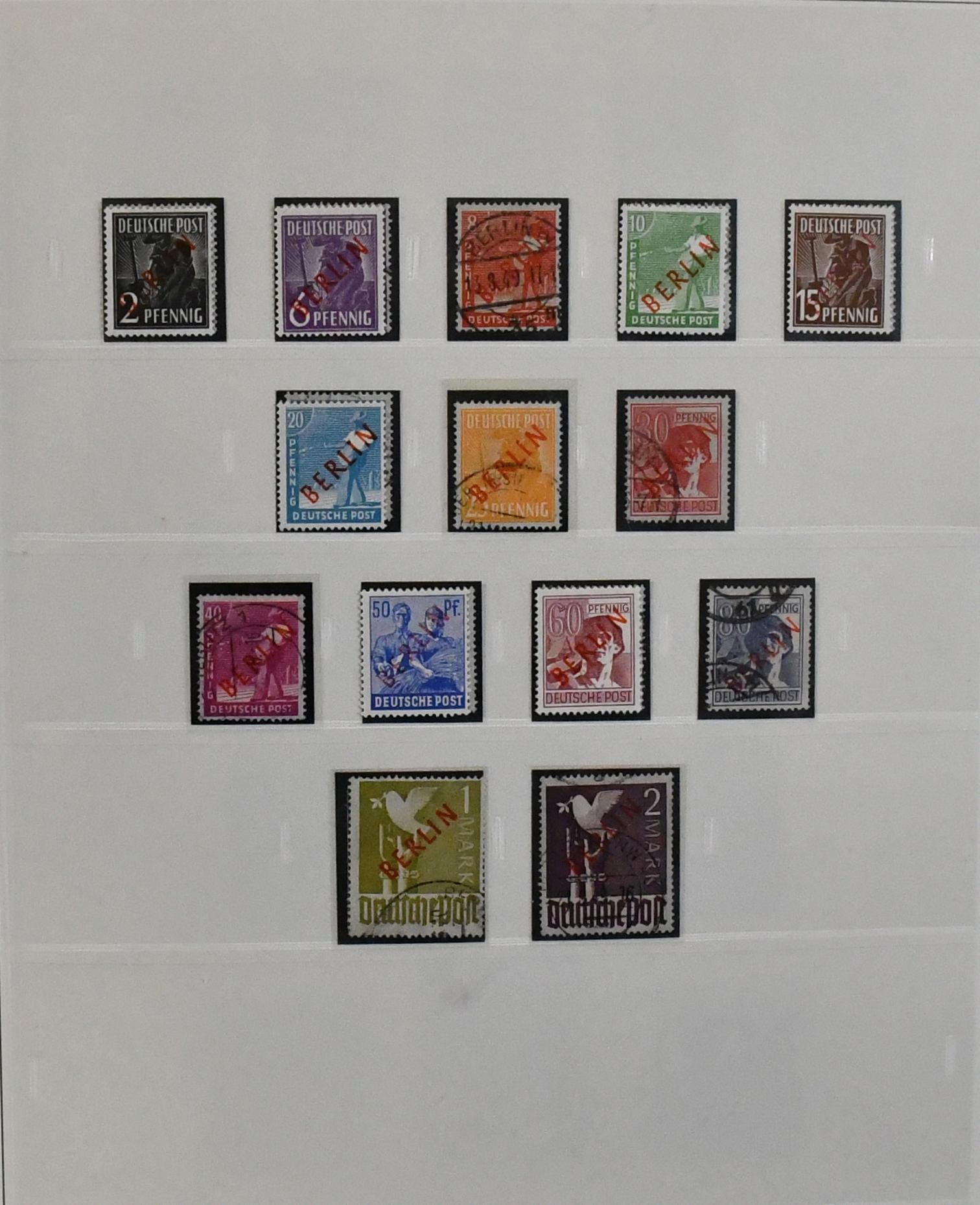 Berlin, 1948/90, sauber gest. Slg. mit komplettem Rotaufdruck-Satz, Nr. 35/41, 61/63, sowie den Jahrgängen 1950-1990 kpl., zusätzlich mit allen C/D-Werten und H-Bl. 22/23. Dazu postfr. Slg. ab Nr. 1/17, die Jahrgänge 1952-1990 kpl., alles in zwei neuwertigen SAFE-Dual-Vordruckalben. Mi. 6500,- + Alben
