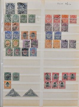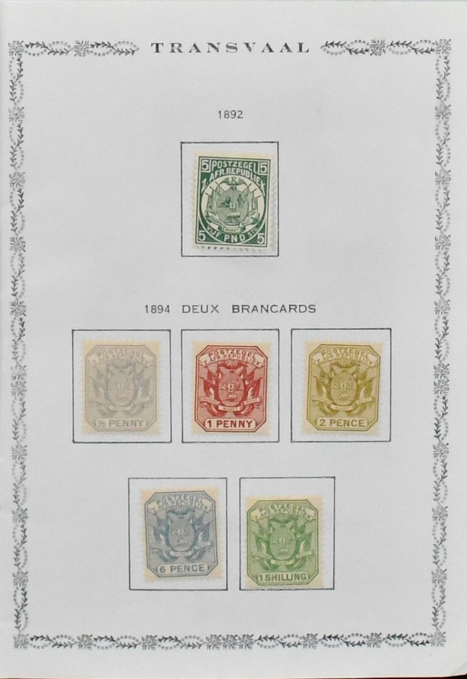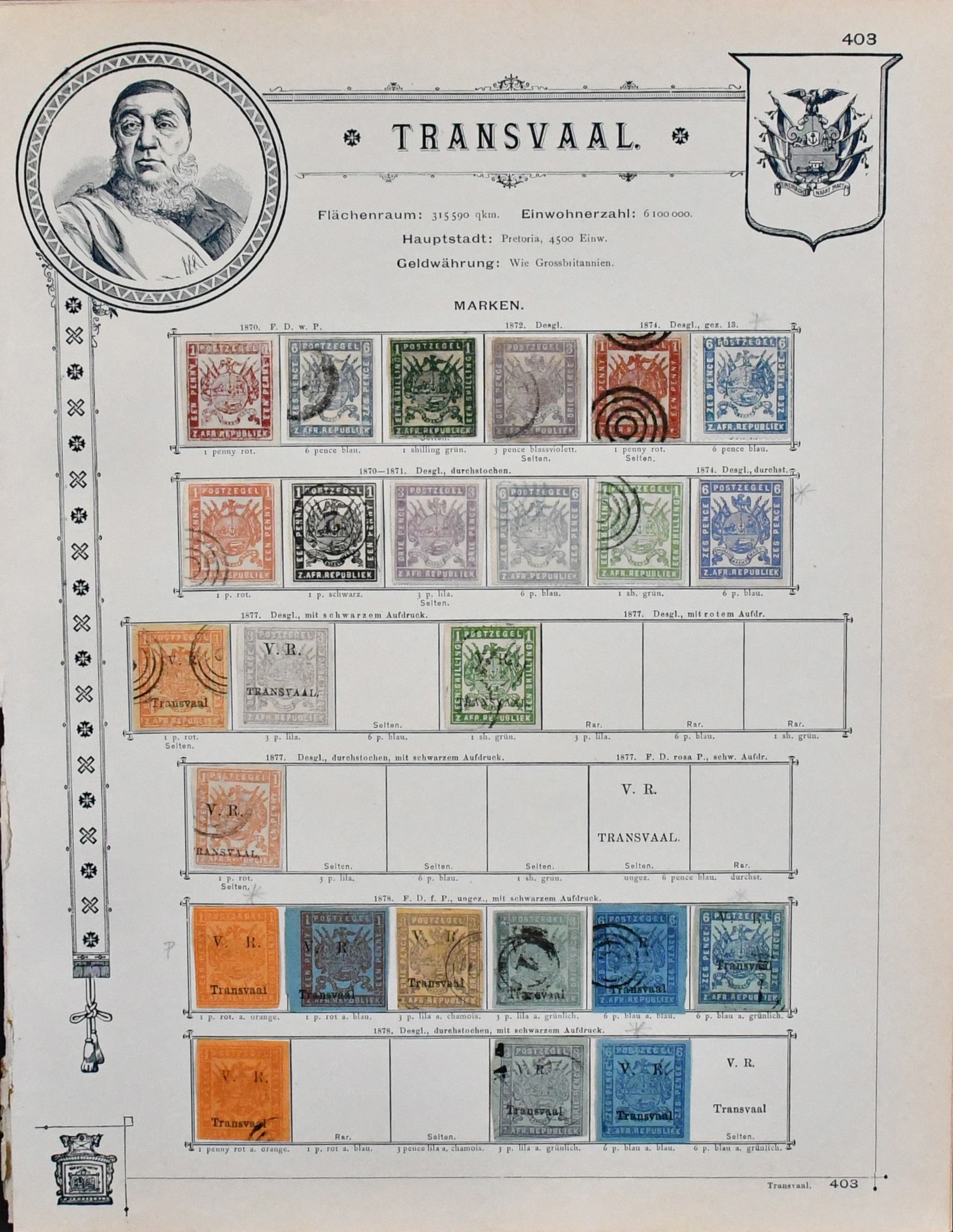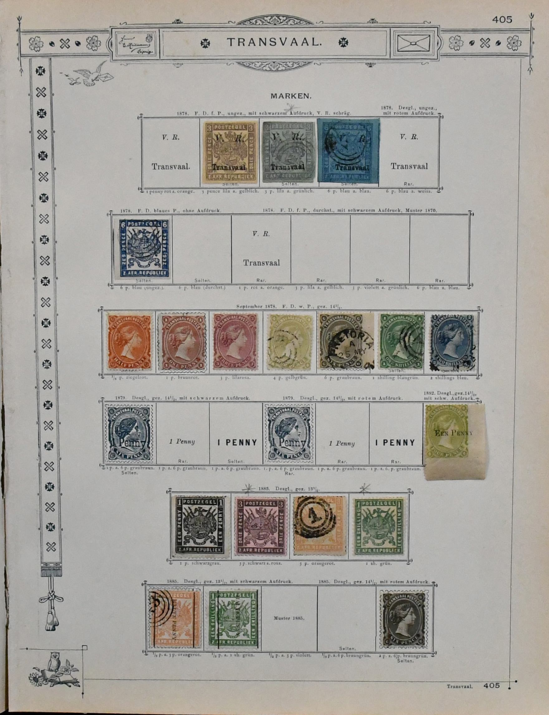Transvaal, 1870-1905, interessante, gest. und ungebr. Slg. auf alten Albumseiten, dabei u.a. Nr. 3 gest., 6 gest., Nr. 74 ungebr. Bogenecke, 79-80 gest. usw., ferner Wappen-Marken reichhaltig inkl. Nr. 95 ungebr. (Aufdruck vermutlich falsch, daher unberechnet), bessere Ausgaben Edward, z.B. Nr. 111 ungebr., sowie ein Heftchen "Collection de Timbres du Transvaal" mit eingeklebten Nachdrucken