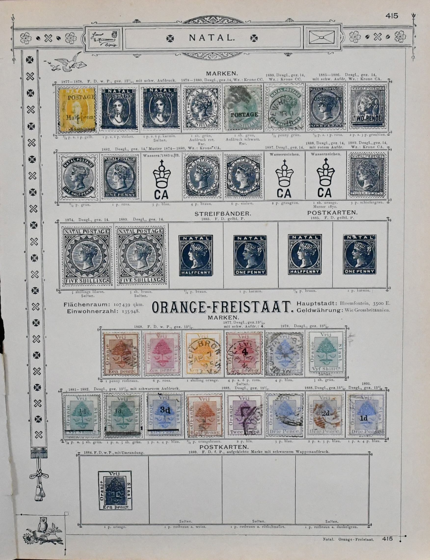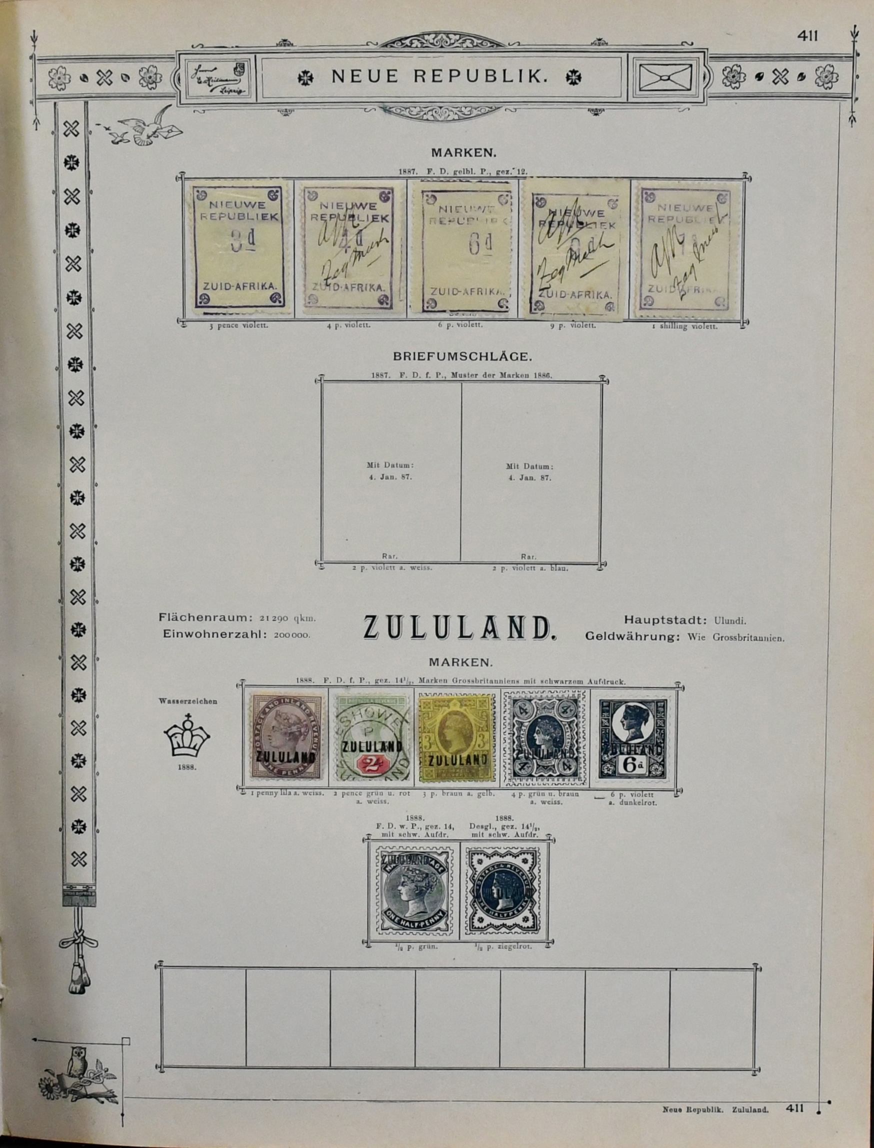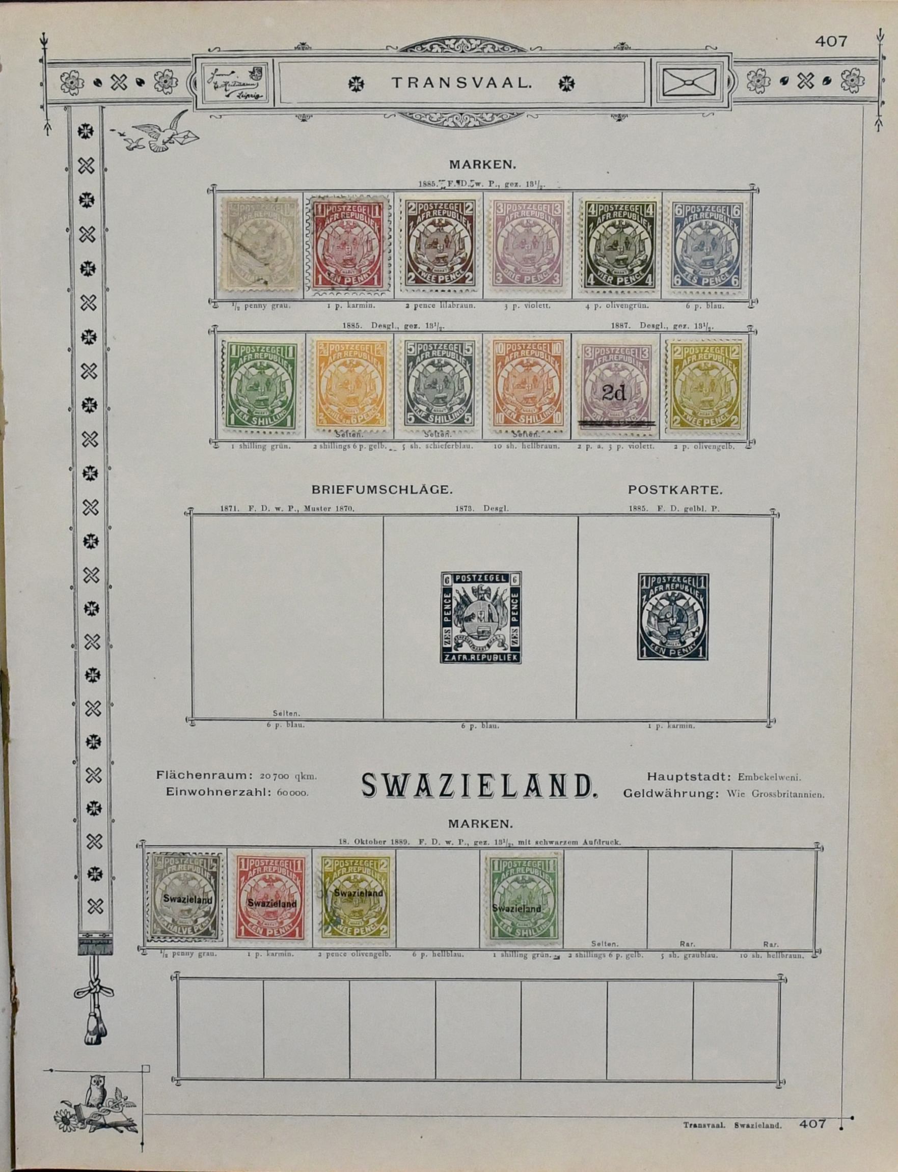 Südafrika, überwiegend gest. Slg. in untersch. Erhaltung auf alten Goldschnitt-Vordrucken, dabei Transvaal mit u.a. Nr. 73bB, 74-80, 77 ungebr. (aus der Bogenecke), Swaziland Nr. 1-3, 5, Oranjefreistaat, Natal, Neue Republik mit Nr. 4 u. 24 ungebr. etc., einiges haftend, aber sicher ablösbar