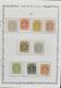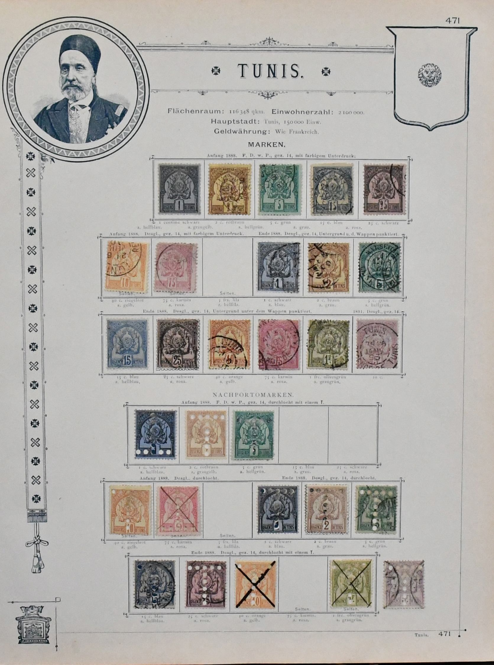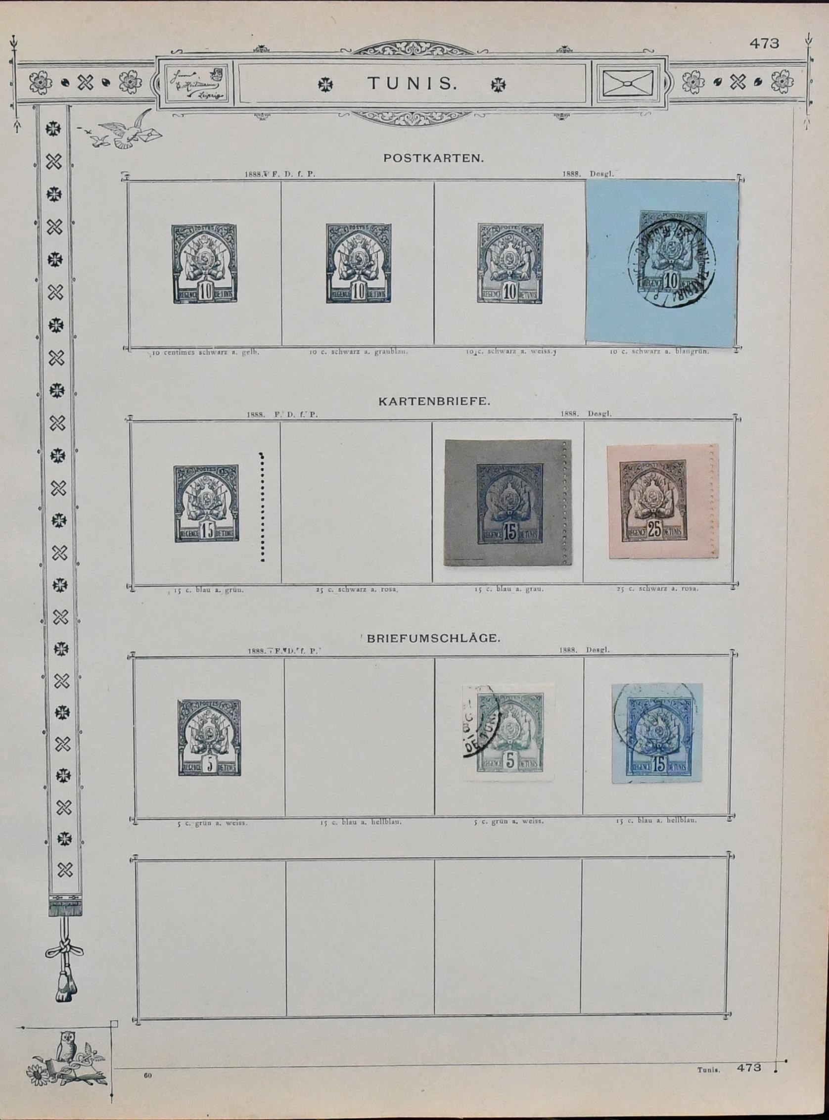 Tunesien, 1888, Slg. in beiden Erhaltungen auf alten Goldschnitt-Vordrucken, dabei u.a. Nr. 1-7, 9-17, sowie Portomarken mit Nr. 17 gest., auch einige Ganzsachen-Abschnitte, teils haftend, aber sicher ablösbar