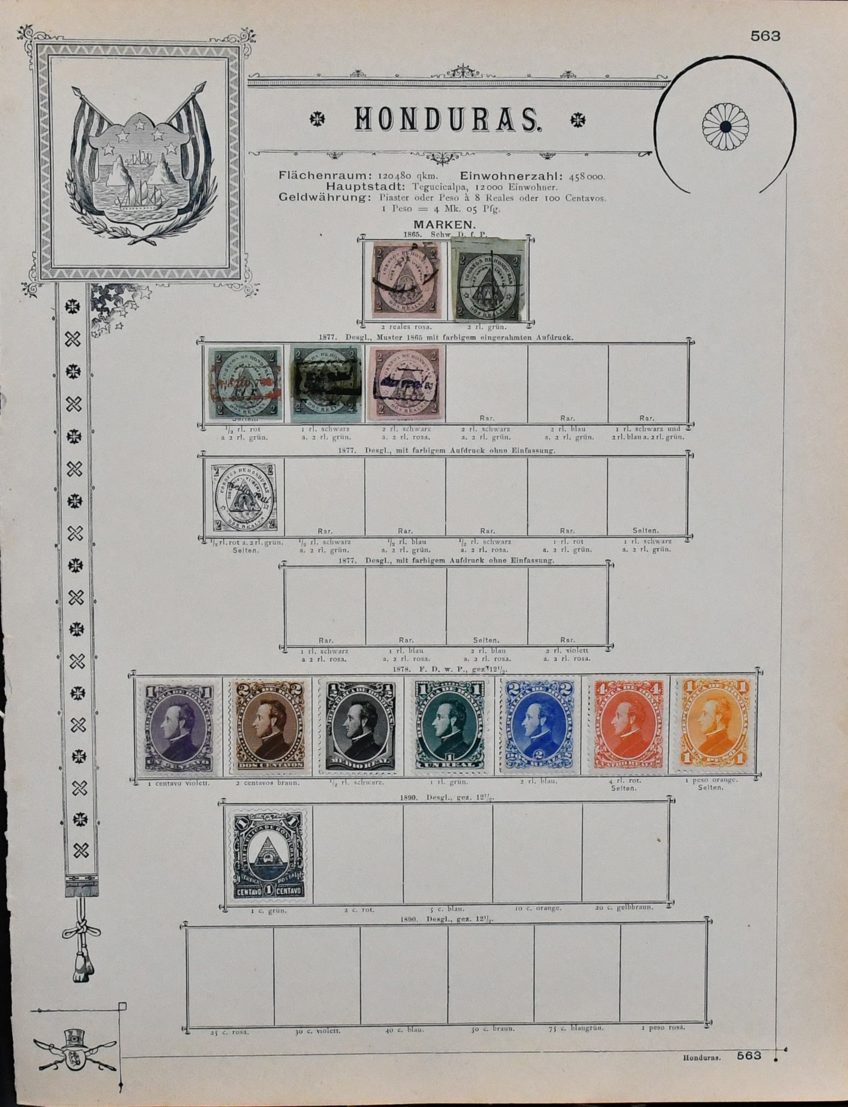 Honduras, 1866-1878, meist ungebr. Slg. auf alten Goldschnitt-Vordrucken, dabei Nr. 3 ungebr., 4a ungebr. u. 7a ungest. (teils mit altem Händlerzeichen), Marken teils haftend, aber sicher ablösbar