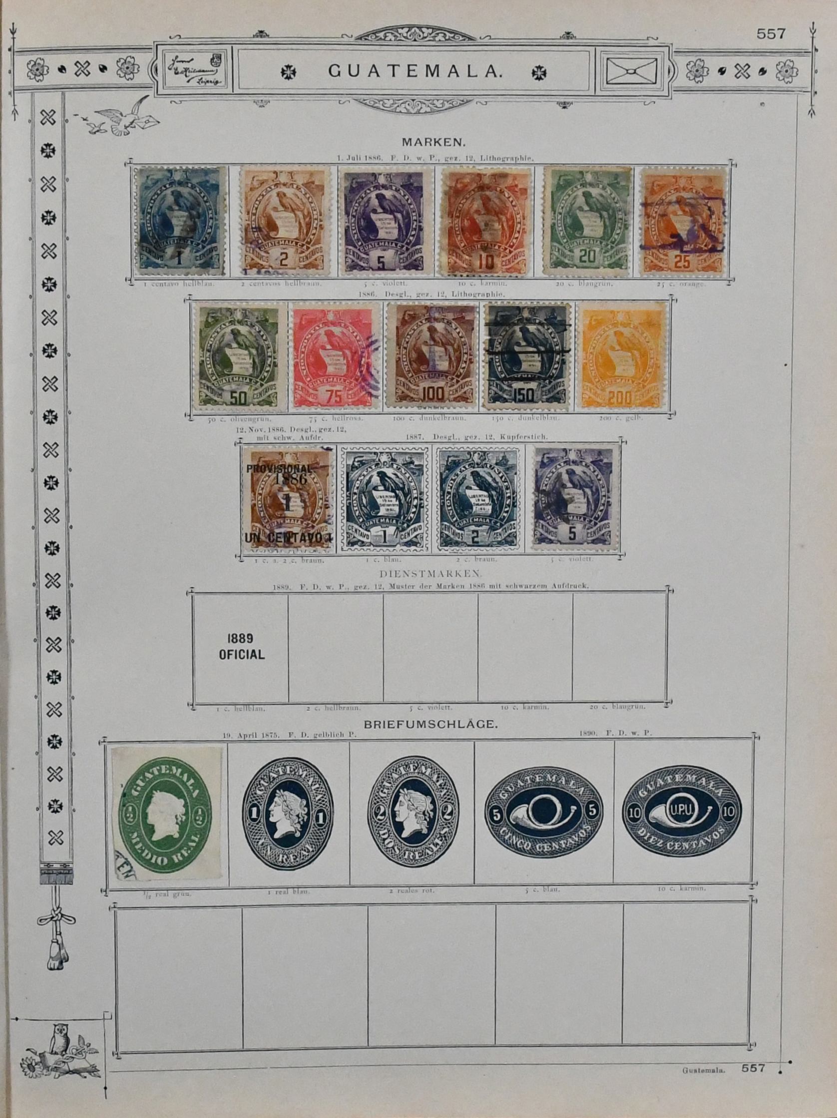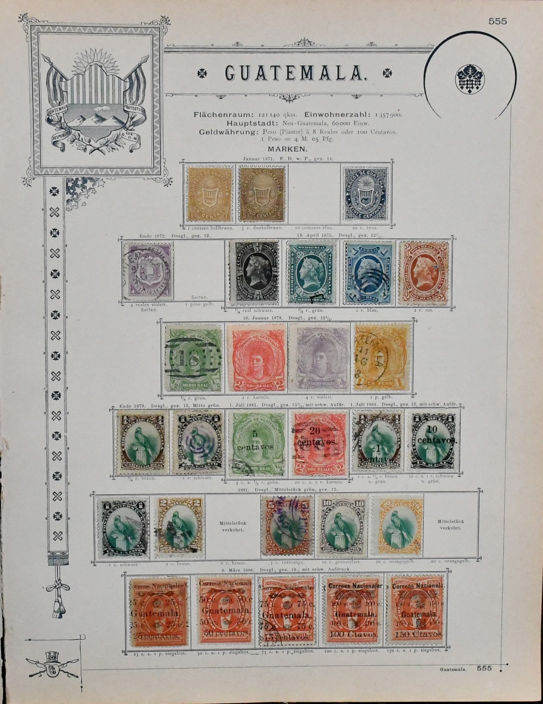 Guatemala, 1871-1886, Slg. in beiden Erhaltungen auf alten Goldschnitt-Vordrucken, dabei Nr. 1-2, 5, 7-10, 11-14, 15, 17-20 usw., Marken teils haftend, aber sicher ablösbar