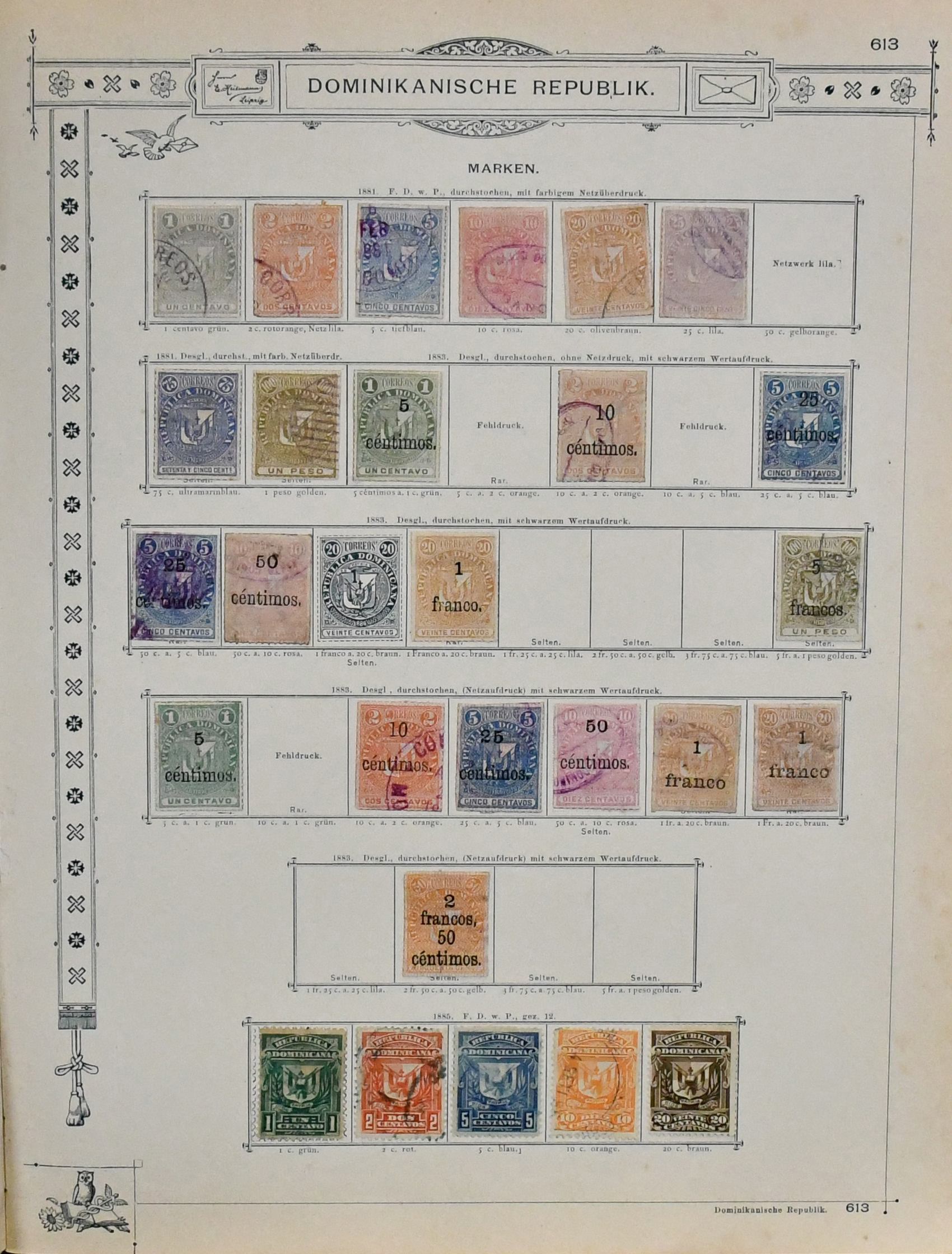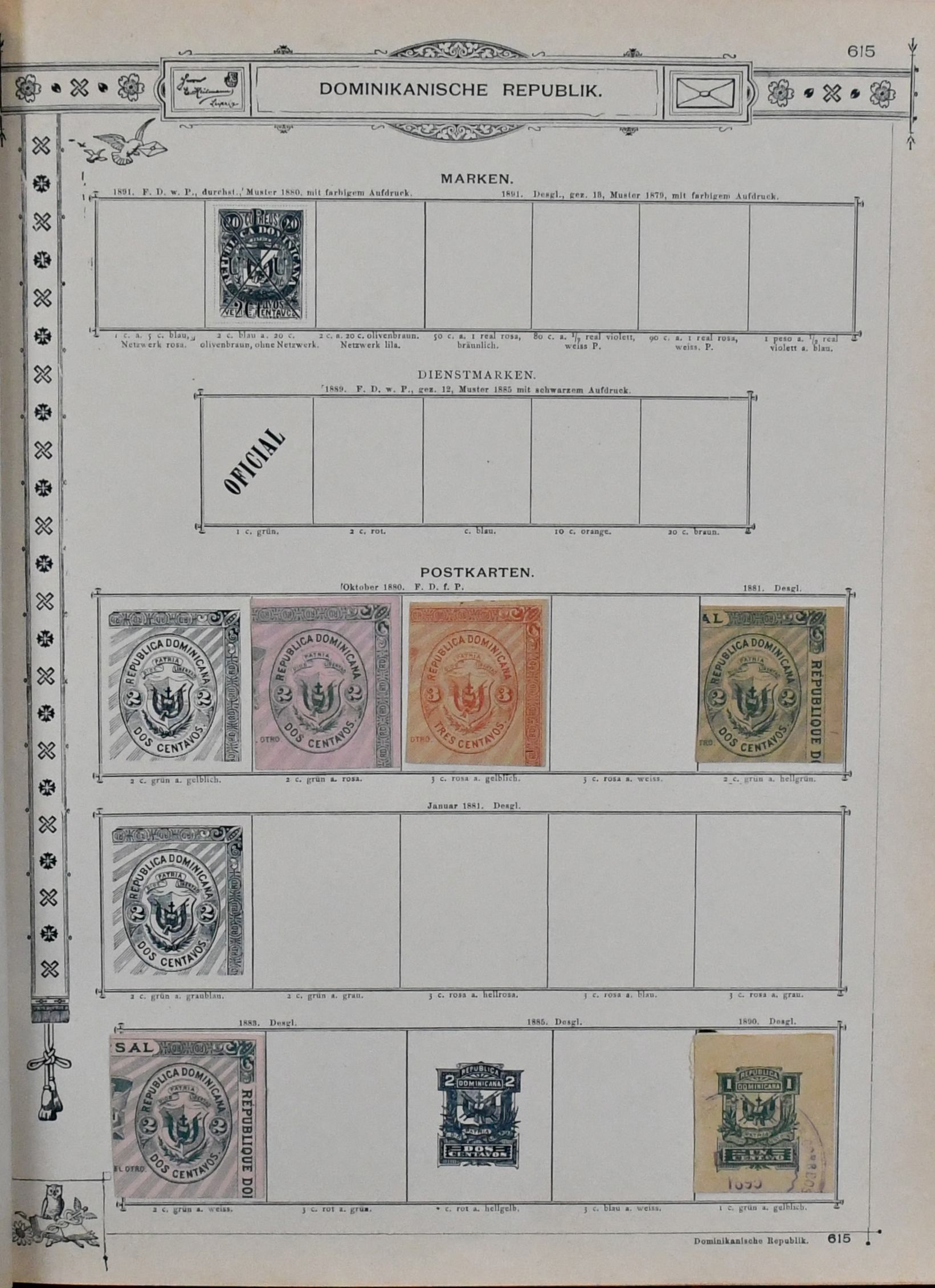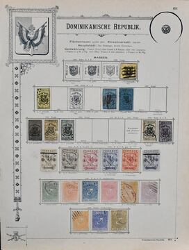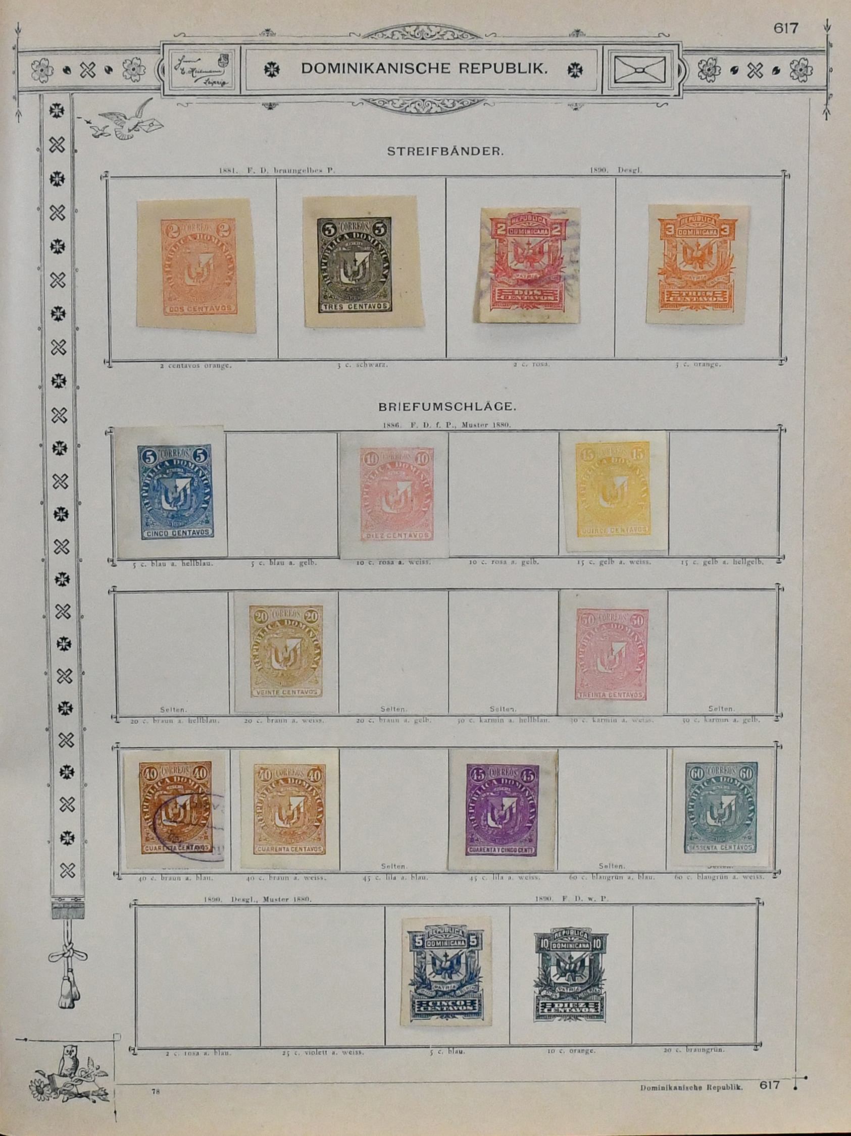 Dominikanische Republik, 1866-1885, Slg. in beiden Erhaltungen auf alten Goldschnitt-Vordrucken, dabei, neben einigen Fälschungen, auch Nr. 8x mit rotem Balkenstempel, sowie Nr. 20 gest., 25-33, 47 usw., ferner viele Ganzsachen-Abschnitte, Marken teils haftend, aber sicher ablösbar