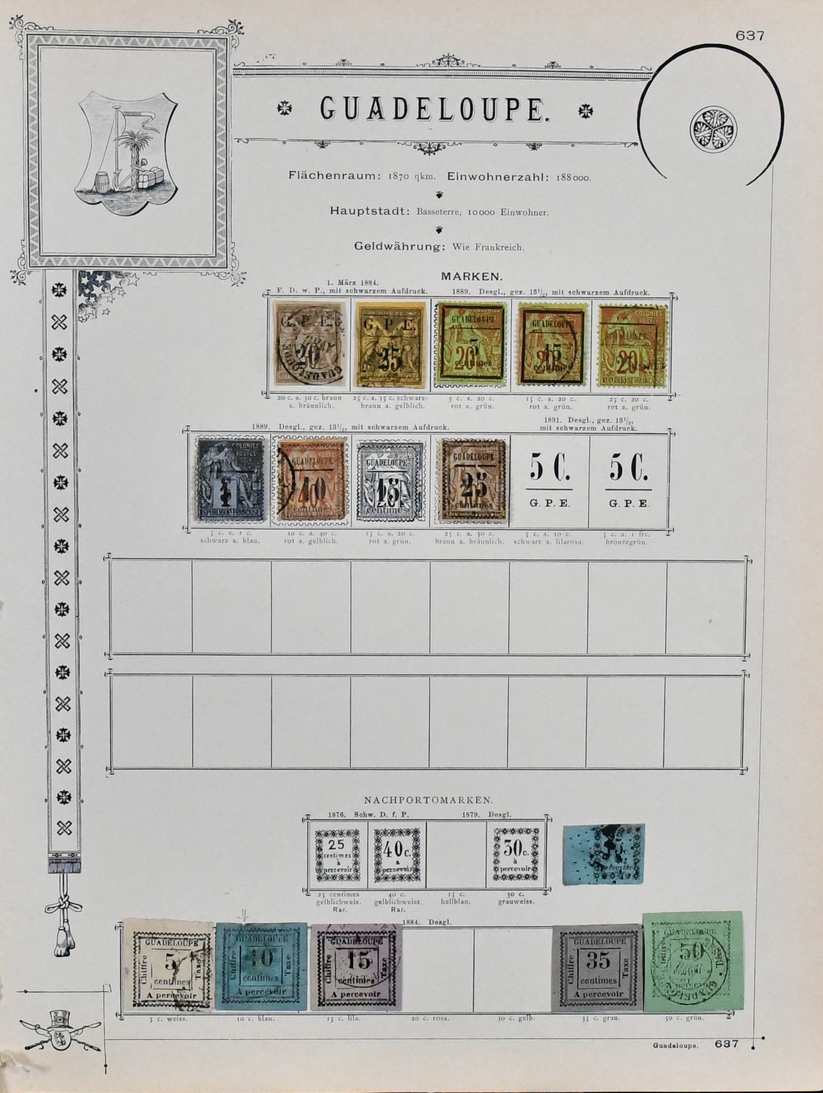 Guadeloupe, 1884-1889, meist gest. Sammlung auf altem Goldschnitt-Vordr., dabei Nr. 1 u. 2 gest., 4-5 gest., 6 u. 9 ungebr. etc., ferner Portomarken mit Nr. 1 gest. vom linken Bogenrand, 6-8 gest., 11 ungebr. u. 12 gest., Marken teils haftend, aber sicher ablösbar