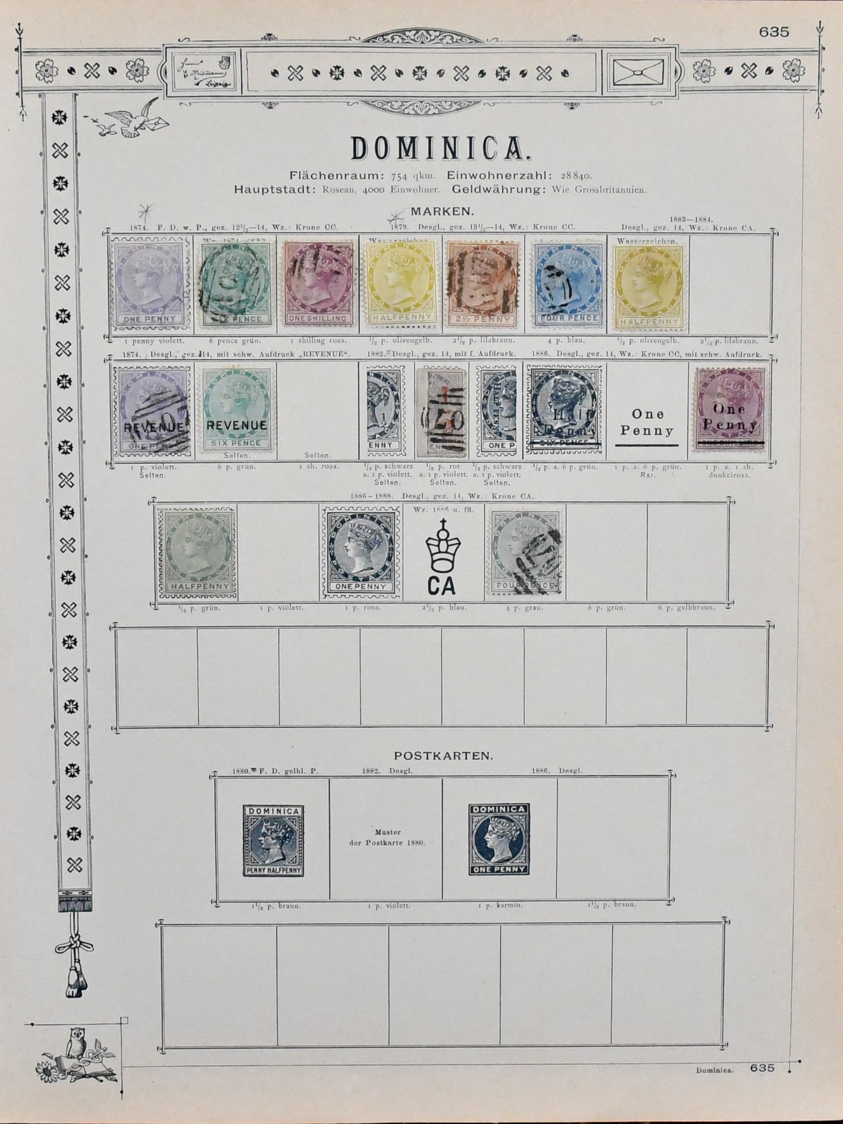 Dominica, 1874-1886, meist gest. Slg. auf altem Goldschnitt-Vordr., dabei Nr. 2, 5-6, 8 usw., Marken teils haftend, aber sicher ablösbar