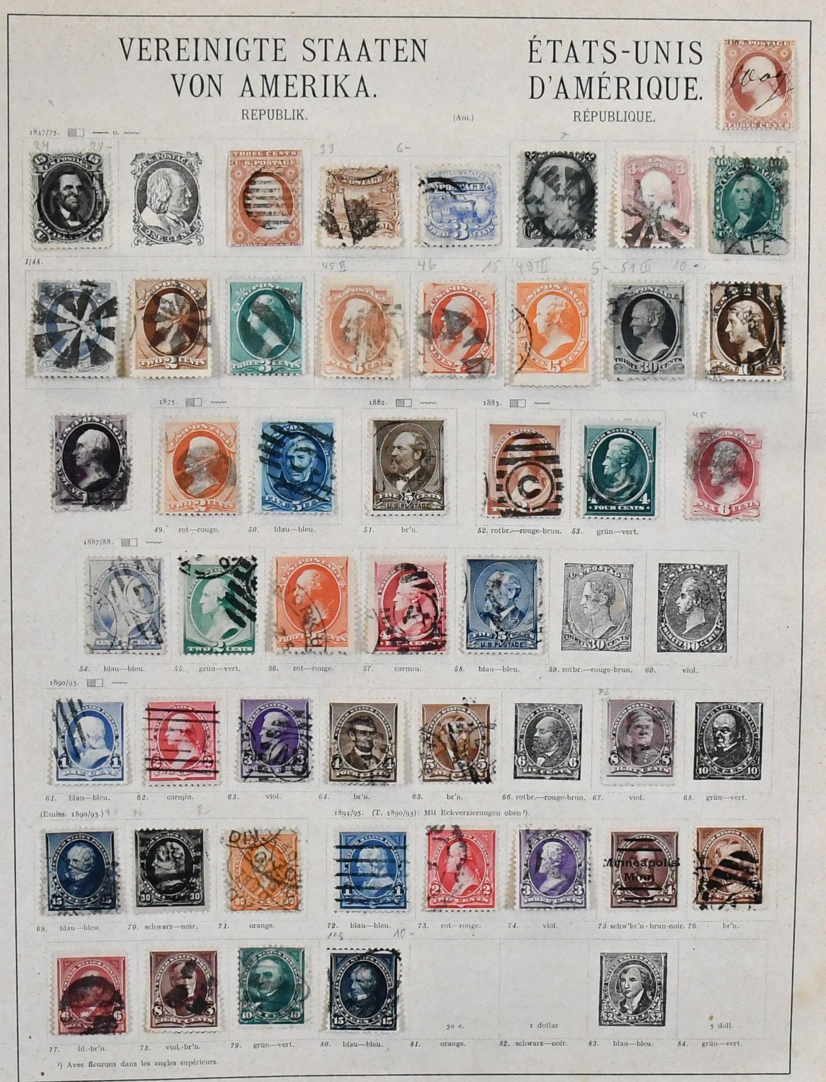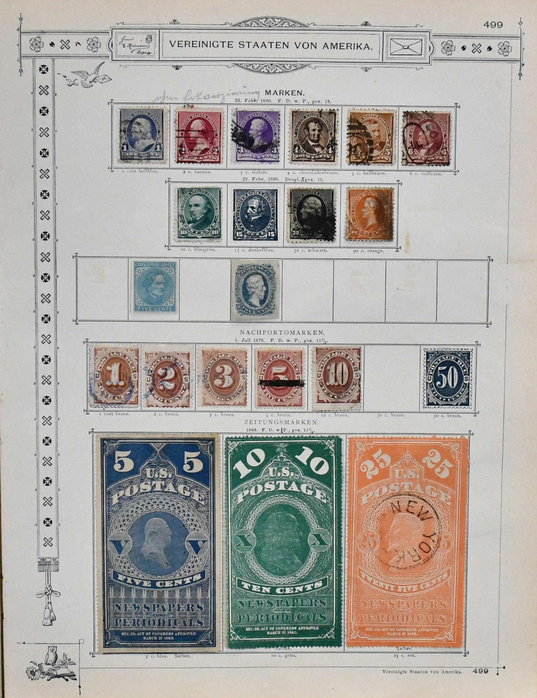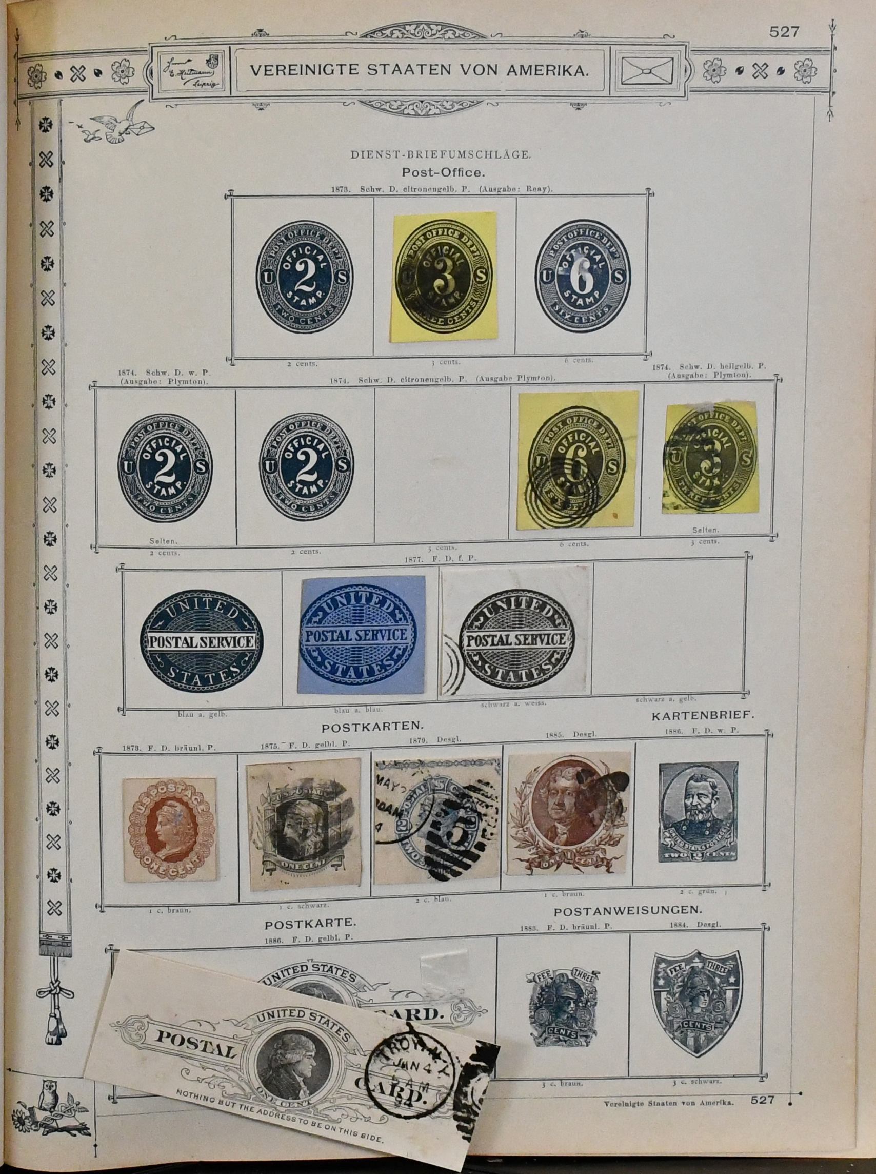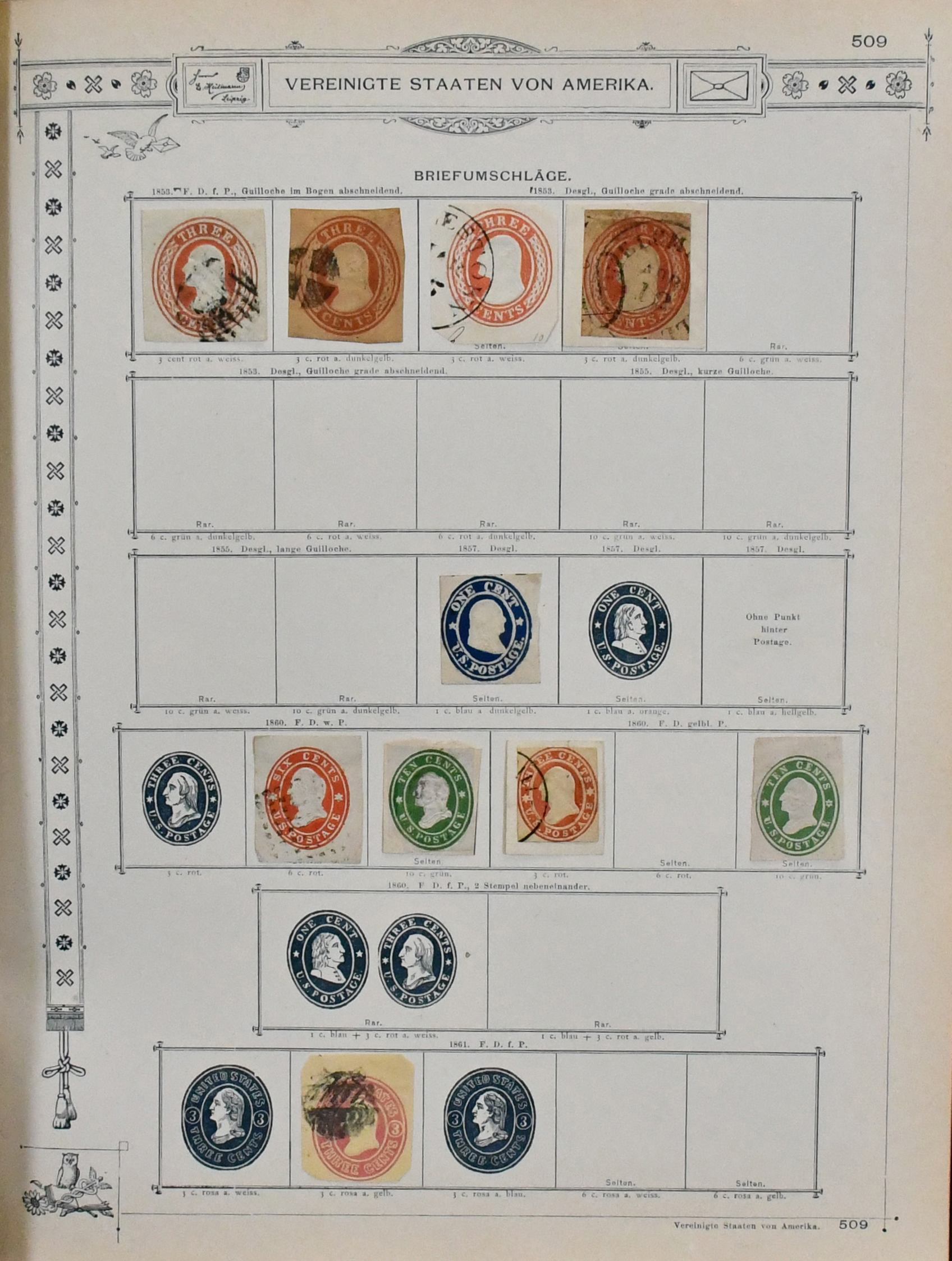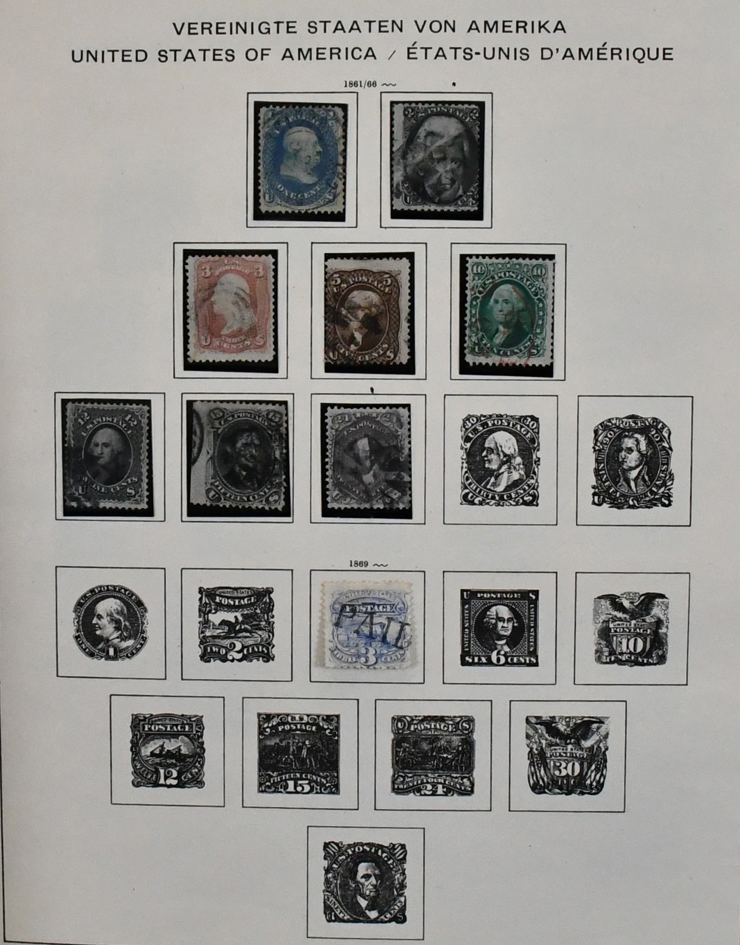 USA, 1851-1890, meist gest. Slg. in untersch. Erhaltung auf alten Goldschnitt-Vordrucken, ab Nr. 4, mit Nr. 11, 19-20, 22, 29, 36W, 36-46, 52, 53-59, 70-71 usw., ferner Zeitungs- und Portomarkenm sowie Dienst mit einigen höheren Wertstufen, zusätzlich viele Ganzsachen-Abschnitte (unbewertet), einiges teils haftend, aber sicher problemlos ablösbar