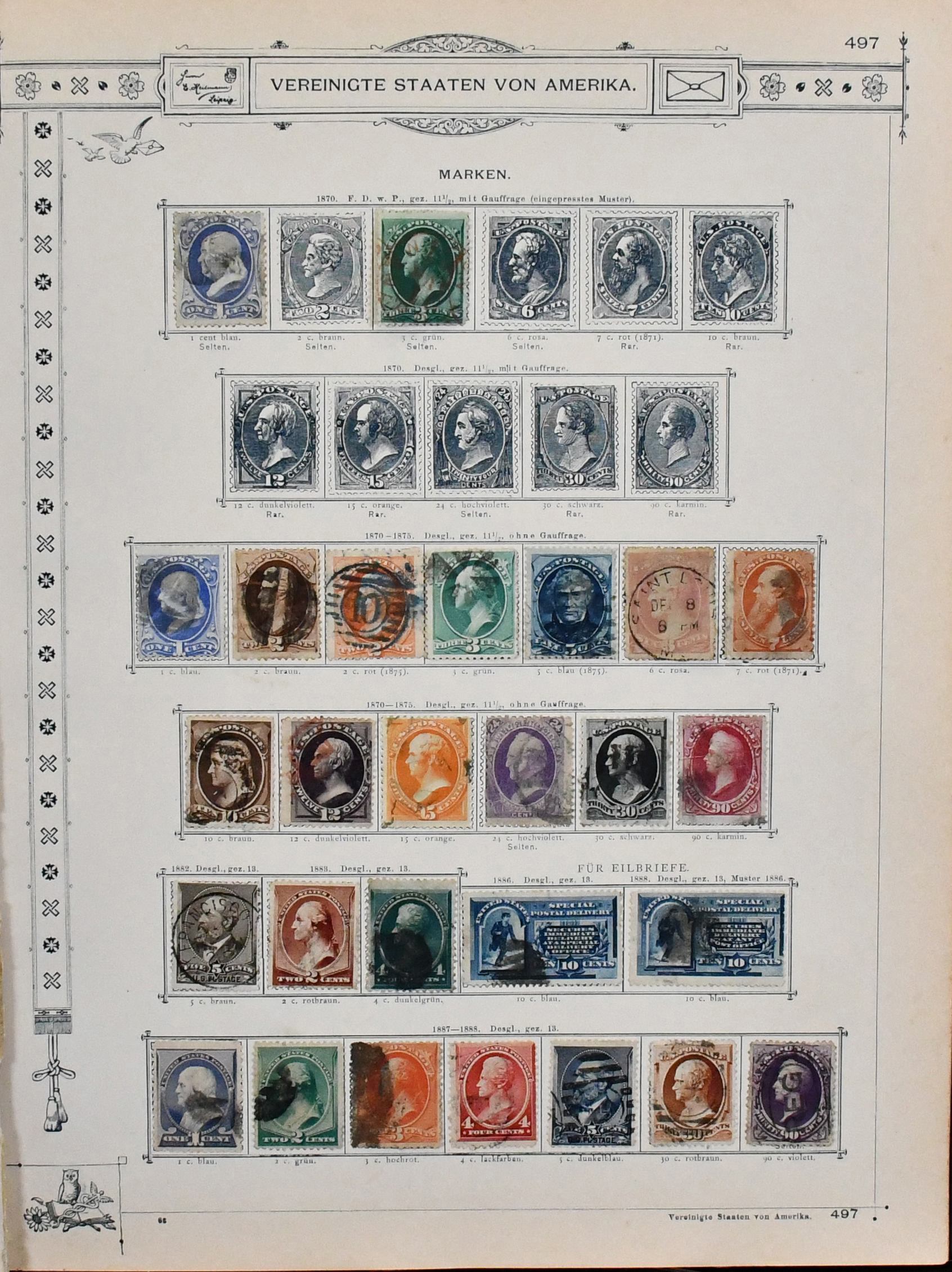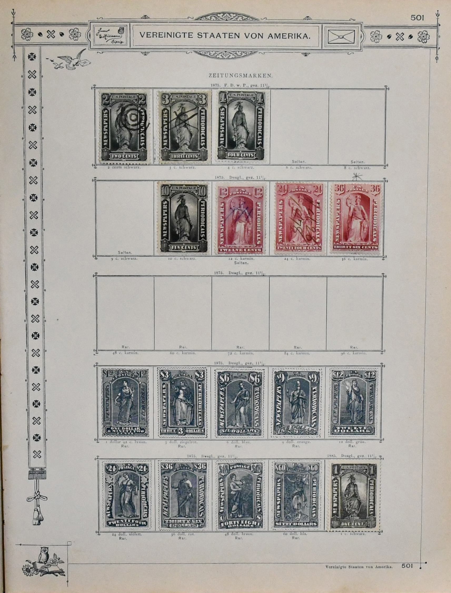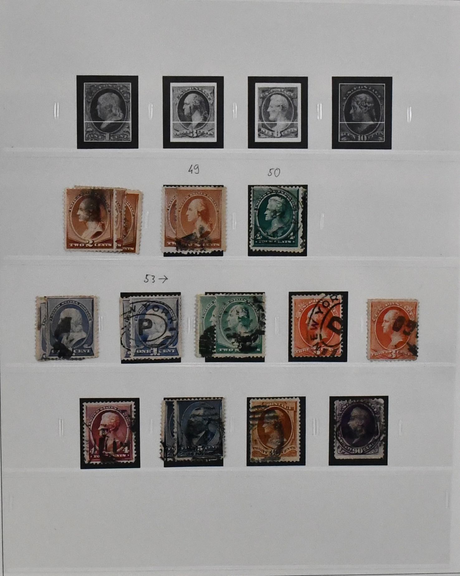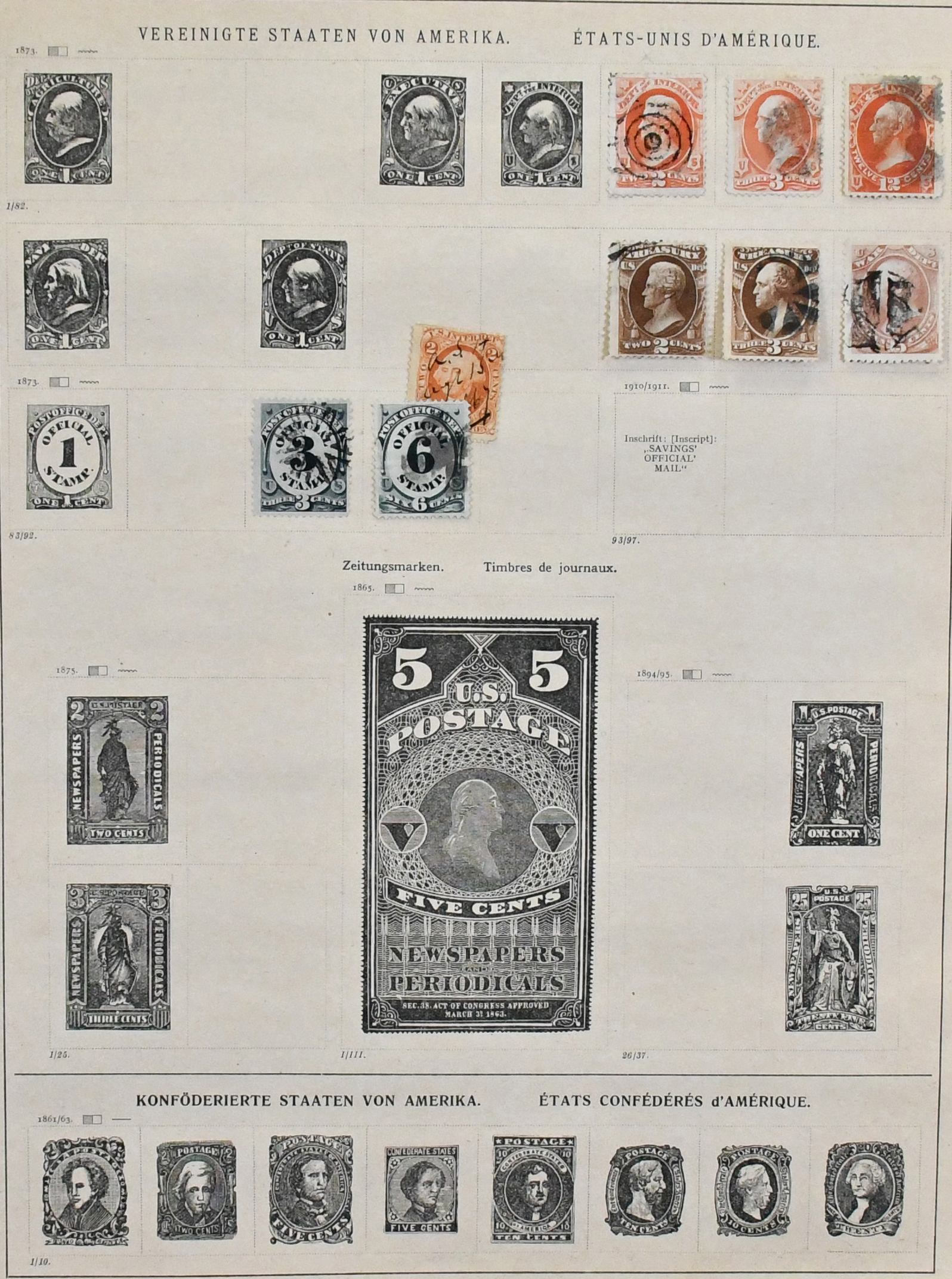 USA, 1851-1890, meist gest. Slg. in untersch. Erhaltung auf alten Goldschnitt-Vordrucken, ab Nr. 4, mit Nr. 11, 19-20, 22, 29, 36W, 36-46, 52, 53-59, 70-71 usw., ferner Zeitungs- und Portomarkenm sowie Dienst mit einigen höheren Wertstufen, zusätzlich viele Ganzsachen-Abschnitte (unbewertet), einiges teils haftend, aber sicher problemlos ablösbar