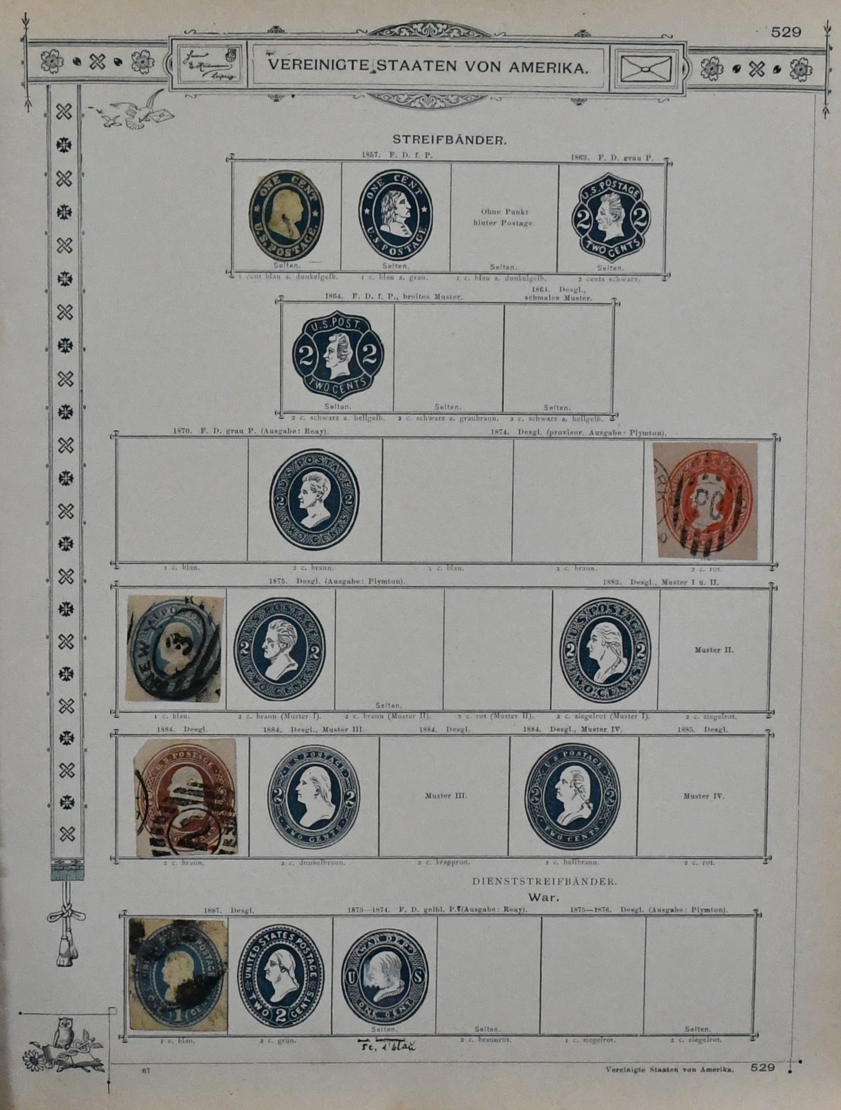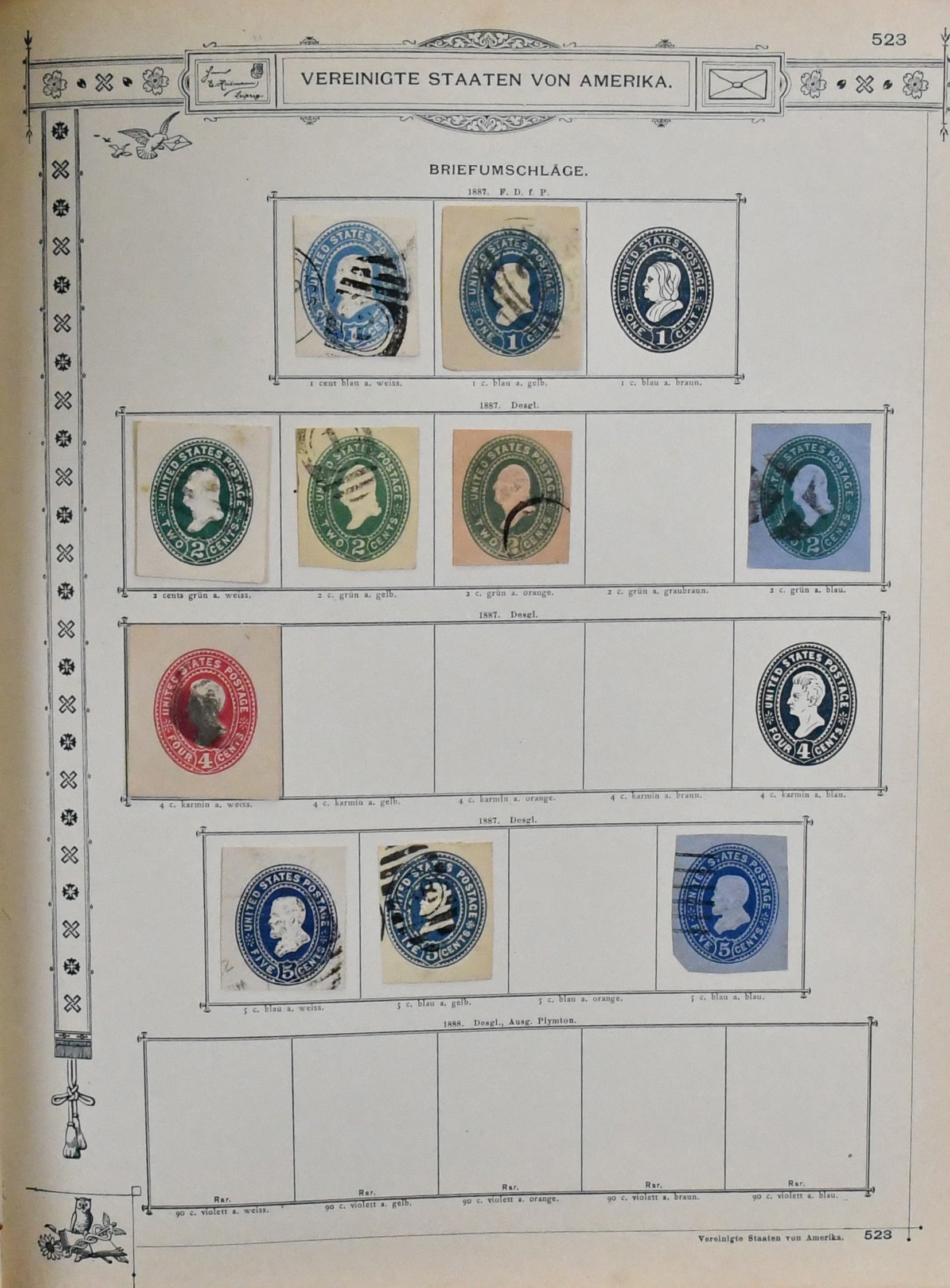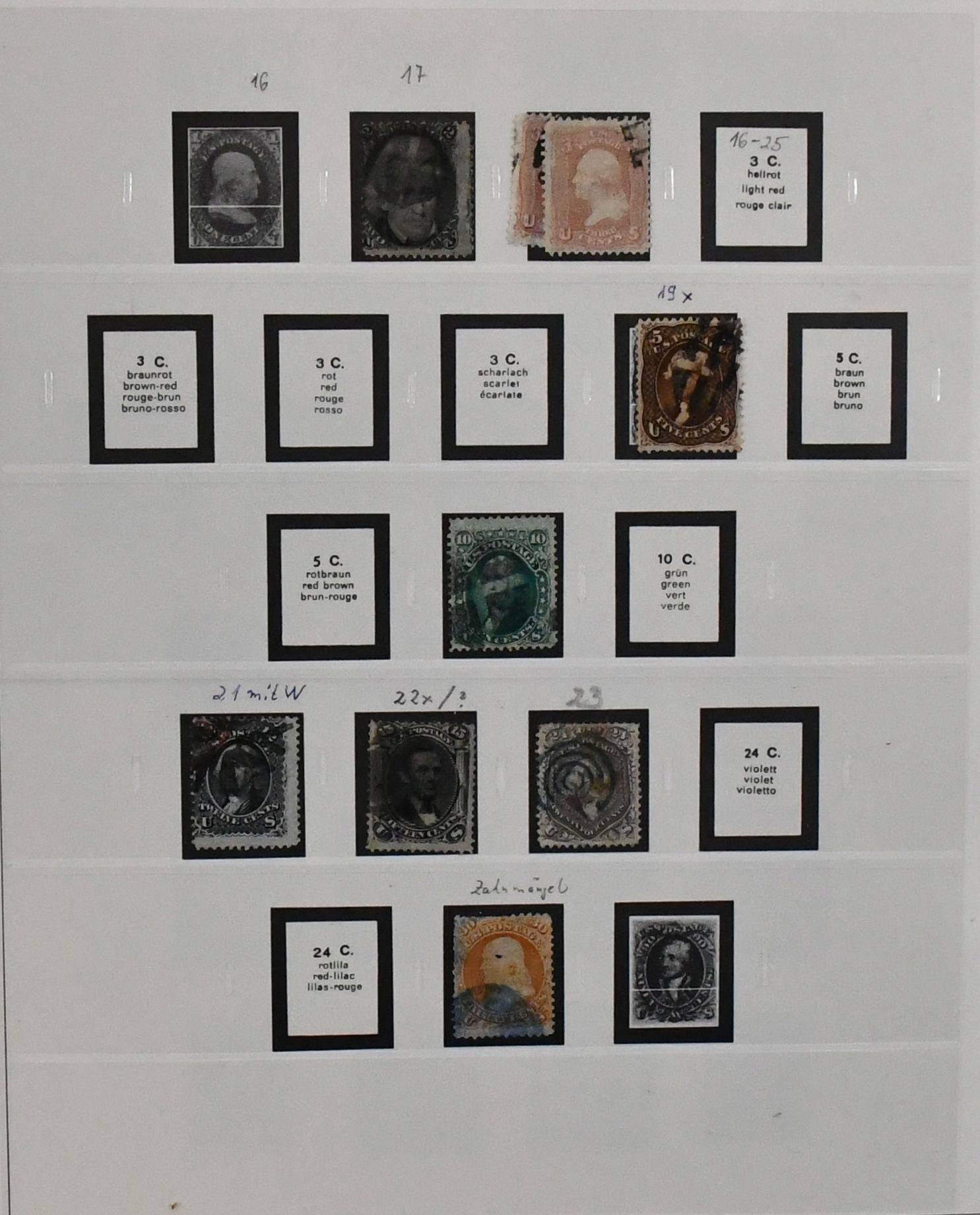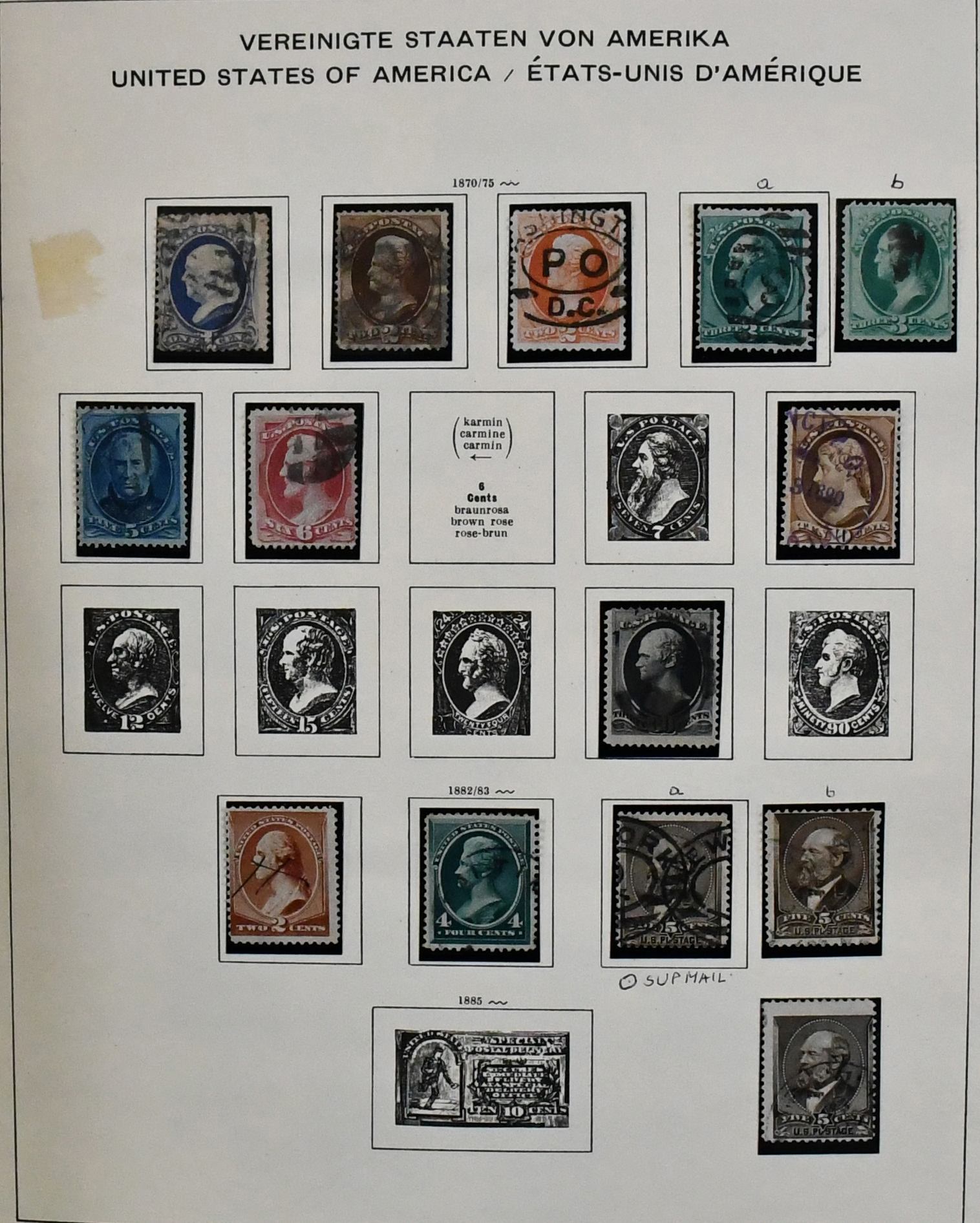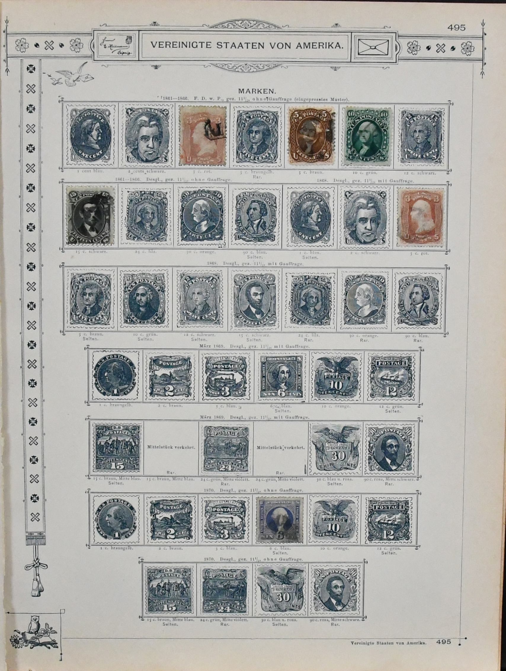 USA, 1851-1890, meist gest. Slg. in untersch. Erhaltung auf alten Goldschnitt-Vordrucken, ab Nr. 4, mit Nr. 11, 19-20, 22, 29, 36W, 36-46, 52, 53-59, 70-71 usw., ferner Zeitungs- und Portomarkenm sowie Dienst mit einigen höheren Wertstufen, zusätzlich viele Ganzsachen-Abschnitte (unbewertet), einiges teils haftend, aber sicher problemlos ablösbar