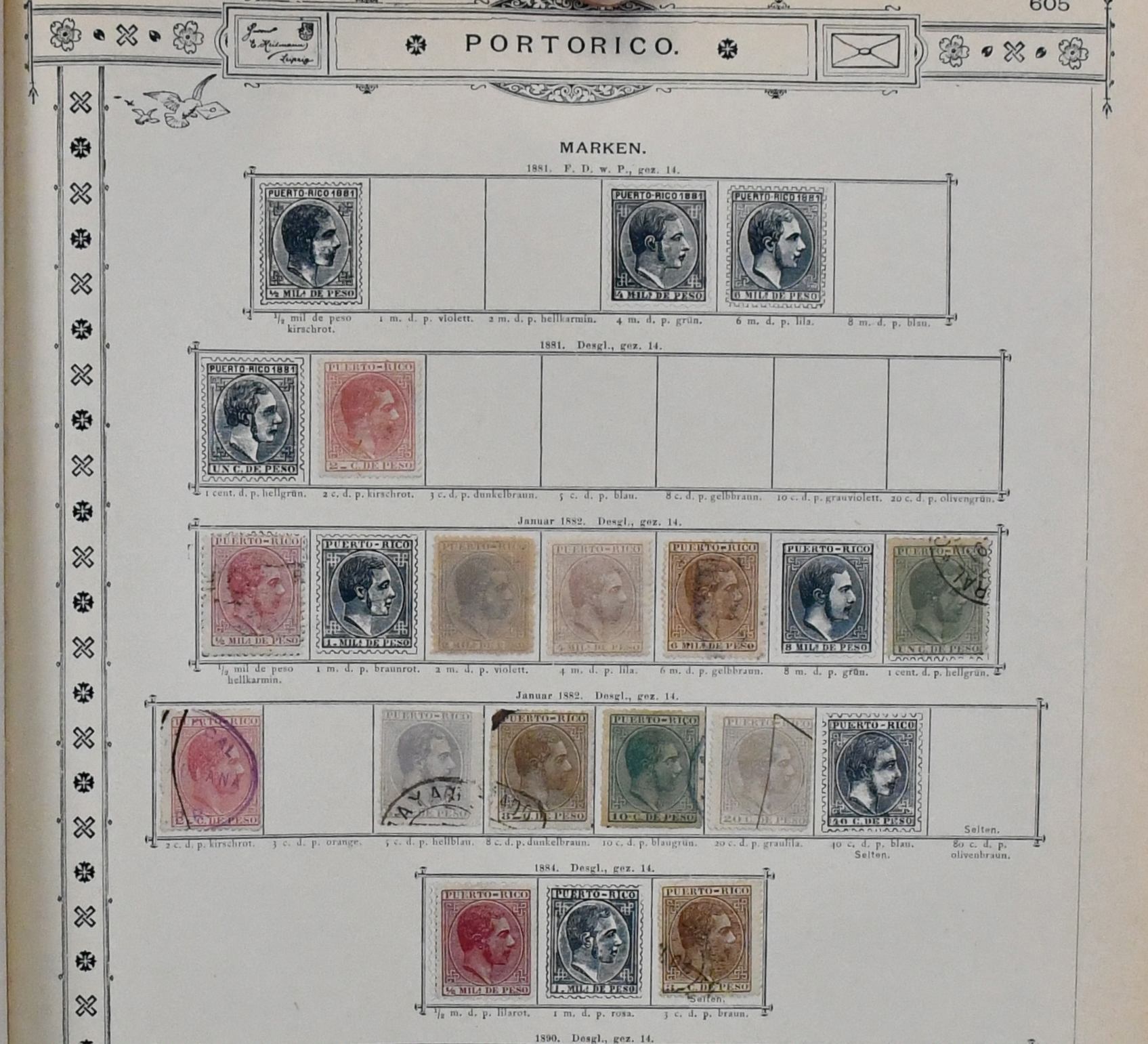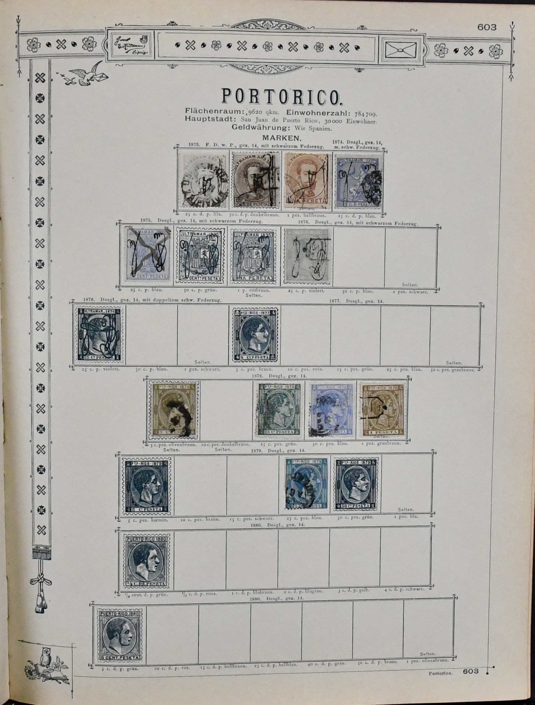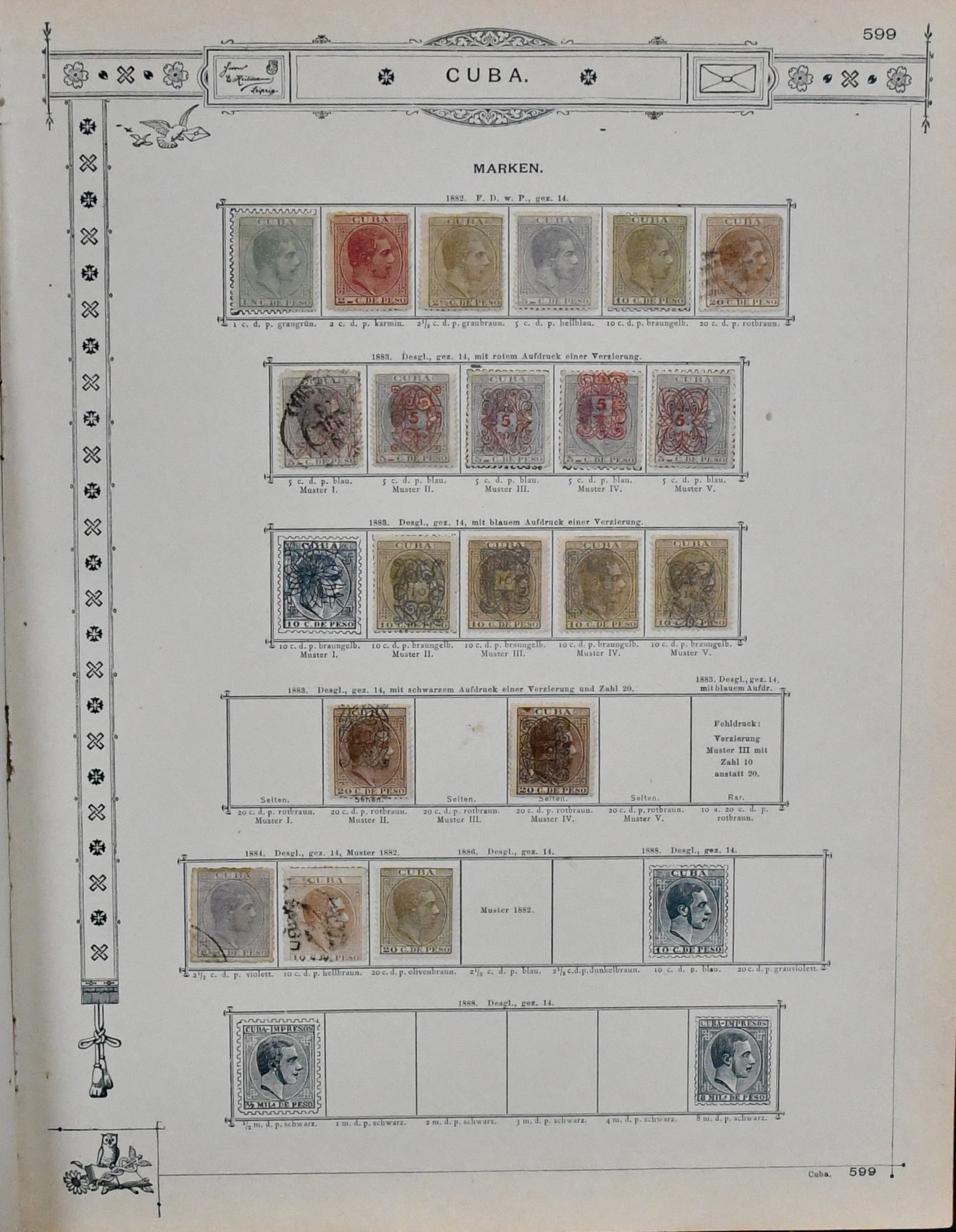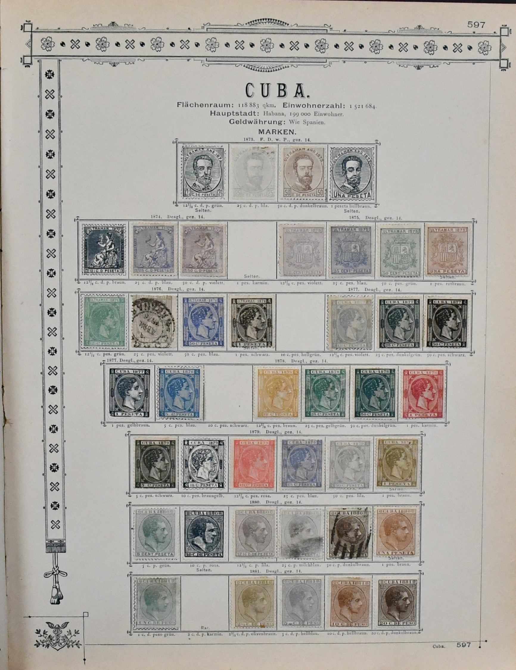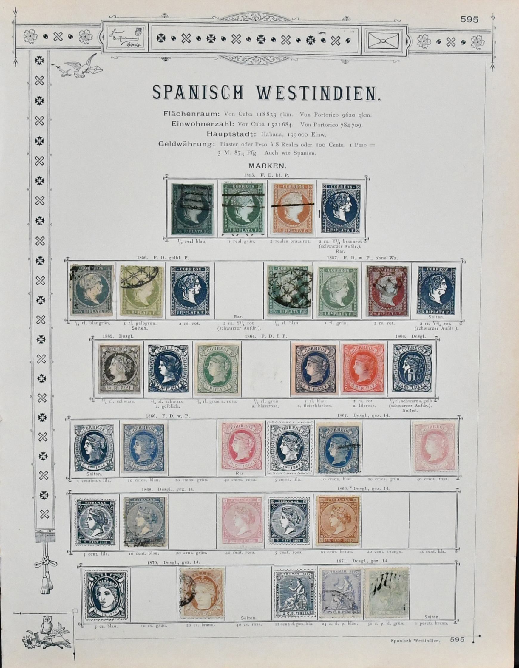 Spanisch-Westindien, Kuba und Puerto Rico, 1855-1888, Slg. in beiden Erhaltungen auf alten Goldschnitt-Vordrucken, beginnend mit Span.-Westindien Nr. 1, Nr. 6 gest., 12 ungebr. usw., Kuba reichhaltig mit u.a. Nr. 21-25, 30 u. 57III/IV je ungebr., sowie Puerto Rico ab Nr. 1-3 gest., Marken teils haftend, aber sicher problemlos ablösbar