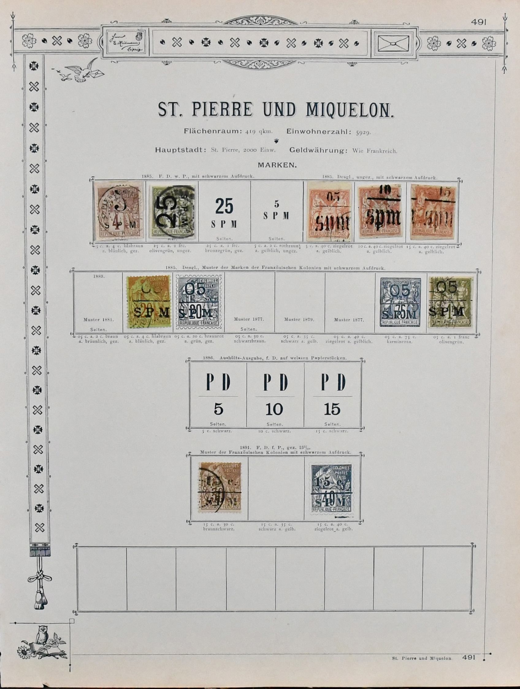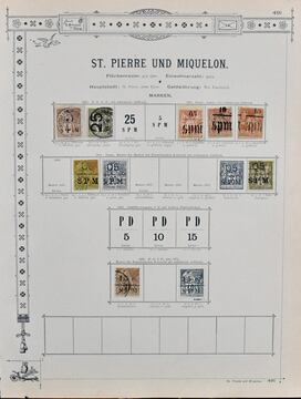 St. Pierre und Miquelon, gest. Slg. auf altem Goldschnitt-Vordr., dabei Nr. 2 auf Briefstück, Nr. 3I mit liegendem Aufdruck (Mi. 3200,-), 4-6, 7 usw. Marken teils haftend, aber sicher problemlos ablösbar