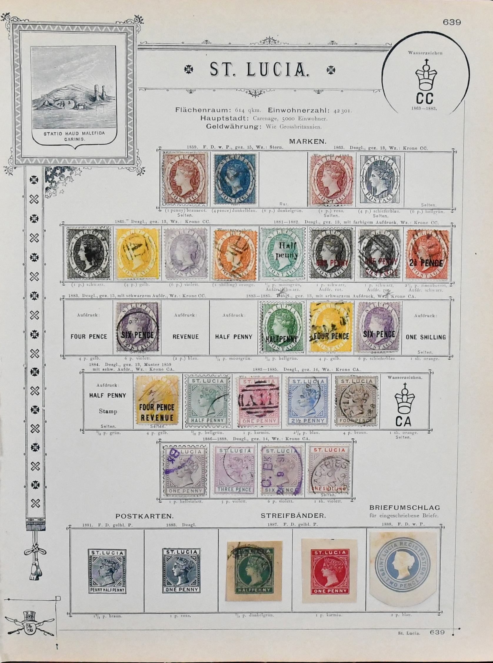 St. Lucia, 1860-1967, ungebr. und gest. Sammlung in etwas untersch. Erhaltung auf Albumseiten, dabei u.a. Nr. 1 ungebr., Nr. 2 gest., 4(2), 5 ungebr., 7(2) ungebr., 8 gest., 9(2) gest., 10(2) gest., 15 gest. etc.