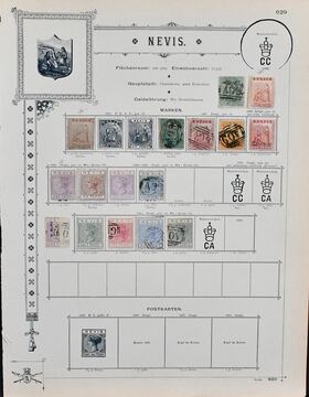 Nevis, 1861-1884, Slg. in beiden Erhaltungen auf altem Goldschnitt-Vordruckblatt, dabei Nr. 4, 6-7, 12-13, 17, 15H auf Briefstück usw., Marken teils haftend, aber sicher ablösbar